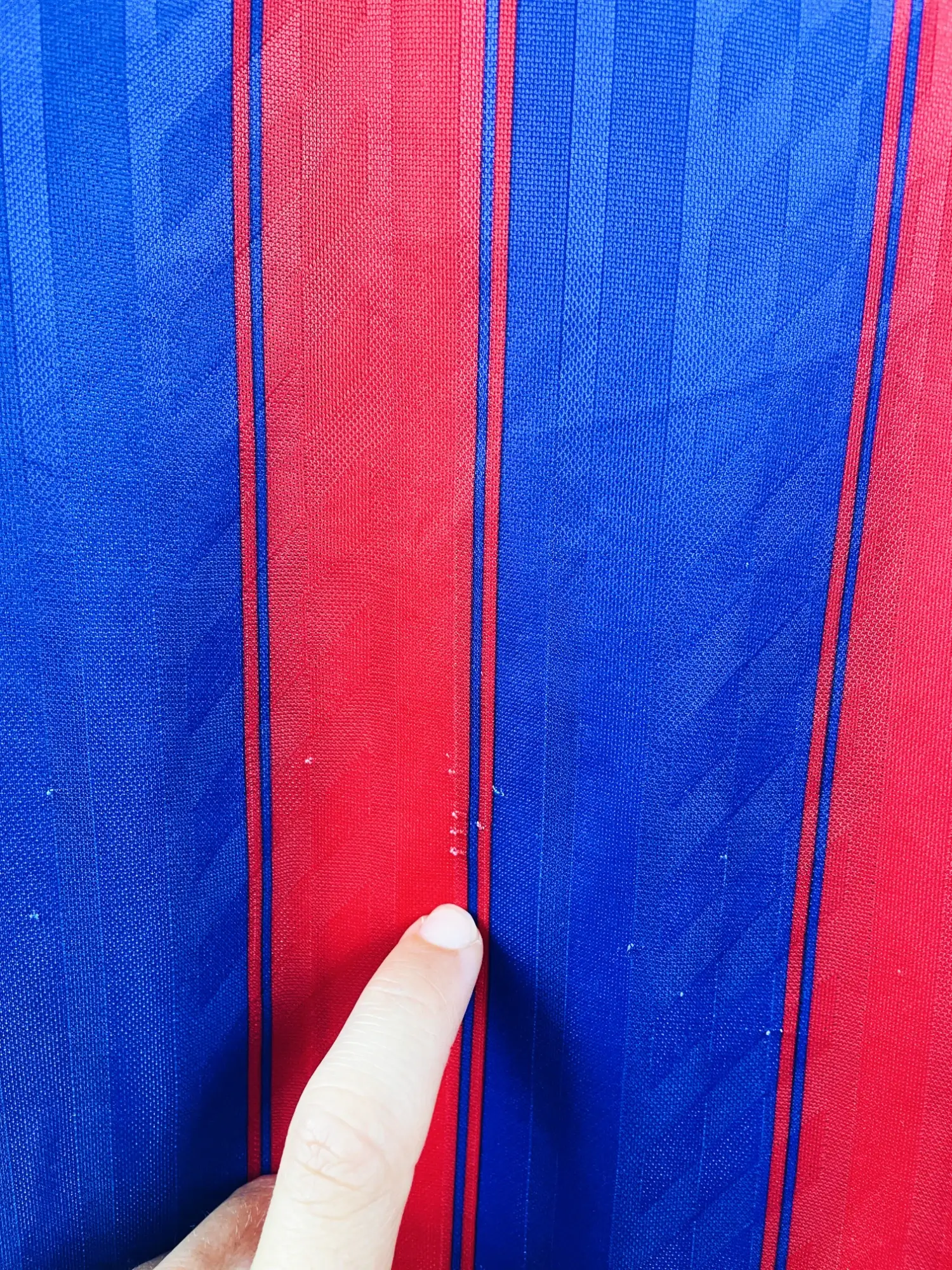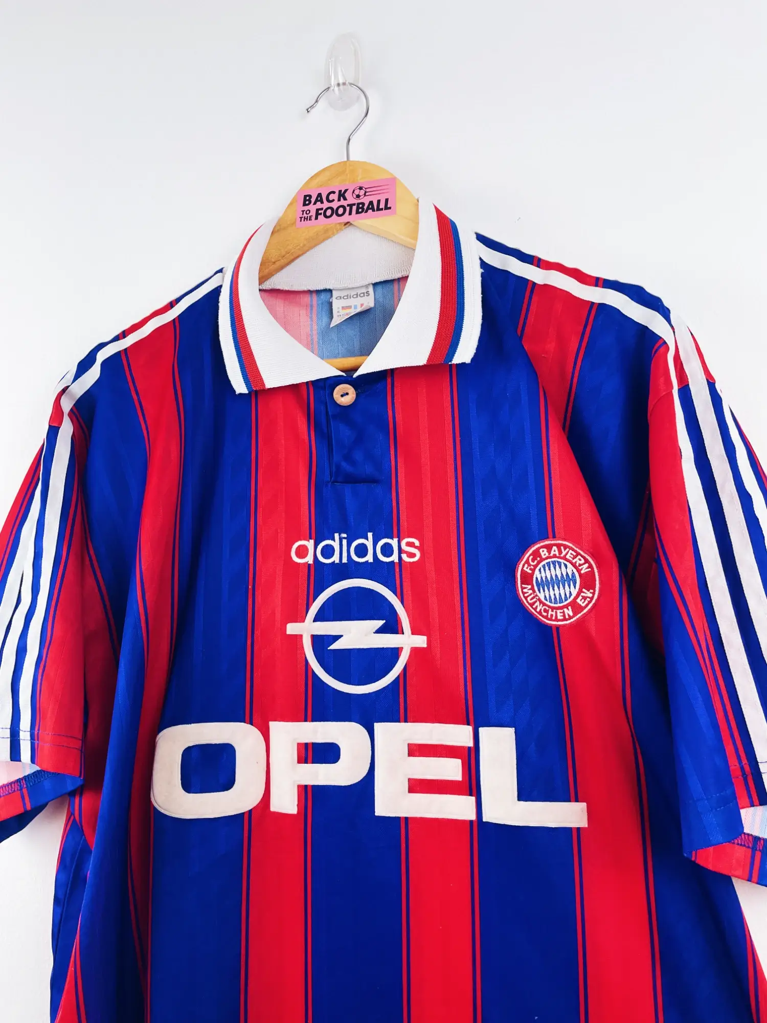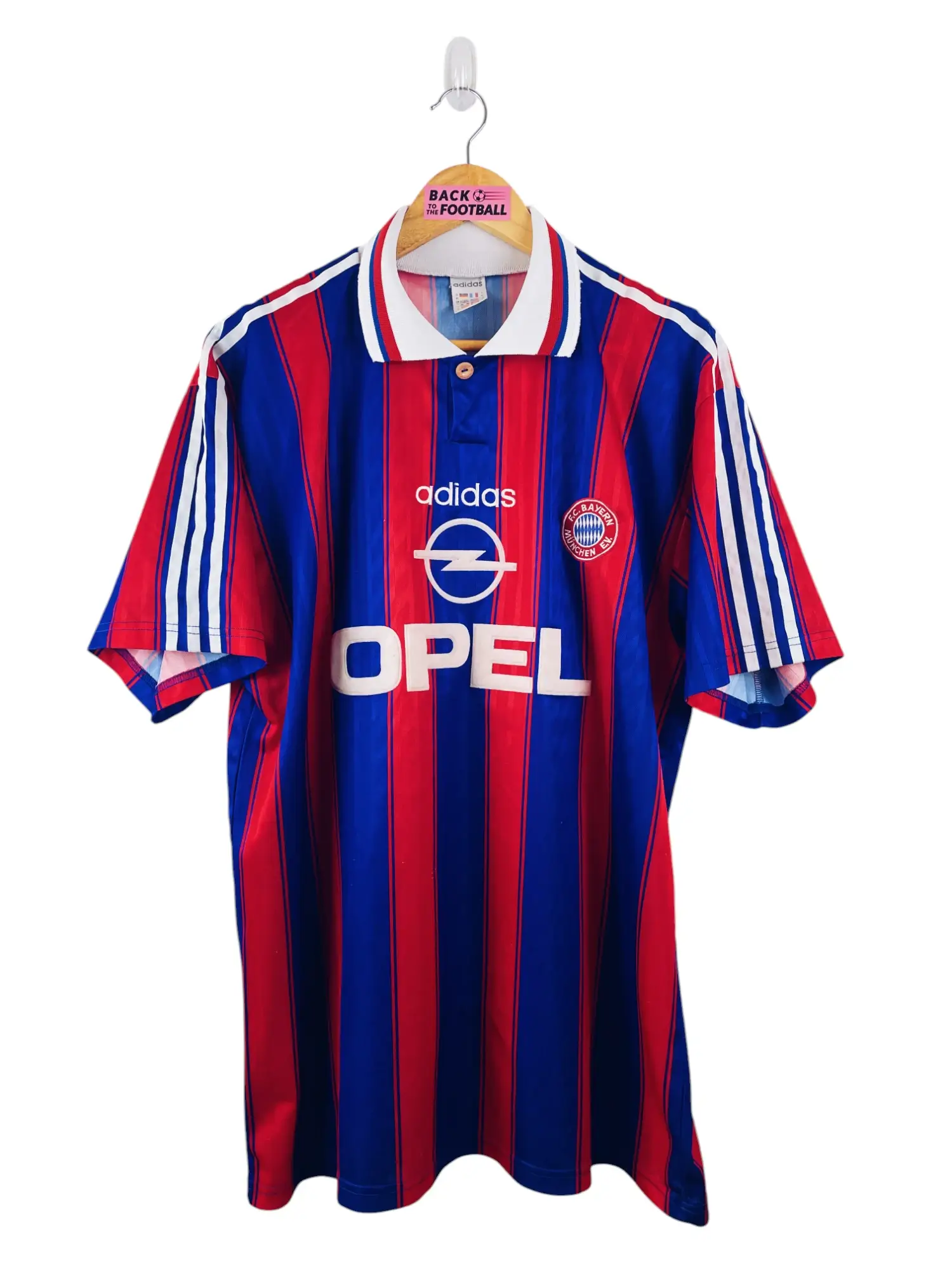 Taille : XL Largeur : 59cm (aisselle à aisselle) Longueur : 78cm (base du col au bas) Si tu veux plus de détails, tu peux nous contacter par mail ou sur les réseaux 😉 Etat : 8.5/10, très bon état, quelques bouloches (voir photo) Le maillot : maillot vintage domicile du Bayern Munich 1995/1997. L’écusson du club et le logo Adidas sont brodés, le sponsor Opel est en feutrine. Très beau maillot rétro du Bayern Munich ! Histoire : les bavarois termineront le championnat à la deuxième place la première saison, derrière le Borussia Dortmund. Ils gagneront la coupe de…