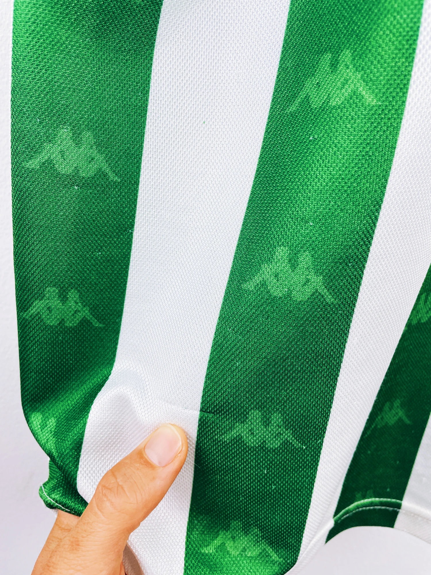 Taille : L Largeur : 57cm (aisselle à aisselle) Longueur : 72cm (base du col au bas) Si tu veux plus de détails, tu peux nous contacter par mail ou sur les réseaux 😉 Etat : 8.5/10, excellent état, quelques légers accrocs. Curiosité : le logo Real Betis au niveau du col n’a pas été centré, erreur de fabrication (voir photos) Le maillot : maillot vintage domicile du Betis Séville 1995/1997. L’écusson et le logo Kappa sont brodés. On peut voir le logo Kappa en tramé sur tout le maillot et sur les manches. Très beau maillot rétro du Real…