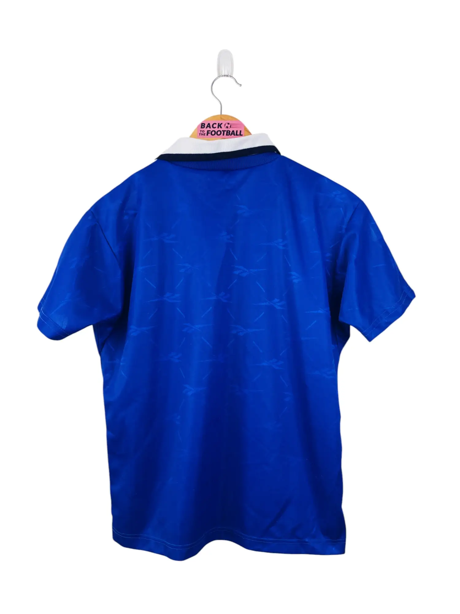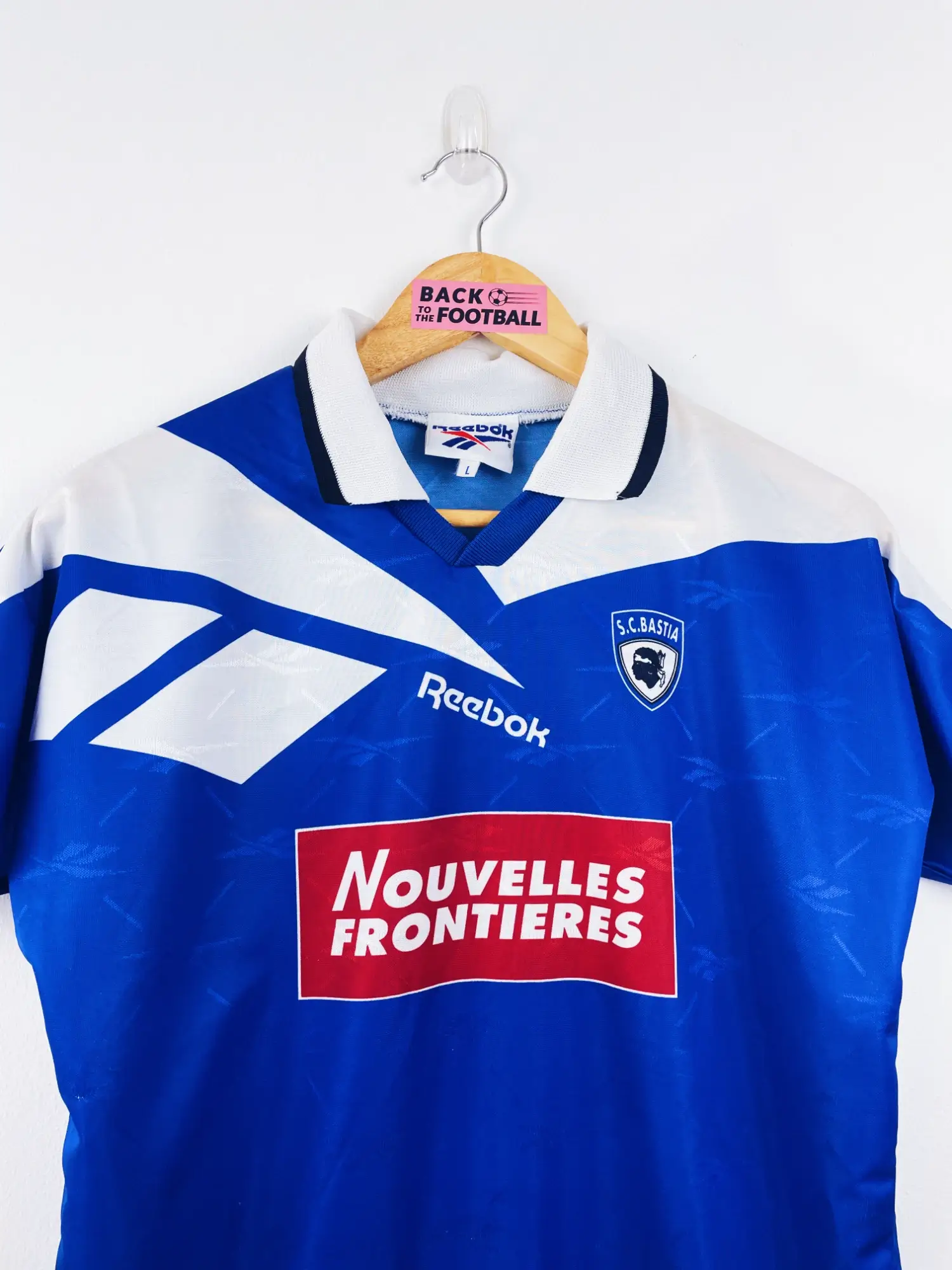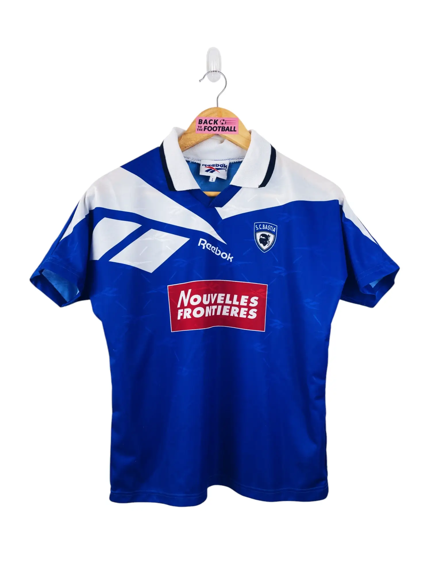 Taille : L enfant Largeur : 47cm (aisselle à aisselle) Longueur : 58cm (base du col au bas) Si tu veux plus de détails, tu peux nous contacter par mail ou sur les réseaux 😉 Etat : 9/10, excellent état Le maillot : maillot vintage domicile du SC Bastia 1995/1997. L’écusson, le logo Reebok et le sponsor sont incrustés directement au maillot. Très beau maillot rétro du SC Bastia ! Histoire : La première saison, les corses coachés par Antonetti terminent à la quinzième place de Ligue 1 et arrivent à se maintenir avec 6 points d’avance sur le premier…