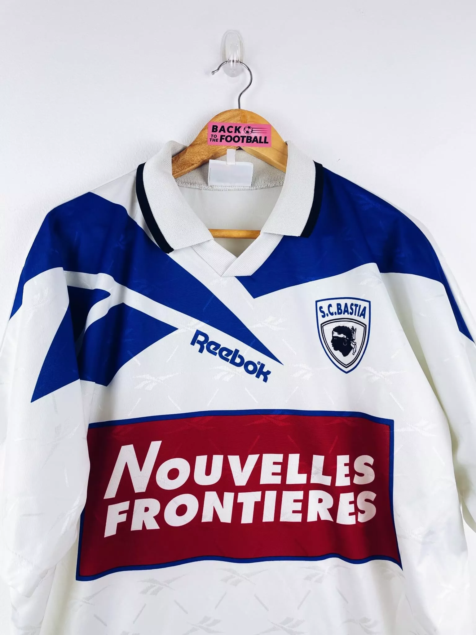 Taille : L mais taille oversize Largeur 57 (aisselle à aisselle) Longueur : 77cm (base du col au bas) Si tu veux plus de détails, tu peux nous contacter par mail ou sur les réseaux 😉 Etat : 9/10, excellent état Le maillot : maillot vintage extérieur du SC Bastia 1995/1997. L’écusson, le logo Reebok et le sponsor sont incrustés directement au maillot. Très beau maillot rétro du SC Bastia ! Histoire : La première saison, les corses coachés par Antonetti terminent à la quinzième place de Ligue 1 et arrivent à se maintenir avec 6 points d’avance sur le…