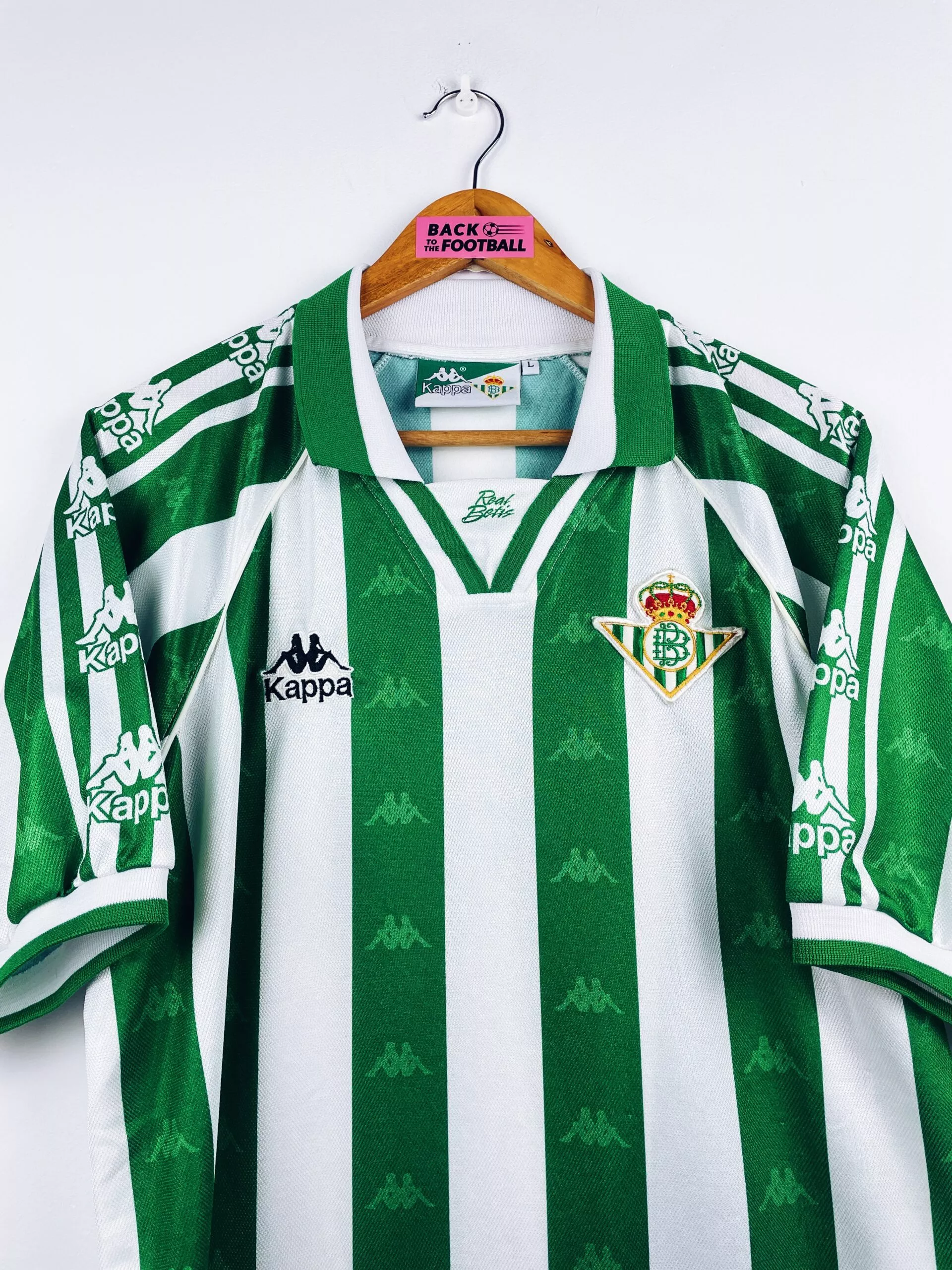 Taille : L Si tu veux plus de détails, tu peux nous contacter par mail ou sur les réseaux 😉 Etat : 8.5/10, excellent état, quelques légères bouloches (voir photo) Le maillot : maillot vintage domicile du Betis Séville 1995/1997. L’écusson et le logo Kappa sont brodés. On peut voir le logo Kappa en tramé sur tout le maillot et sur les manches. Très beau maillot rétro du Real Betis ! Histoire : la première saison, le Betis termine à la 8ème place de Liga. Les Andalous seront éliminés rapidement en Coupe du Roi face à l’Atlético Madrid, futur vainqueur.…