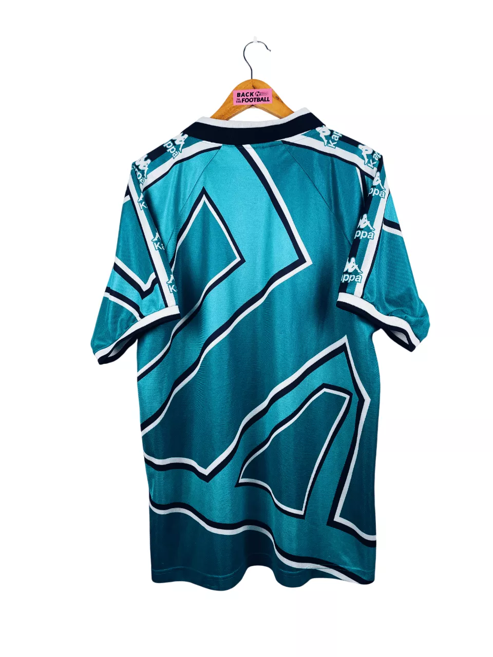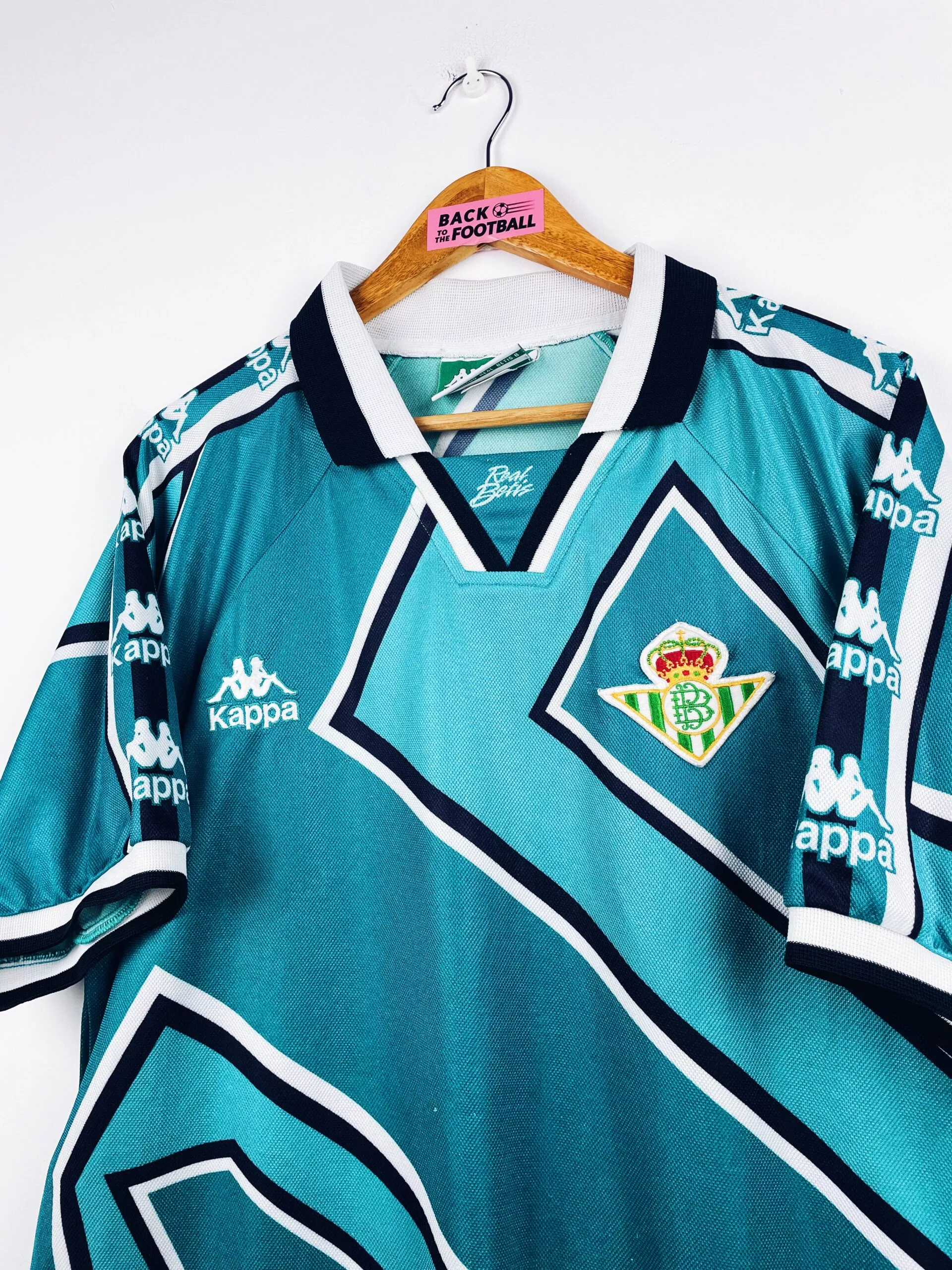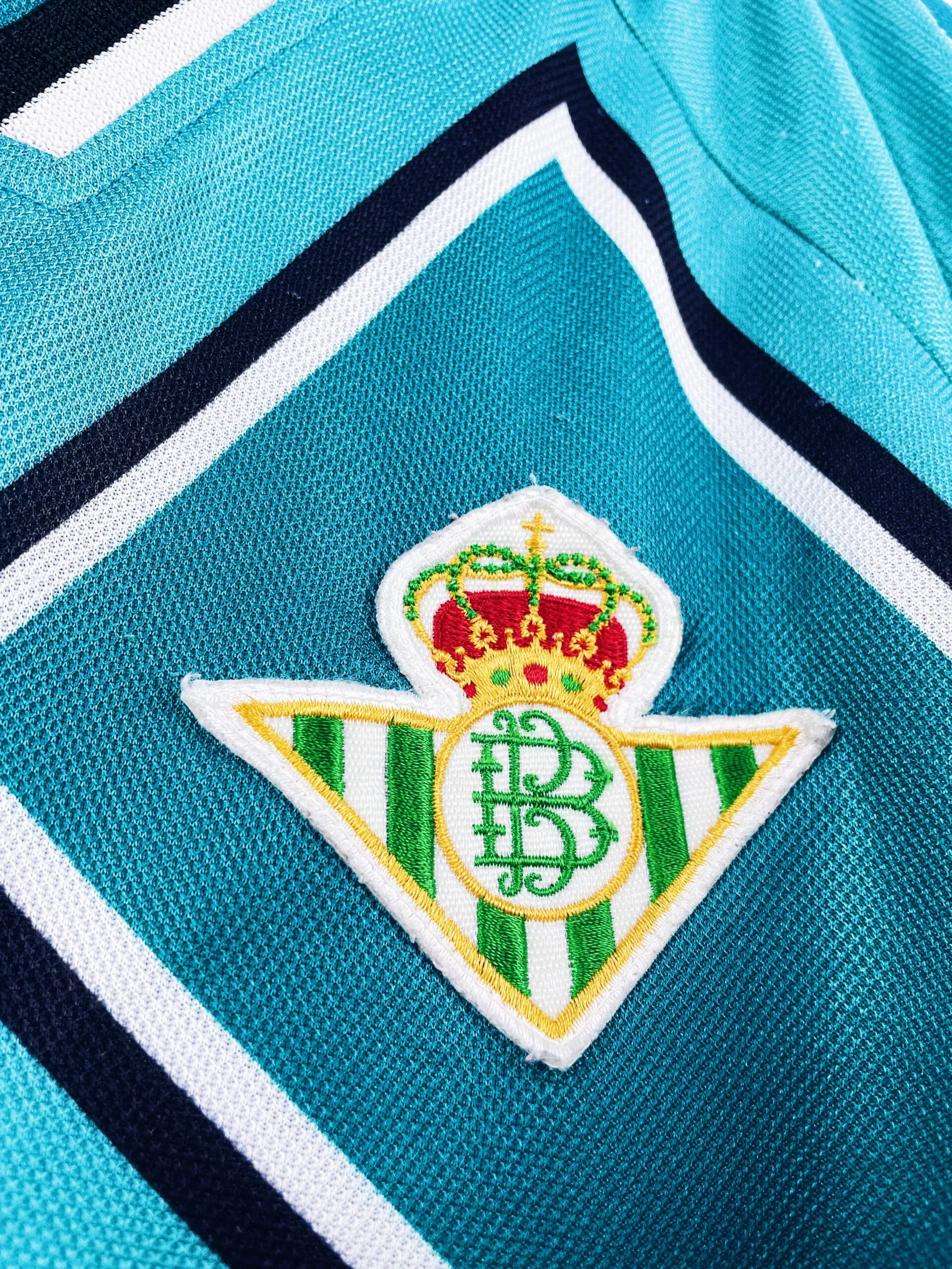 Taille : XL Si tu veux plus de détails, tu peux nous contacter par mail ou sur les réseaux 😉 Etat : 8/10, très bon état, mini accroc (voir photo) Le maillot : maillot vintage extérieur du Betis Séville 1995/1997. L’écusson et le logo Kappa sont brodés. Le design est magnifique. Très beau maillot rétro du Real Betis ! Histoire : la première saison, le Betis termine à la 8ème place de Liga. Les Andalous seront éliminés rapidement en Coupe du Roi face à l’Atlético Madrid, futur vainqueur. En Coupe UEFA, le Betis tombera en huitième de finale contre les…