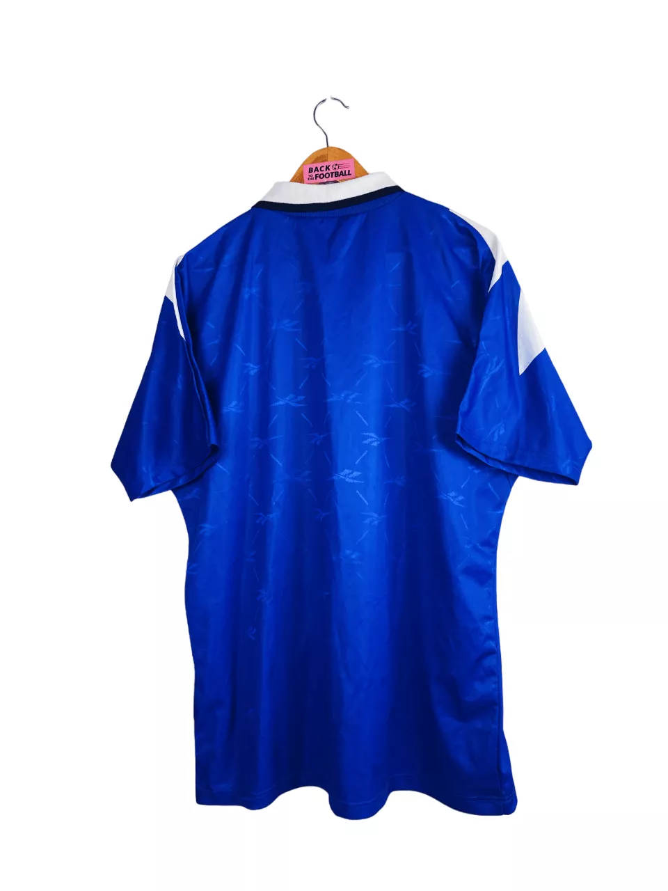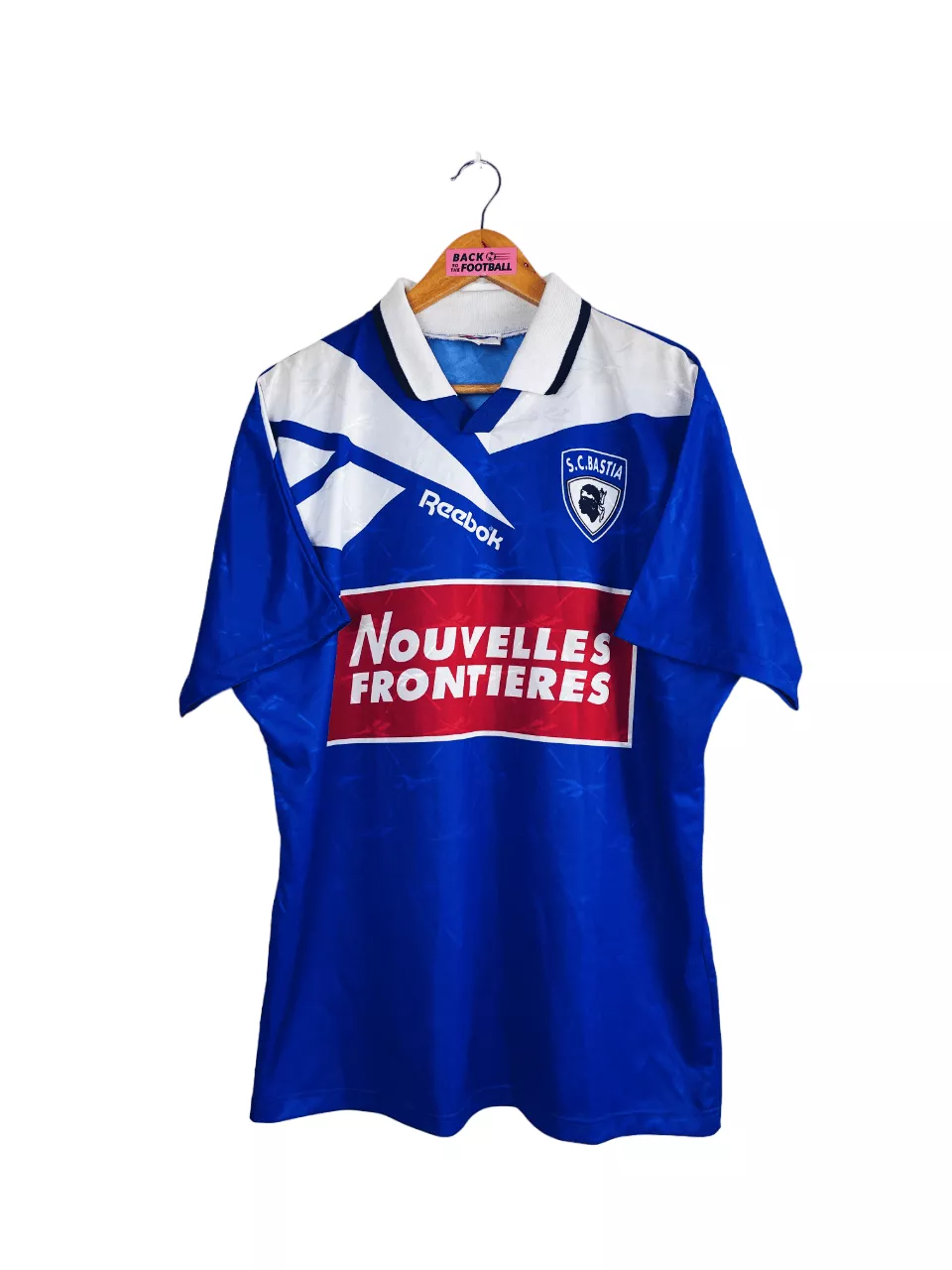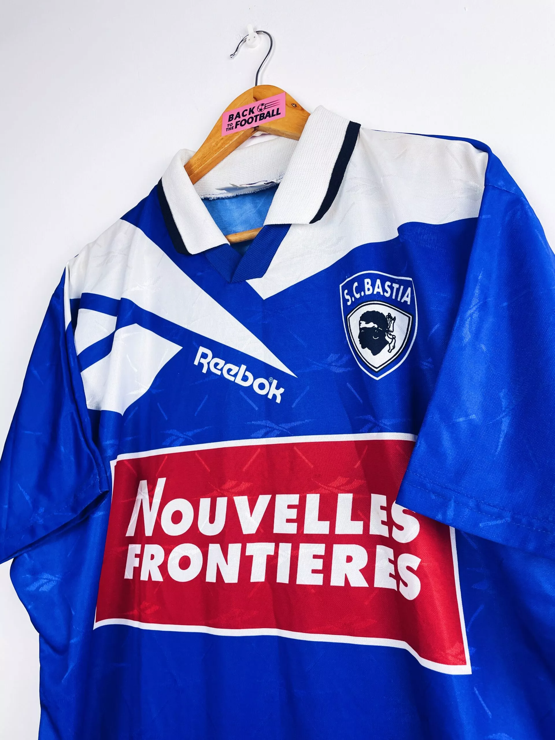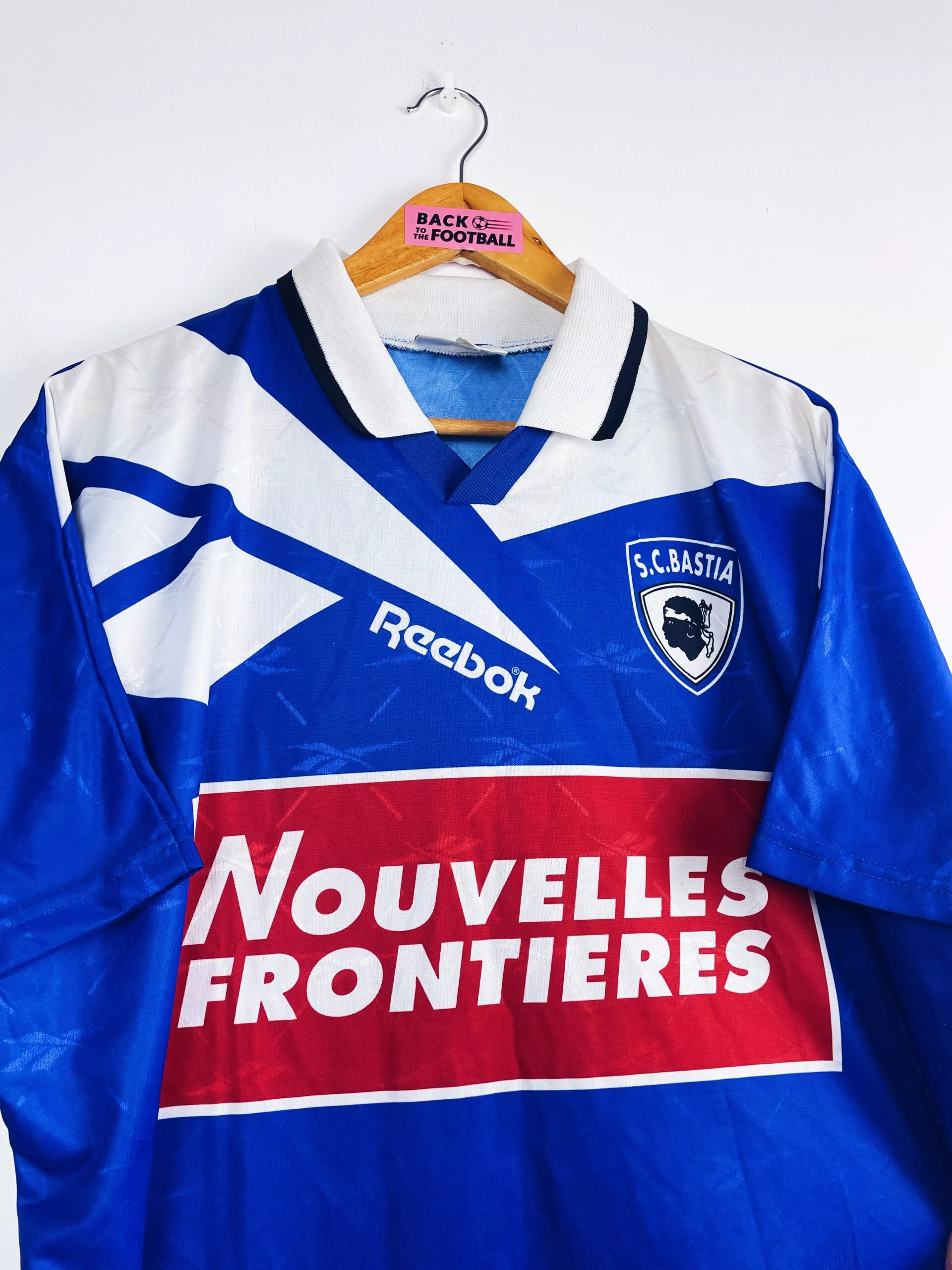 Taille : M Si tu veux plus de détails, tu peux nous contacter par mail ou sur les réseaux 😉 Etat : 8/10, très bon état, quelques légères bouloches Le maillot : maillot vintage du SC Bastia saisons 1995/1997. L’écusson, le logo Reebok et le sponsor sont incrustés directement au maillot. Très beau maillot rétro du SC Bastia ! Histoire : La première saison, les corses coachés par Antonetti terminent à la quinzième place de Ligue 1 et arrivent à se maintenir avec 6 points d’avance sur le premier reléguable. Ils se feront éliminer très rapidement en coupes. Bastia fait…