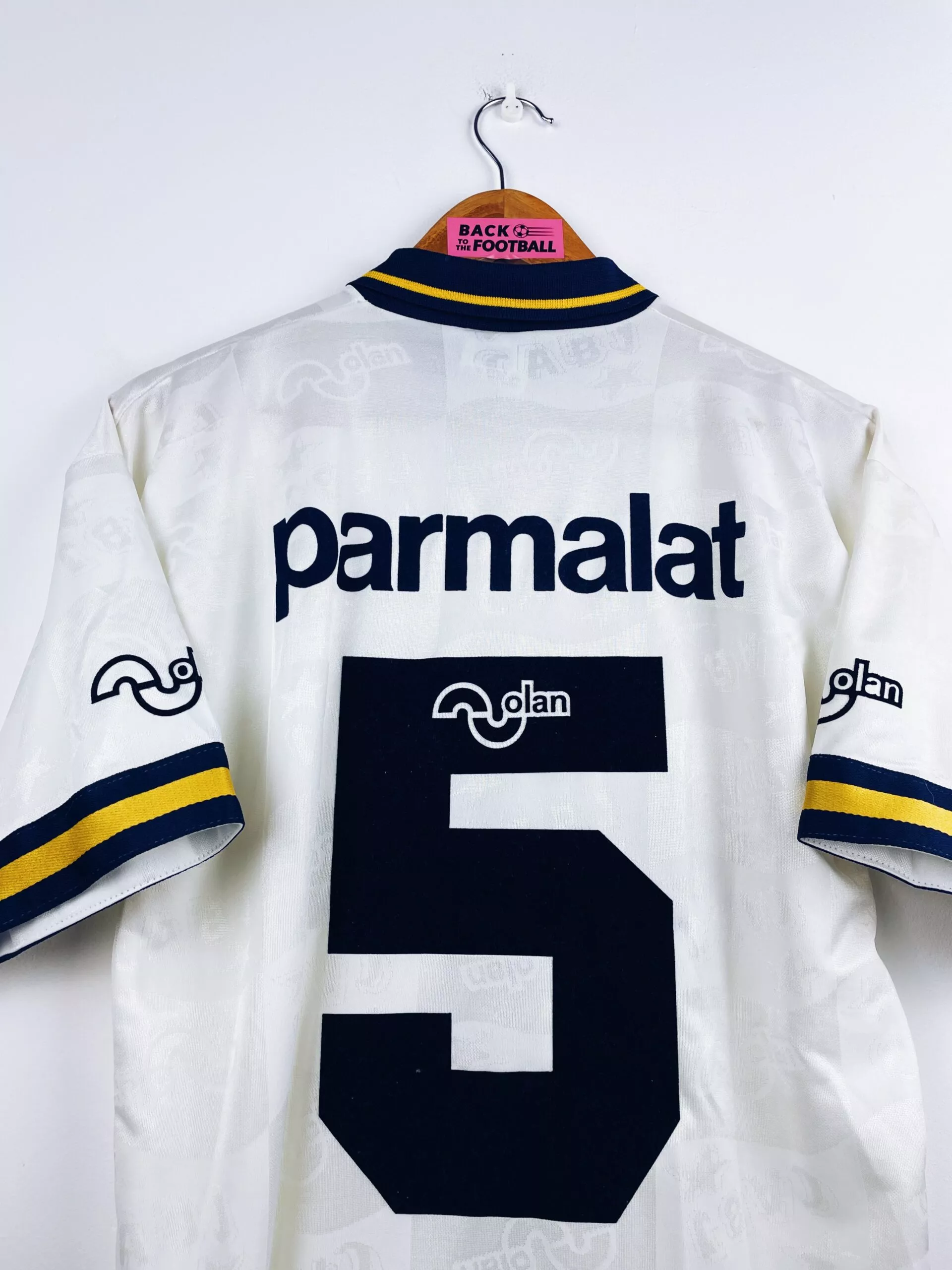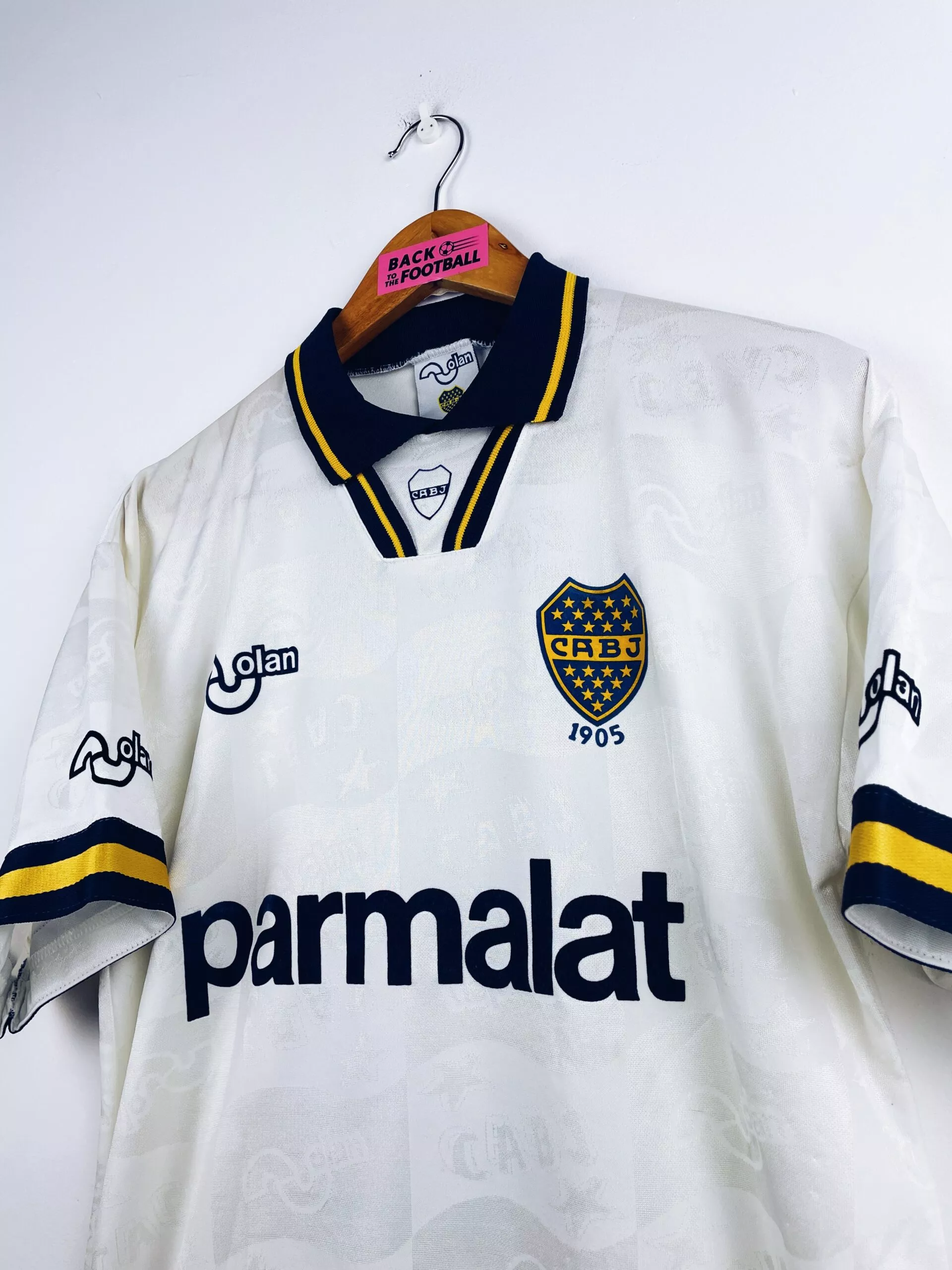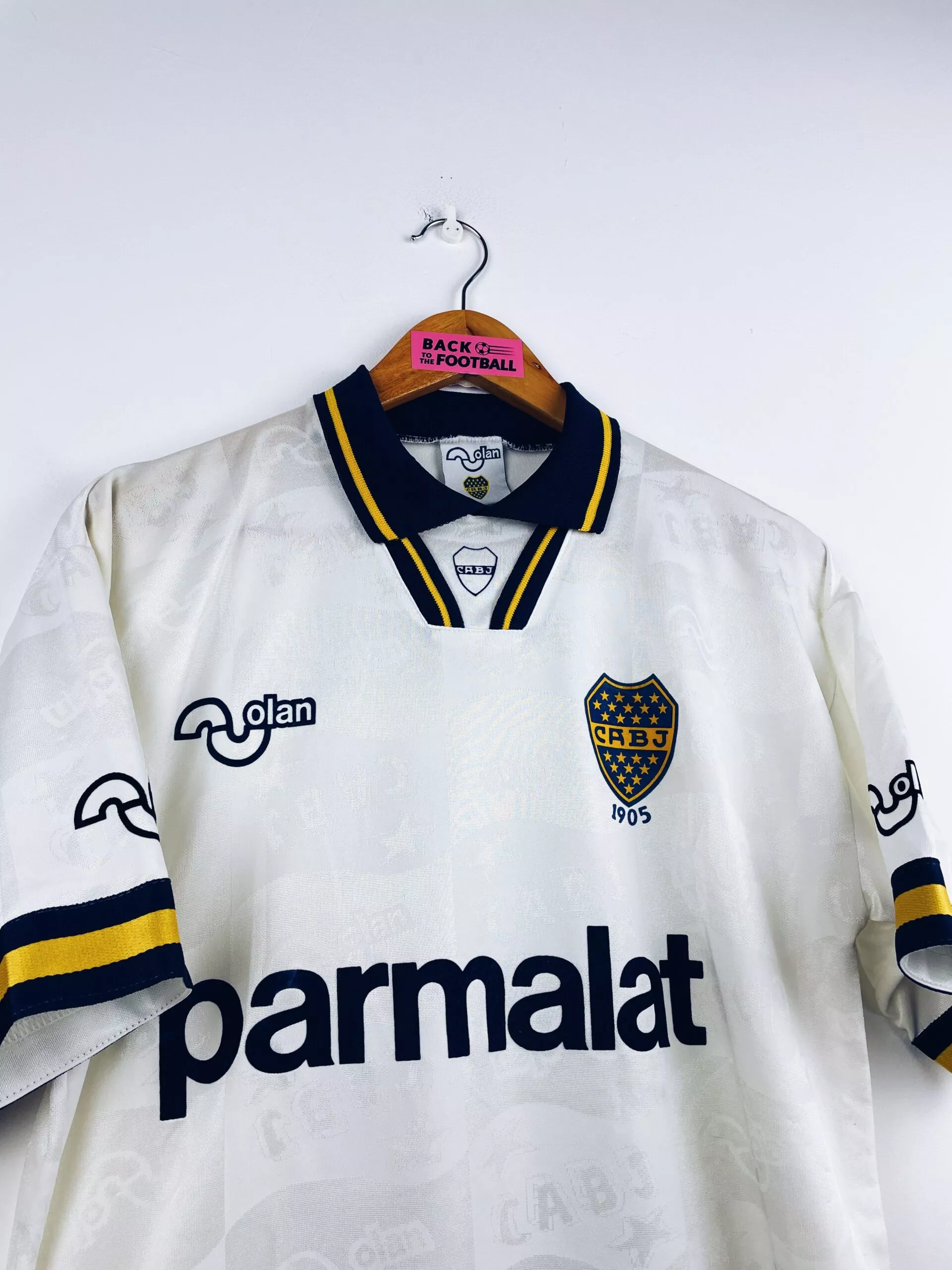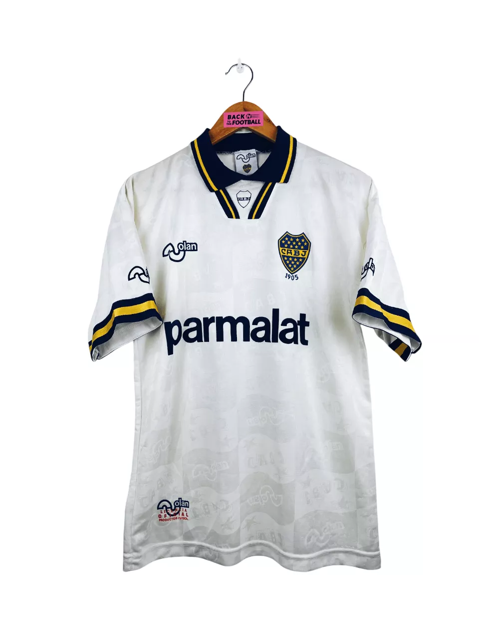 Taille : M Largeur : 50cm (aisselle à aisselle) Longueur : 67cm (base du col au bas) Si tu veux plus d’infos, tu peux nous contacter par mail ou sur les réseaux 😉 Etat : 8.5/10, excellent état Le maillot : maillot vintage extérieur du Boca Juniors 1995/1996 pour les 90 ans du club. L’écusson, le logo Olan, les sponsors Parmalat et le numéro 5 sont en feutrine. On peut voir en tramé le logo Olan et l’écusson. Très beau maillot rétro de Boca Juniors ! Histoire : cette saison marque le retour au club de Diego Maradona. Le Boca…