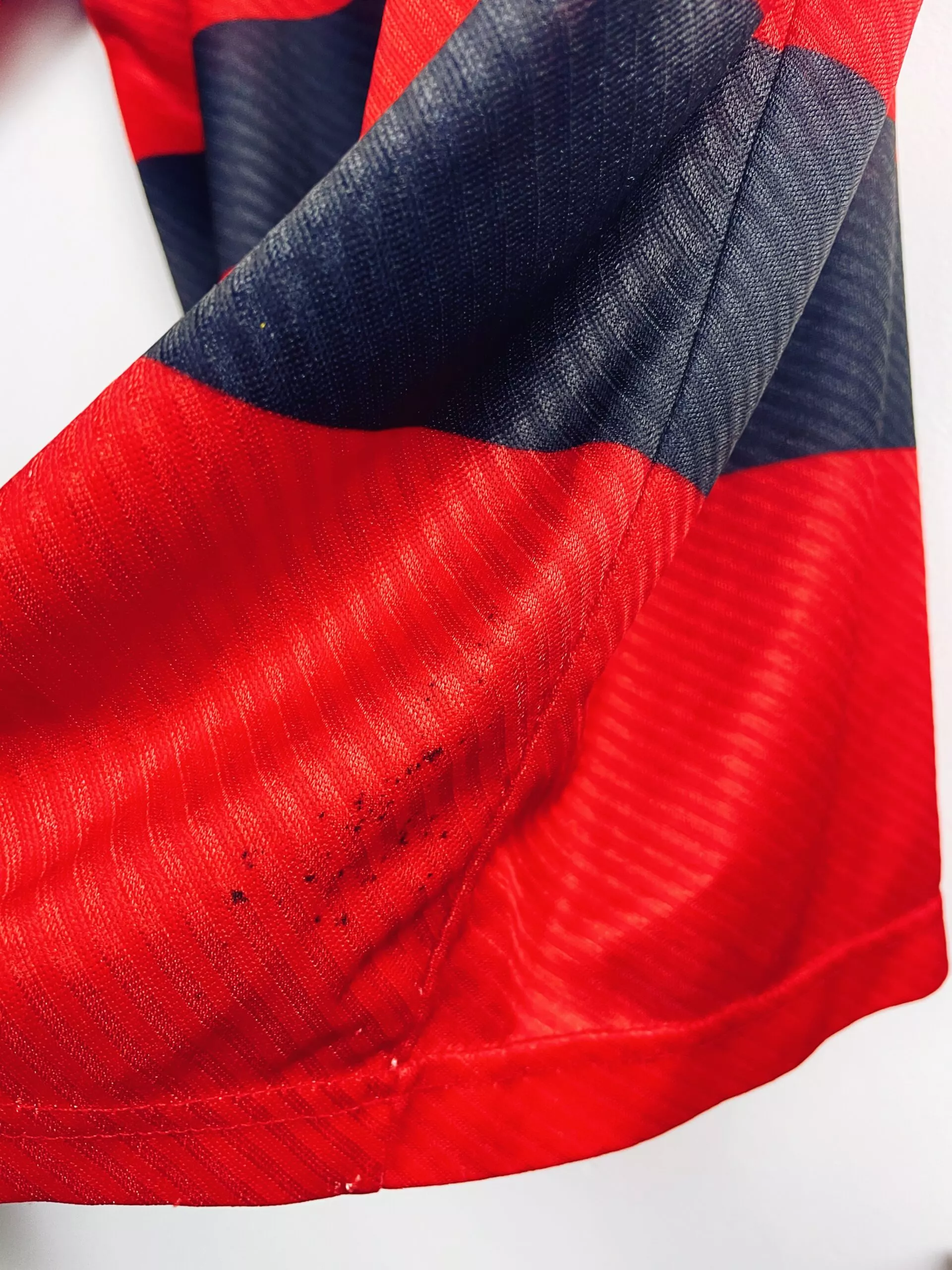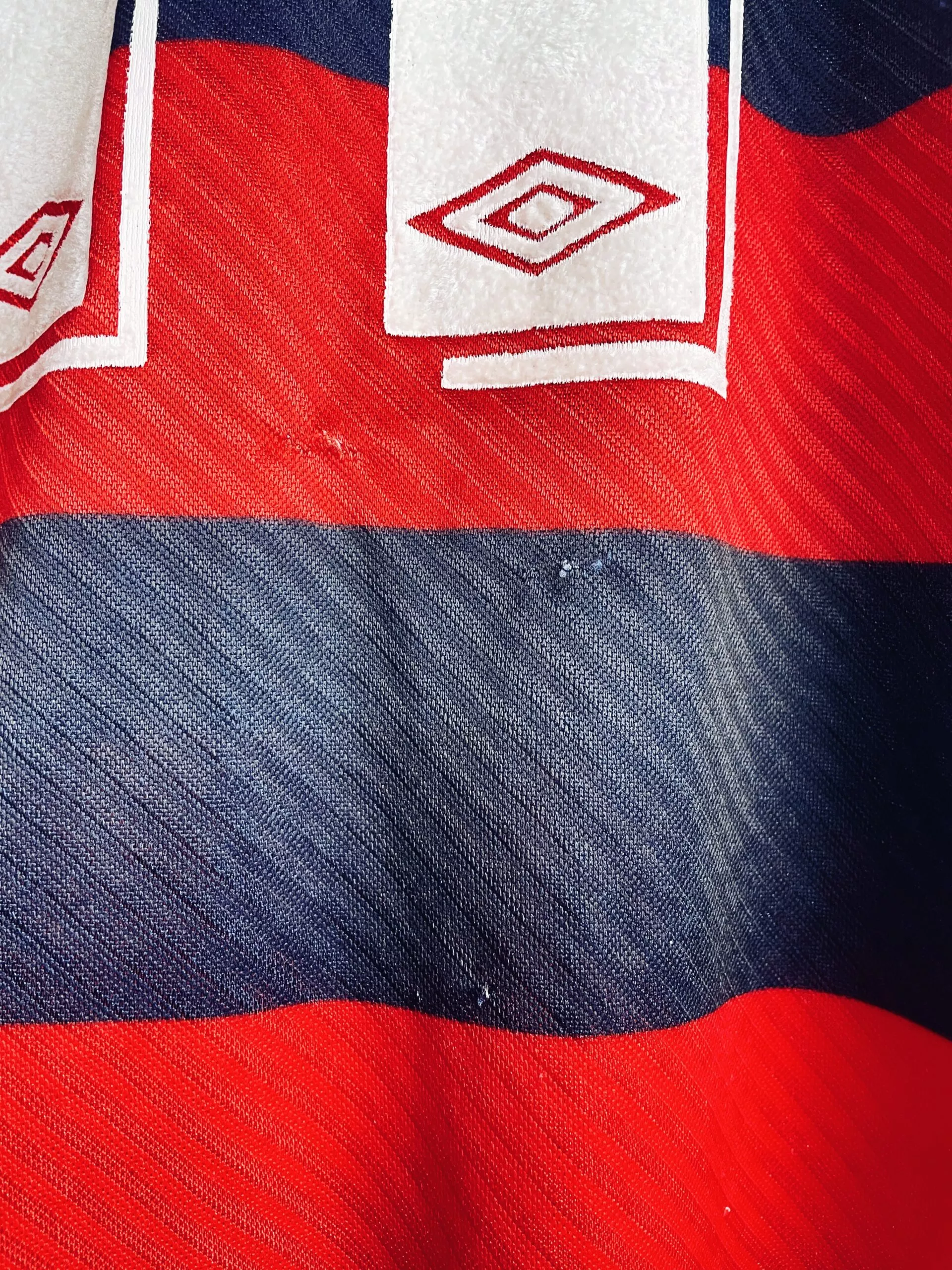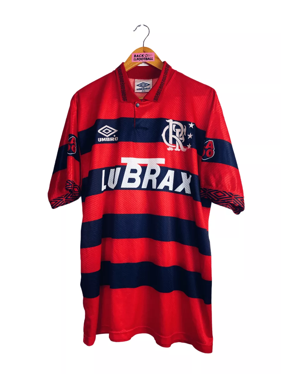Taille : XL Etat : 7/10, très bon état mais des petites taches noires en bas du maillot et des légers accros (voir photos) Le maillot : maillot vintage de Flamengo spécial Centenaire, floqué du numéro 11 Romario. L’écusson de Flamengo, le logo Umbro et le flocage de Romario sont en feutrine. Le sponsor Lubrax est incrusté. Le logo du centenaire sur les manches est incrusté aussi. Joli maillot rétro de Flamengo ! Histoire : après 2 saison au FC Barcelone, Romario revient sur ses terres natales et s’engage avec Flamengo. Il marquera 68 buts sur 79 matchs joués !…