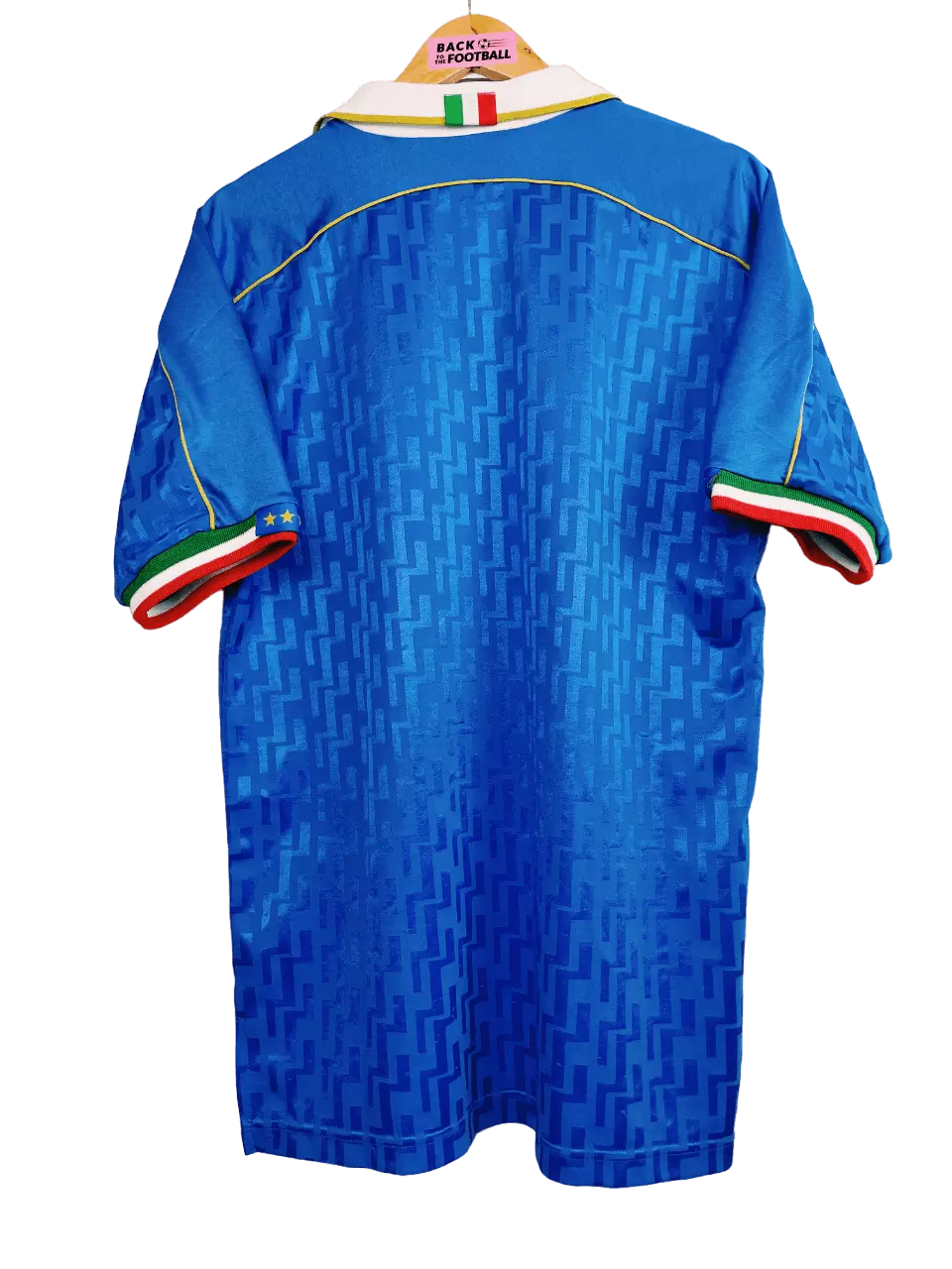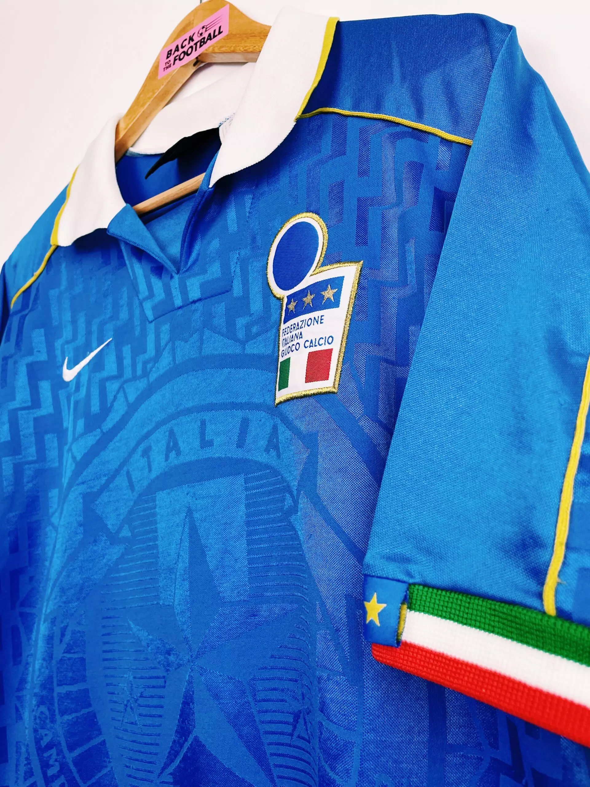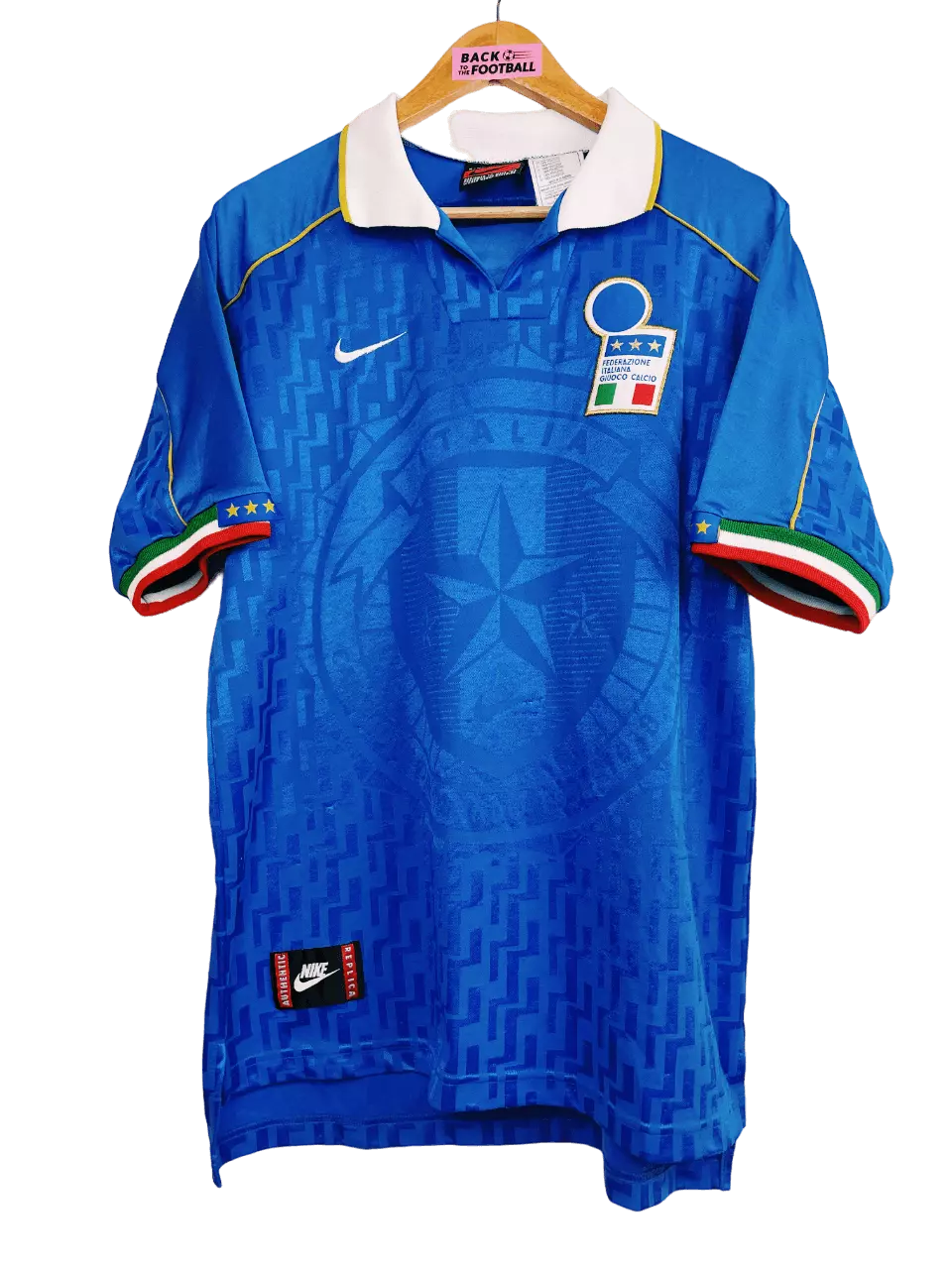 Taille : M Etat : 7.5/10, très bon état, mais quelques bouloches à signaler Le maillot : maillot vintage de l’Italie 1995/1996. L’écusson et le logo Nike sont brodés. Le design en tramé sur tout le maillot est magnifique. On peut voir sur les manches vertes, blanches et rouges, les 3 étoiles de la Squadra Azzurra. Un rare maillot rétro de l’Italie. Histoire : l’Italie utilisera ce maillot pour les qualifications de l’Euro 1996. Quelques joueurs : Baggio, Maldini, Ravanelli, Simone, Del Piero, Zola, Conte…