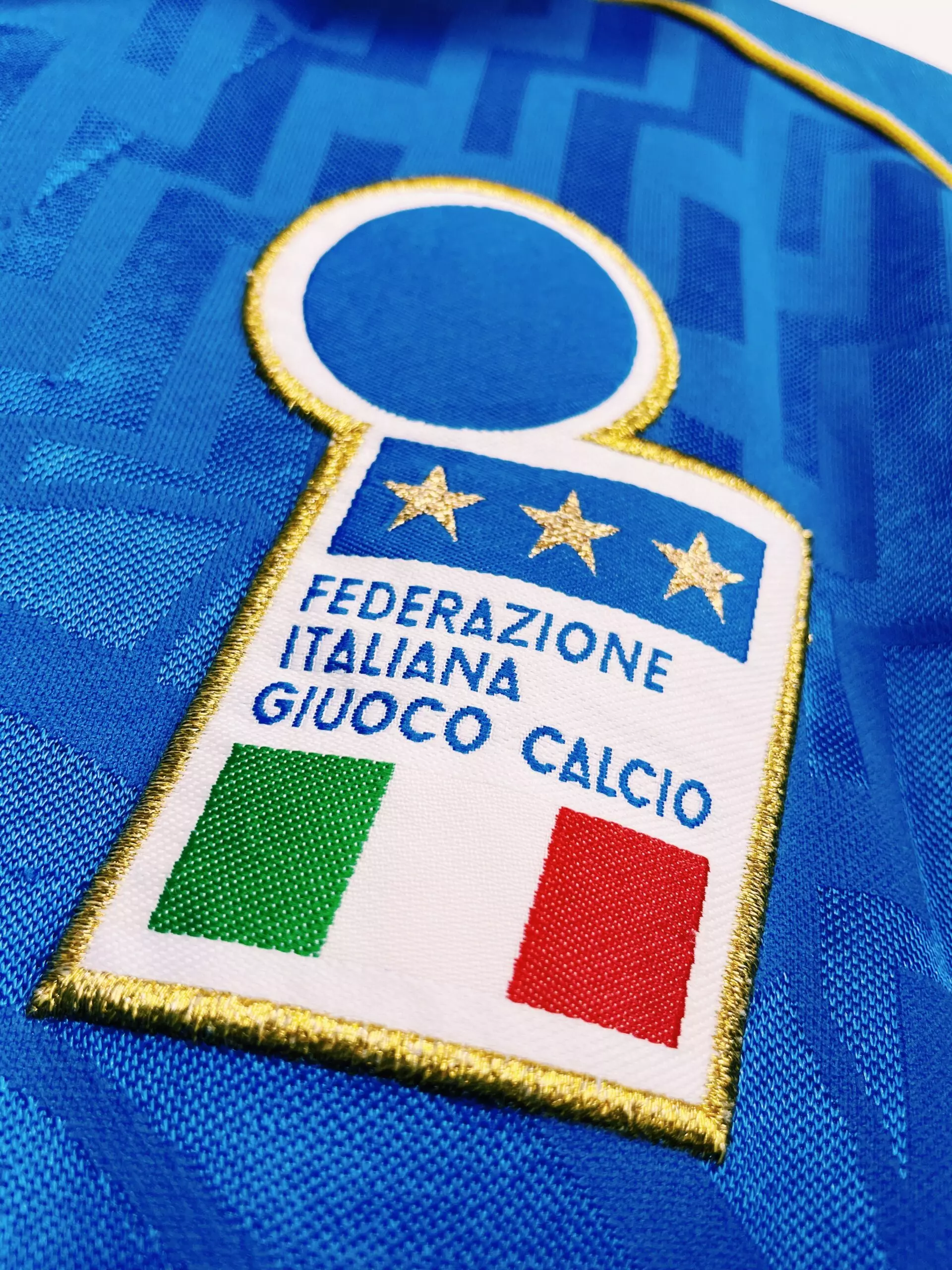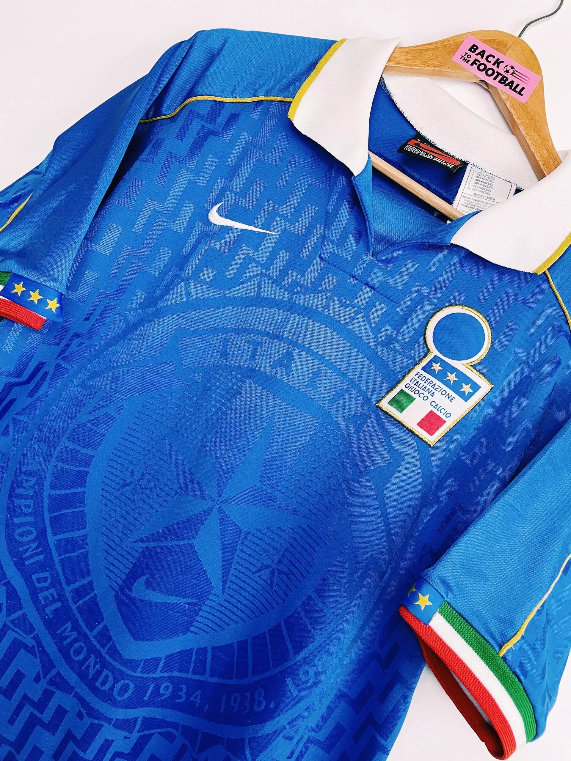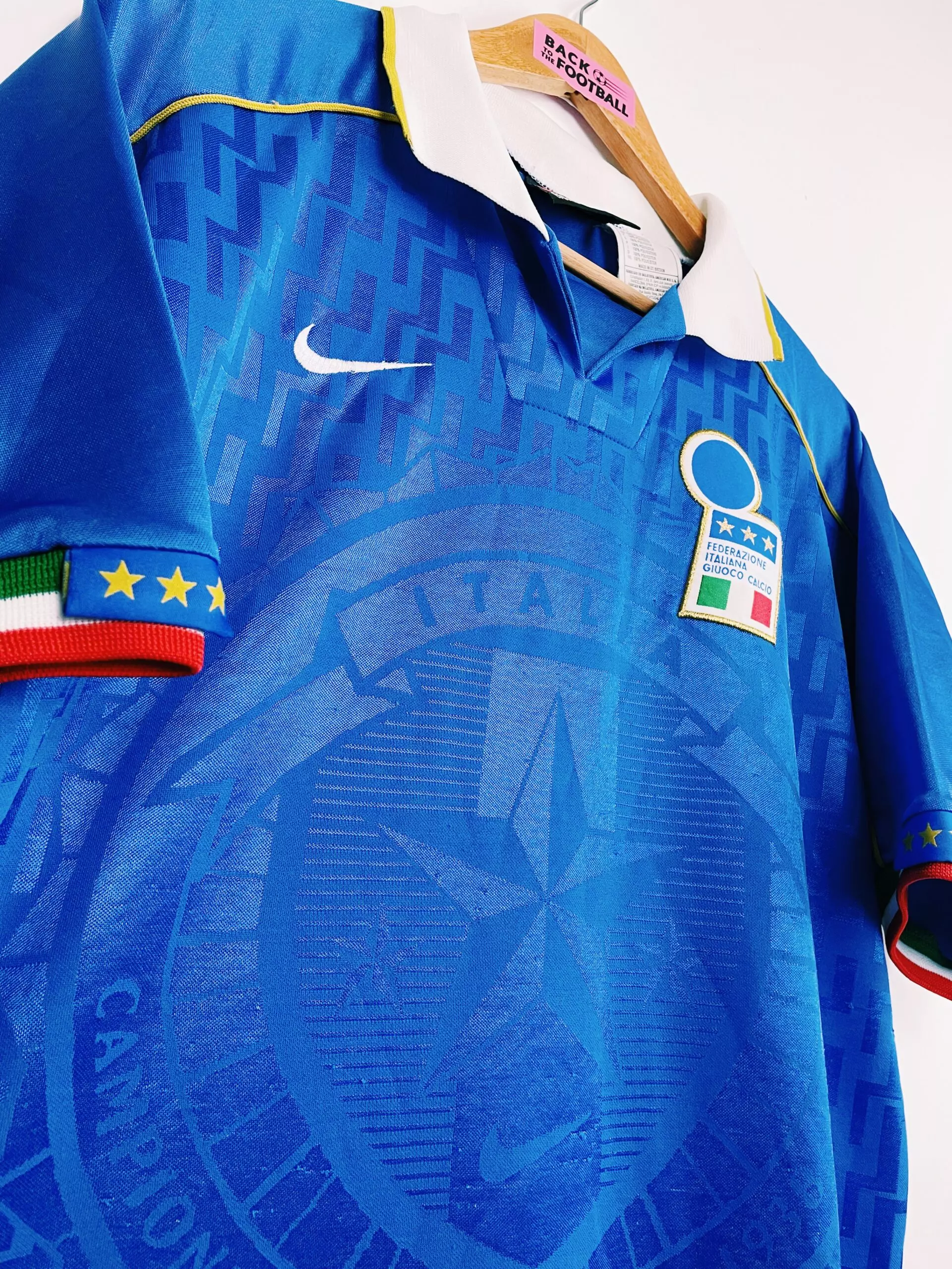 Taille : M Etat : 7.5/10, très bon état, mais quelques bouloches à signaler Le maillot : maillot vintage de l’Italie 1995/1996. L’écusson et le logo Nike sont brodés. Le design en tramé sur tout le maillot est magnifique. On peut voir sur les manches vertes, blanches et rouges, les 3 étoiles de la Squadra Azzurra. Un rare maillot rétro de l’Italie. Histoire : l’Italie utilisera ce maillot pour les qualifications de l’Euro 1996. Quelques joueurs : Baggio, Maldini, Ravanelli, Simone, Del Piero, Zola, Conte…