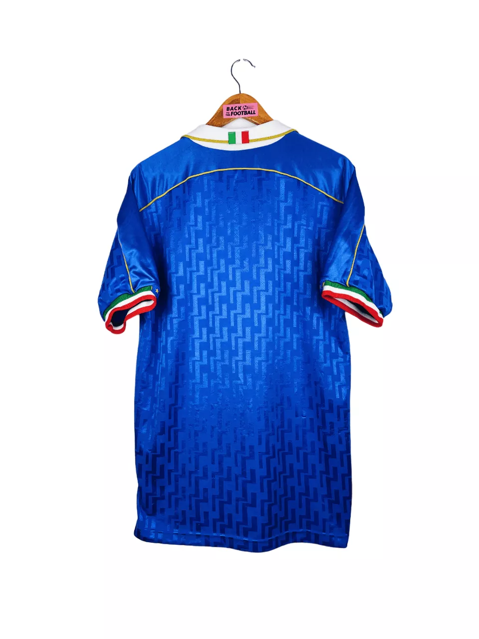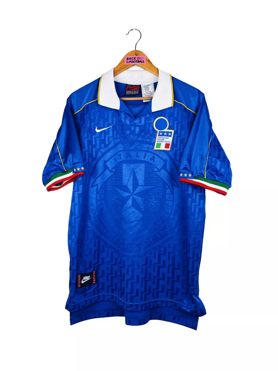 Taille : M Si tu veux plus de détails, tu peux nous contacter par mail ou sur les réseaux 😉 Etat : 8/10, très bon état, quelques bouloches Le maillot : maillot vintage de l’Italie 1995/1996. L’écusson et le logo Nike sont brodés. Le design en tramé sur tout le maillot est magnifique, avec la date des 3 coupes du Monde gagnés par les Italiens. On peut voir sur les manches vertes, blanches et rouges, les 3 étoiles de la Squadra Azzurra. Un rare maillot rétro de l’Italie. Histoire : l’Italie utilisera ce maillot pour les qualifications de l’Euro 1996.…