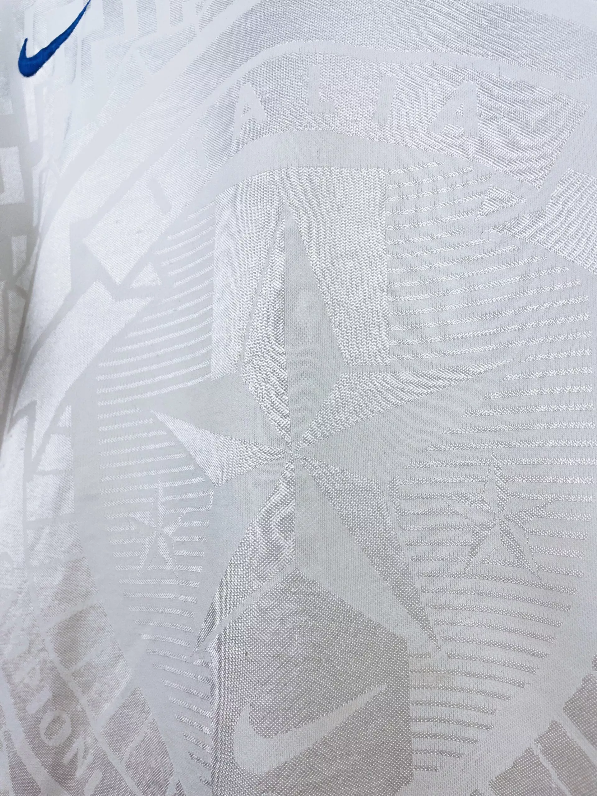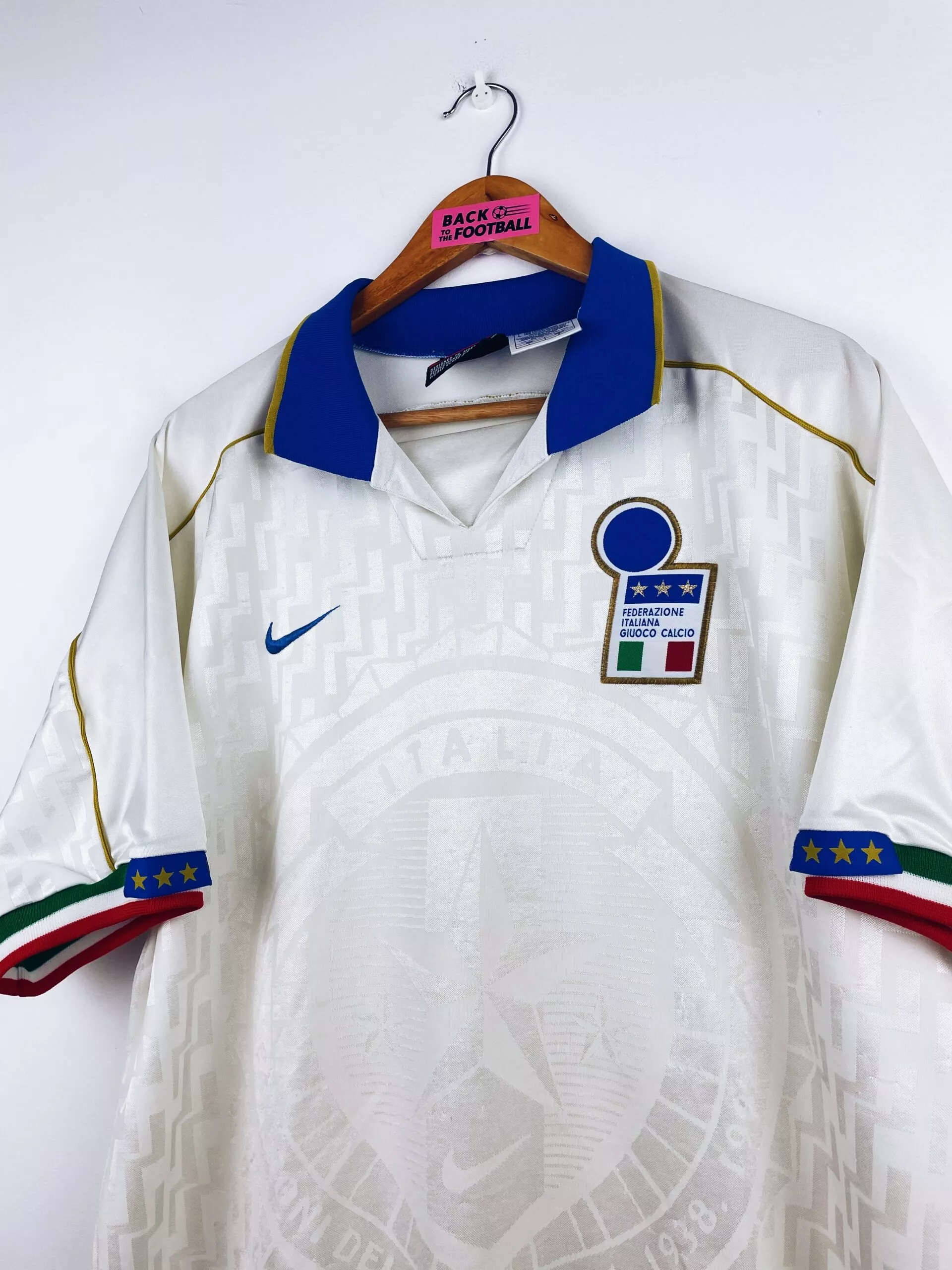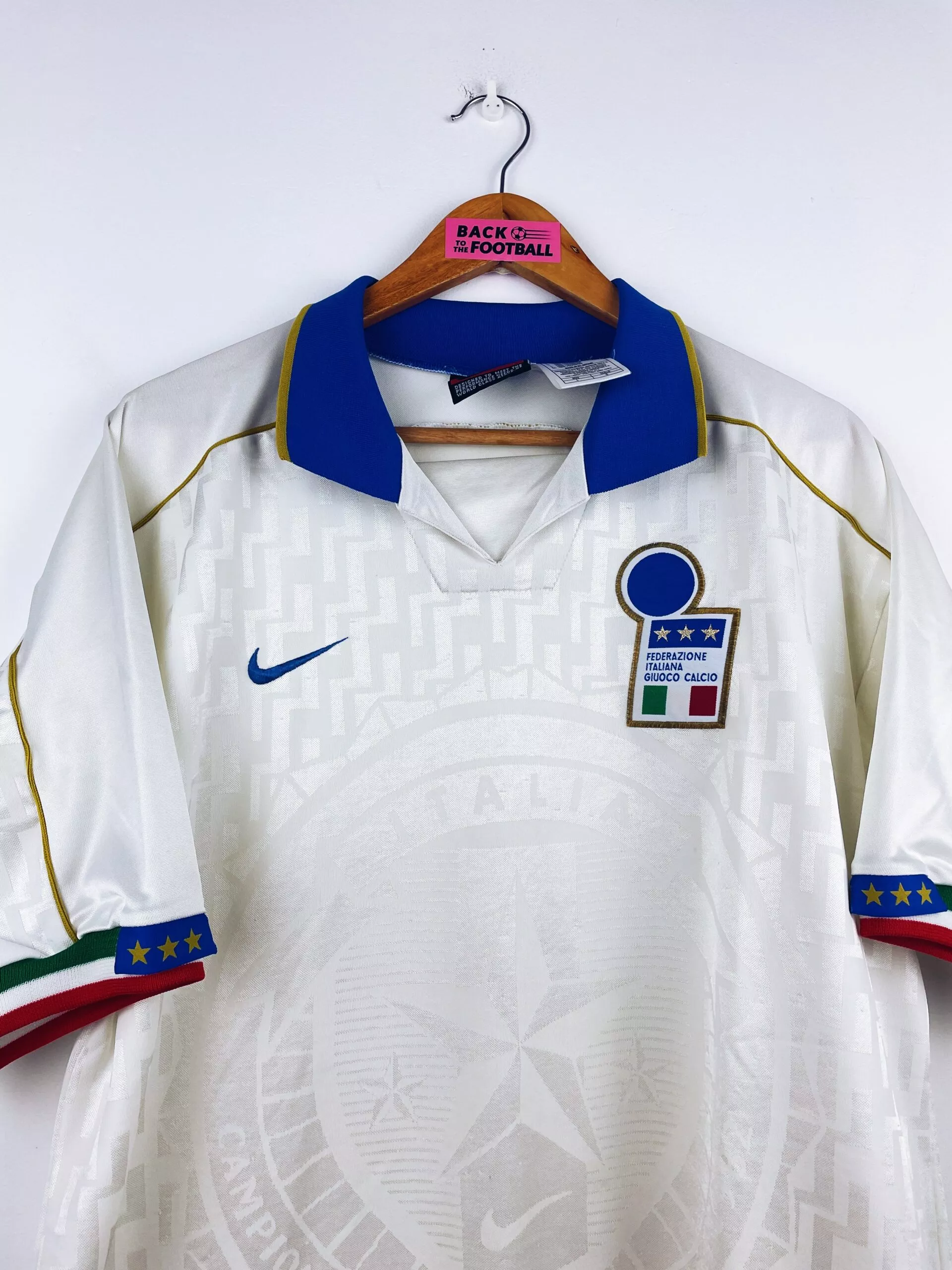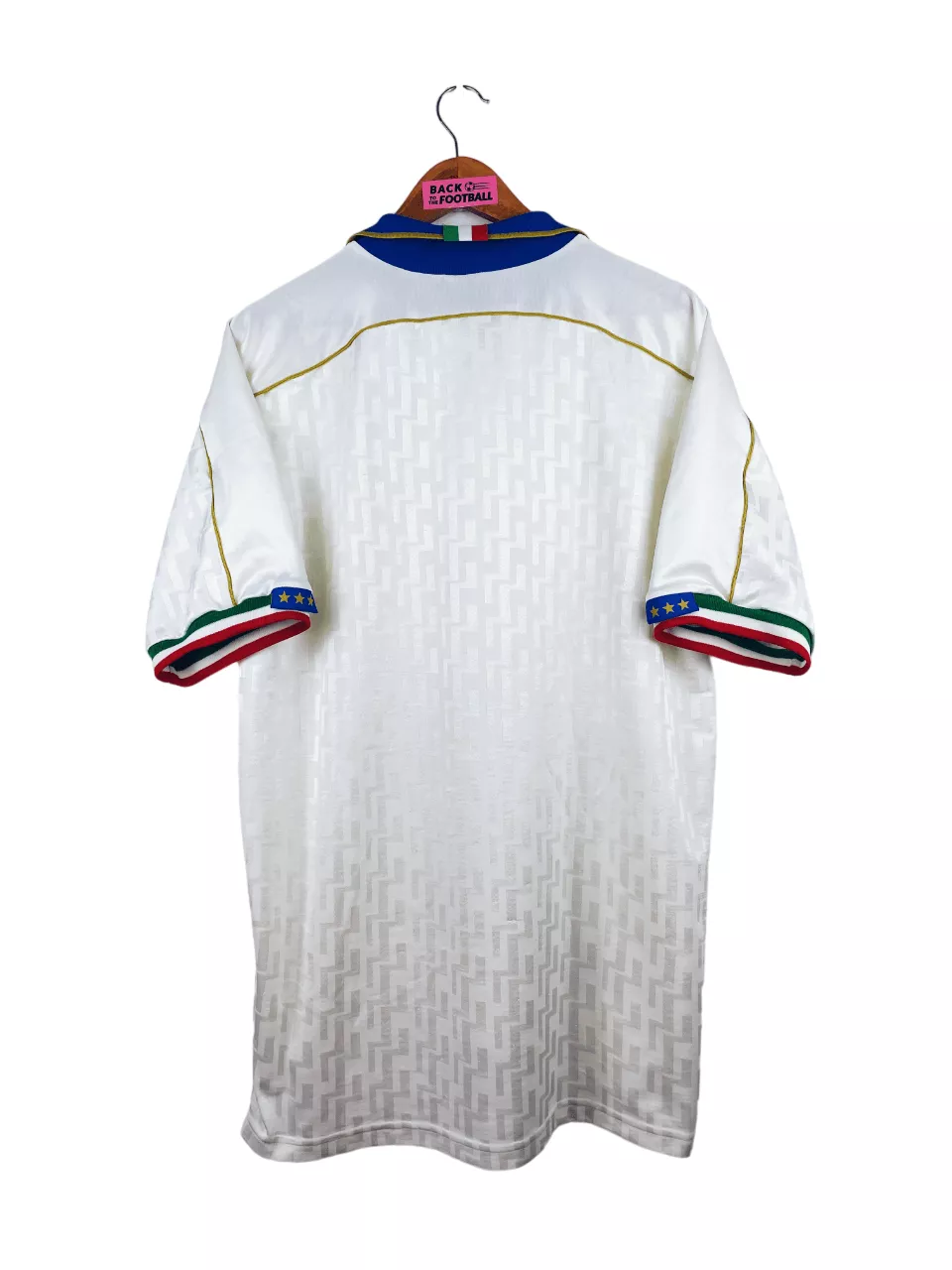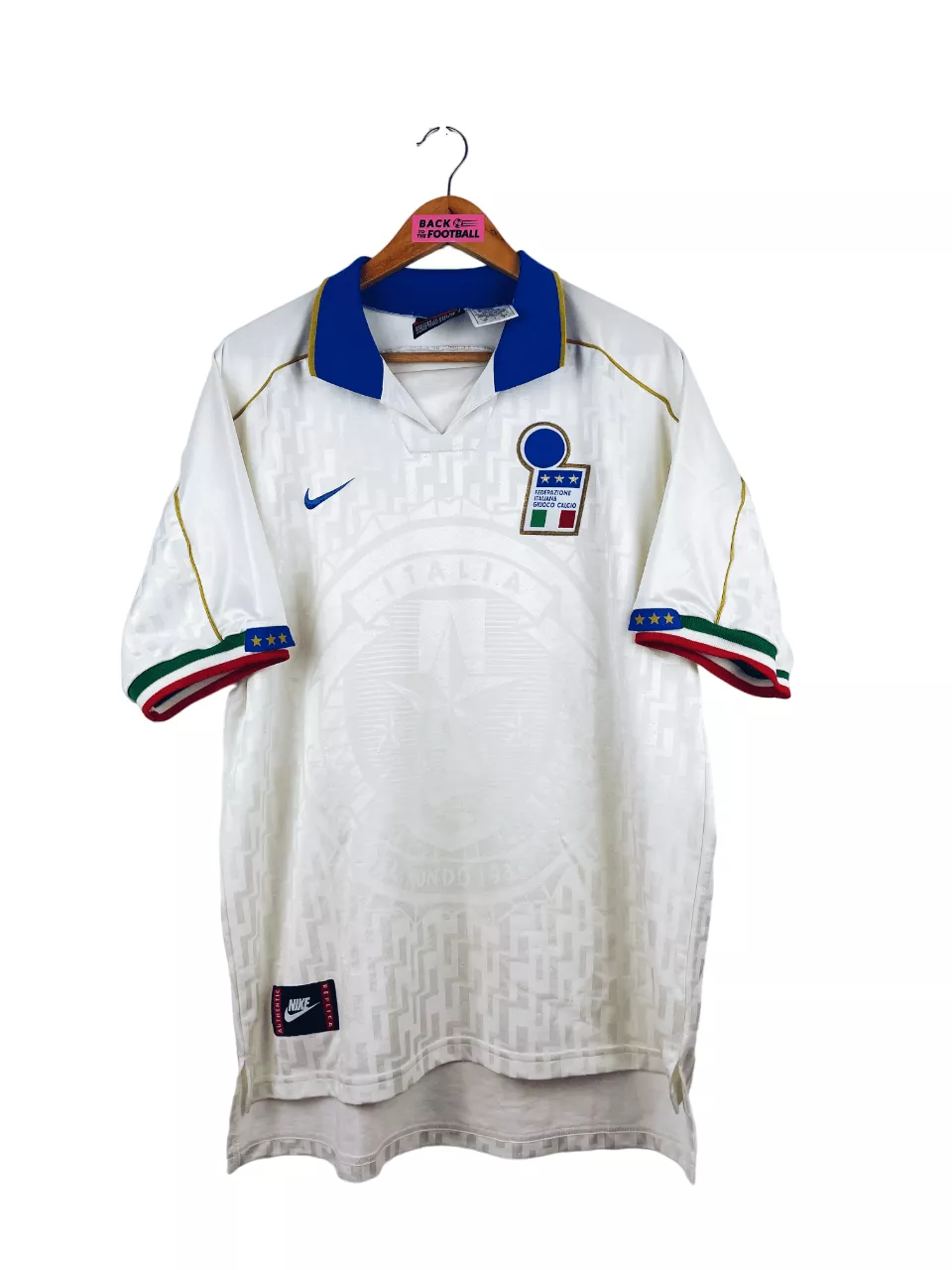 Taille : L Si tu veux plus de détails, tu peux nous contacter par mail ou sur les réseaux 😉 Etat : 7/10, très bon état mais de nombreuses bouloches et quelques accros (voir photos) Le maillot : maillot vintage extérieur de l’Italie 1995/1996. L’écusson et le logo Nike sont brodés. Le design en tramé sur tout le maillot est magnifique, avec la date des 3 coupes du Monde gagnés par les Italiens. On peut voir sur les manches les 3 étoiles de la Squadra Azzurra. Très beau maillot rétro de l’Italie ! Histoire : l’Italie utilisera ce maillot pour…
