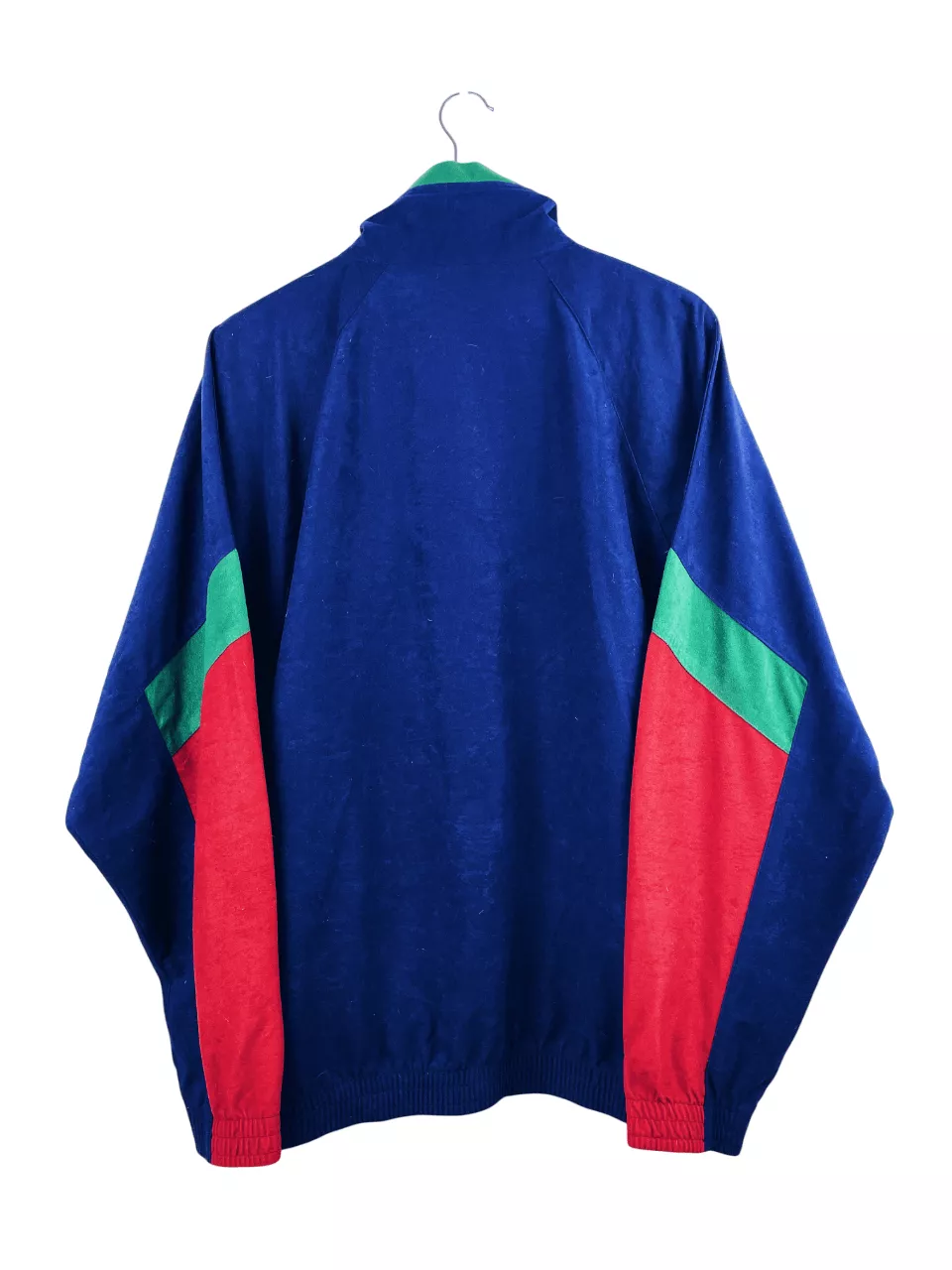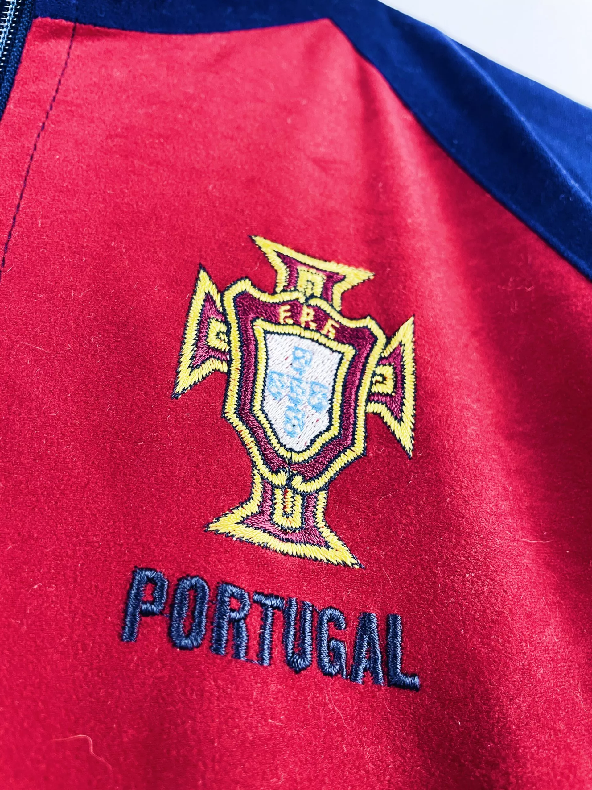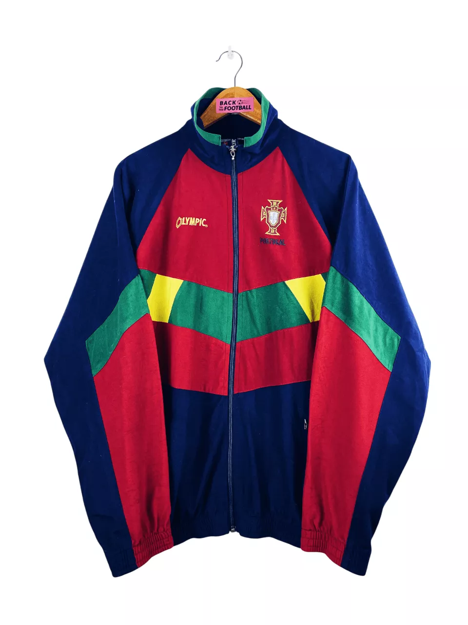 Taille : L Largeur : 62cm (aisselle à aisselle) Longueur : 72cm (base du col au bas) Si tu veux plus de détails, tu peux nous contacter par mail ou sur les réseaux 😉 Etat : 8/10, très bon état. L’embout de la fermeture éclair est cassé (voir photo) La veste : veste vintage du Portugal 1995. L’écusson et le logo Olympic sont brodés. 2 poches latérales zippées. Tissu peau de pêche. Très belle veste rétro du Portugal ! Histoire : les portugais se qualifient pour l’Euro 1996 en terminant premiers de leur poule, devant l’Irlande. En phase finale, ils…