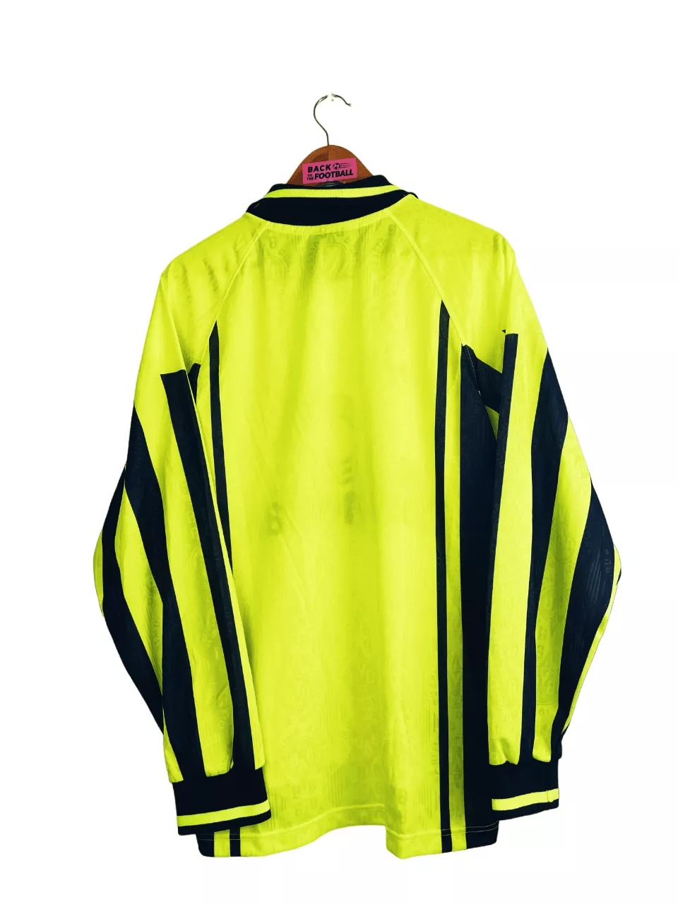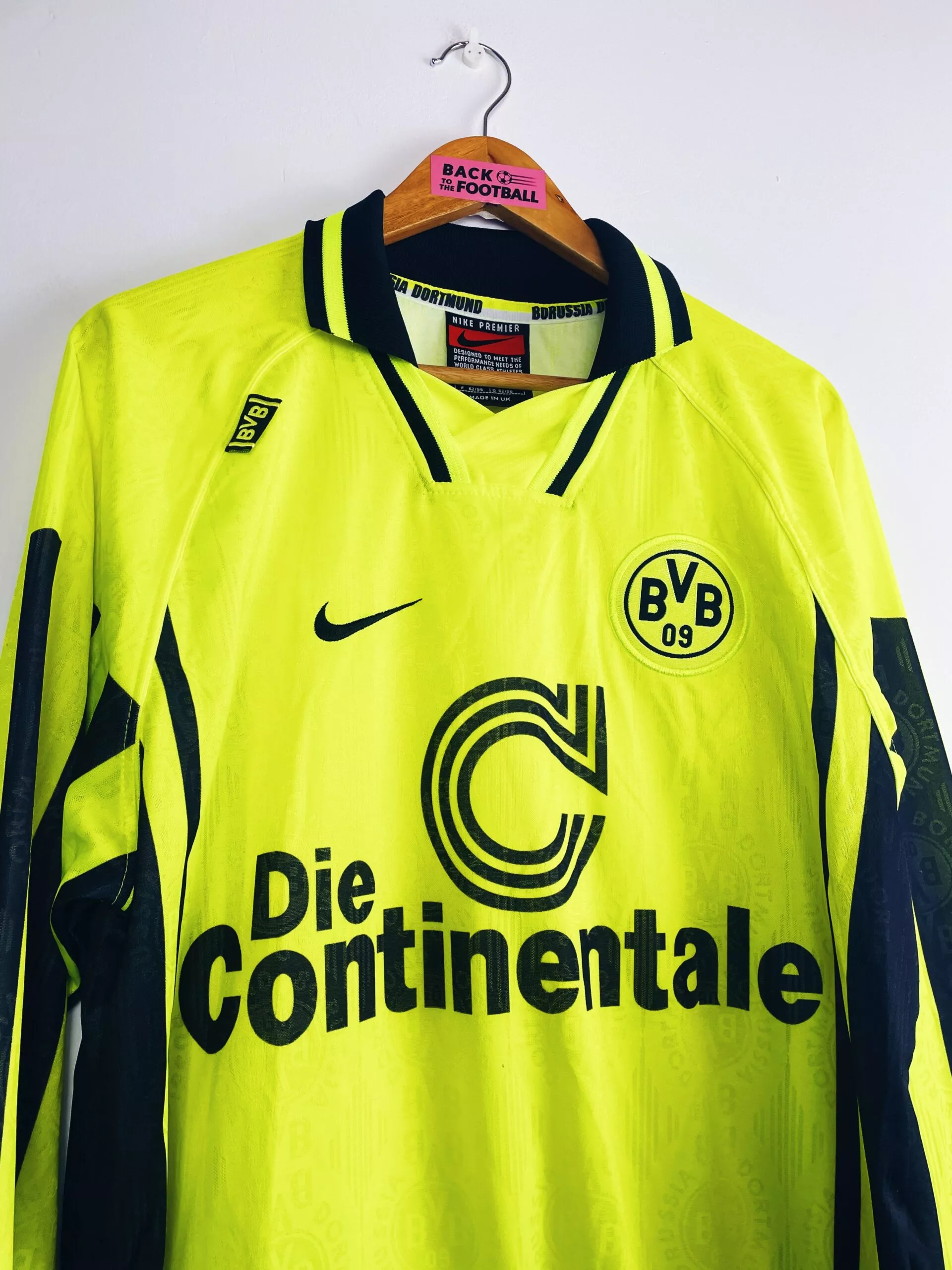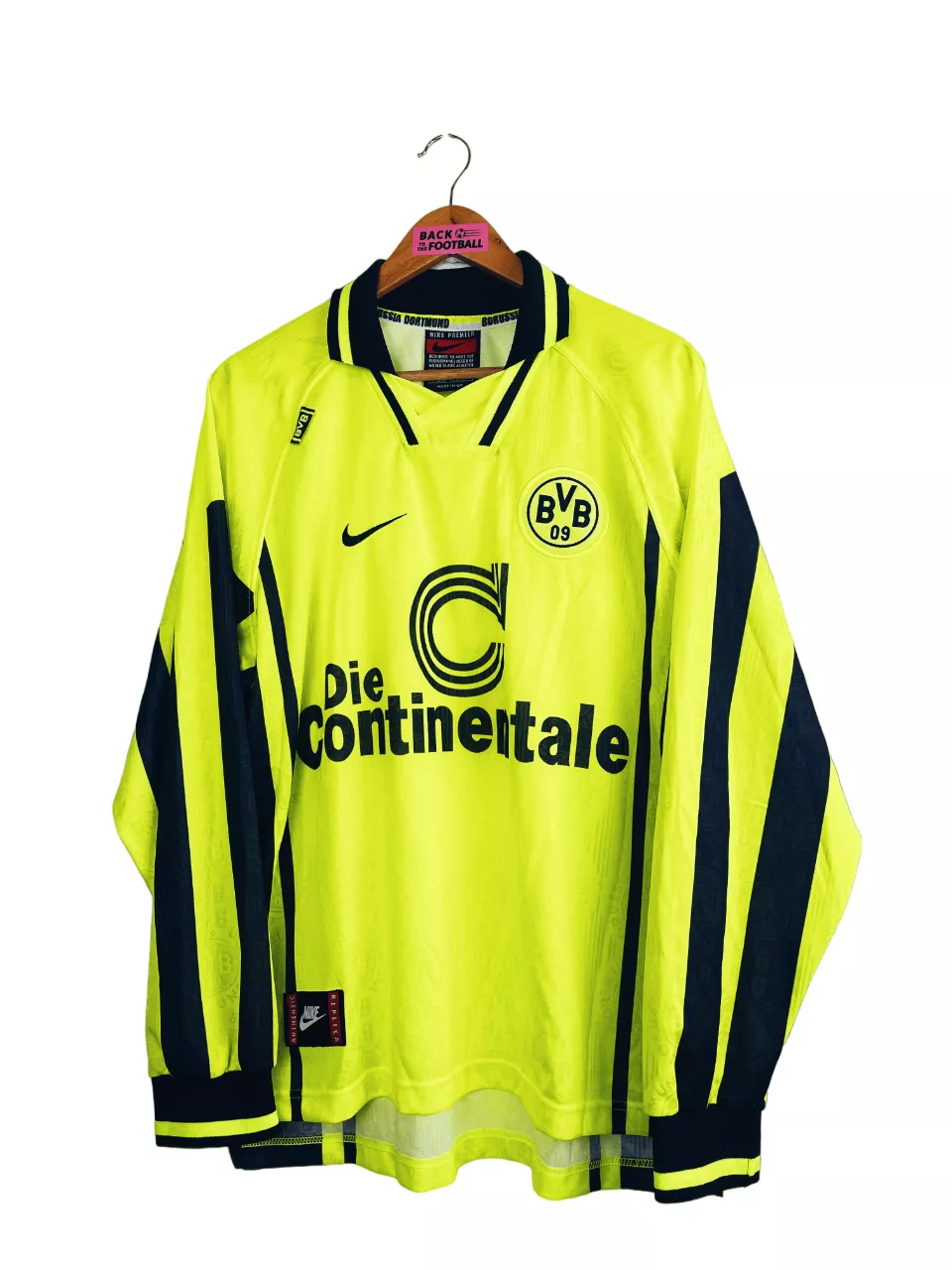 Taille : L Si tu veux plus d’infos, tu peux nous contacter par mail ou sur les réseaux 😉 Etat : 8.5/10, excellent état Le maillot : maillot vintage domicile du Borussia Dortmund 1996/1997 manches longues. L’écusson est brodé, comme le logo Nike. Le sponsor iconique Die Continentale est incrusté au maillot. On peut voir en tramé sur tout le maillot l’écusson du BVB. Très beau maillot rétro du Borussia Dortmund ! Histoire : le Borussia Dortmund finira 3ème de Bundesliga après leur titre la saison passée. Le BVB gagnera la Super Coupe d’Allemagne contre le FC Kaiserslautern. Mais surtout,…