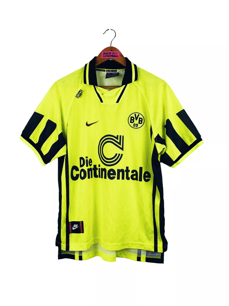 Taille : M Si tu veux plus d’infos, tu peux nous contacter par mail ou sur les réseaux 😉 Etat : 8/10, très bon état, le logo Nike est délavé (voir photos) Le maillot : maillot vintage domicile du Borussia Dortmund 1996/1997. L’écusson est brodé, comme le logo Nike. Le sponsor iconique Die Continentale est incrusté au maillot. On peut voir en tramé sur tout le maillot l’écusson du BVB. Très beau maillot rétro du Borussia Dortmund ! Histoire : le Borussia Dortmund finira 3ème de Bundesliga après leur titre la saison passée. Le BVB gagnera la Super Coupe d’Allemagne…