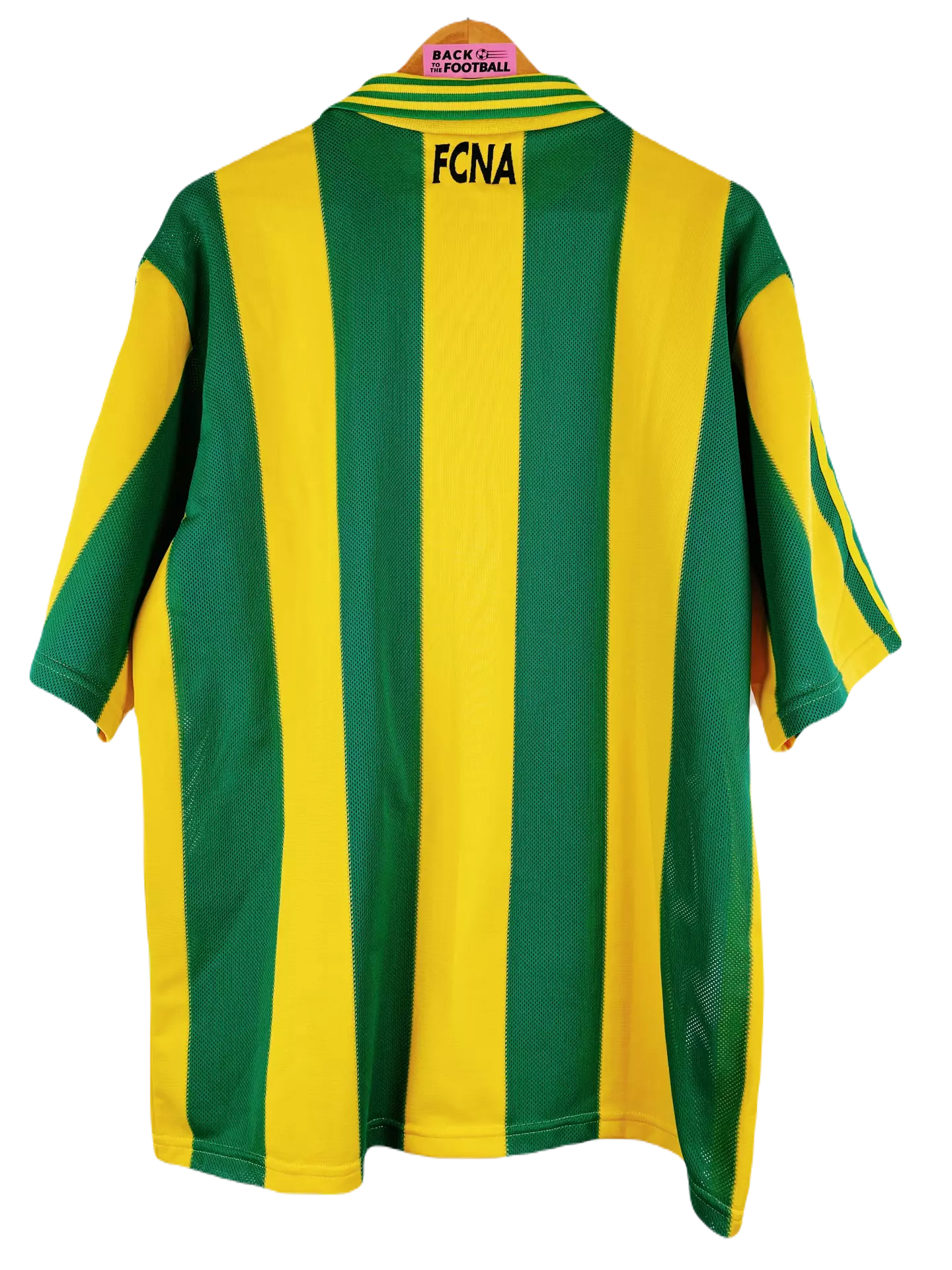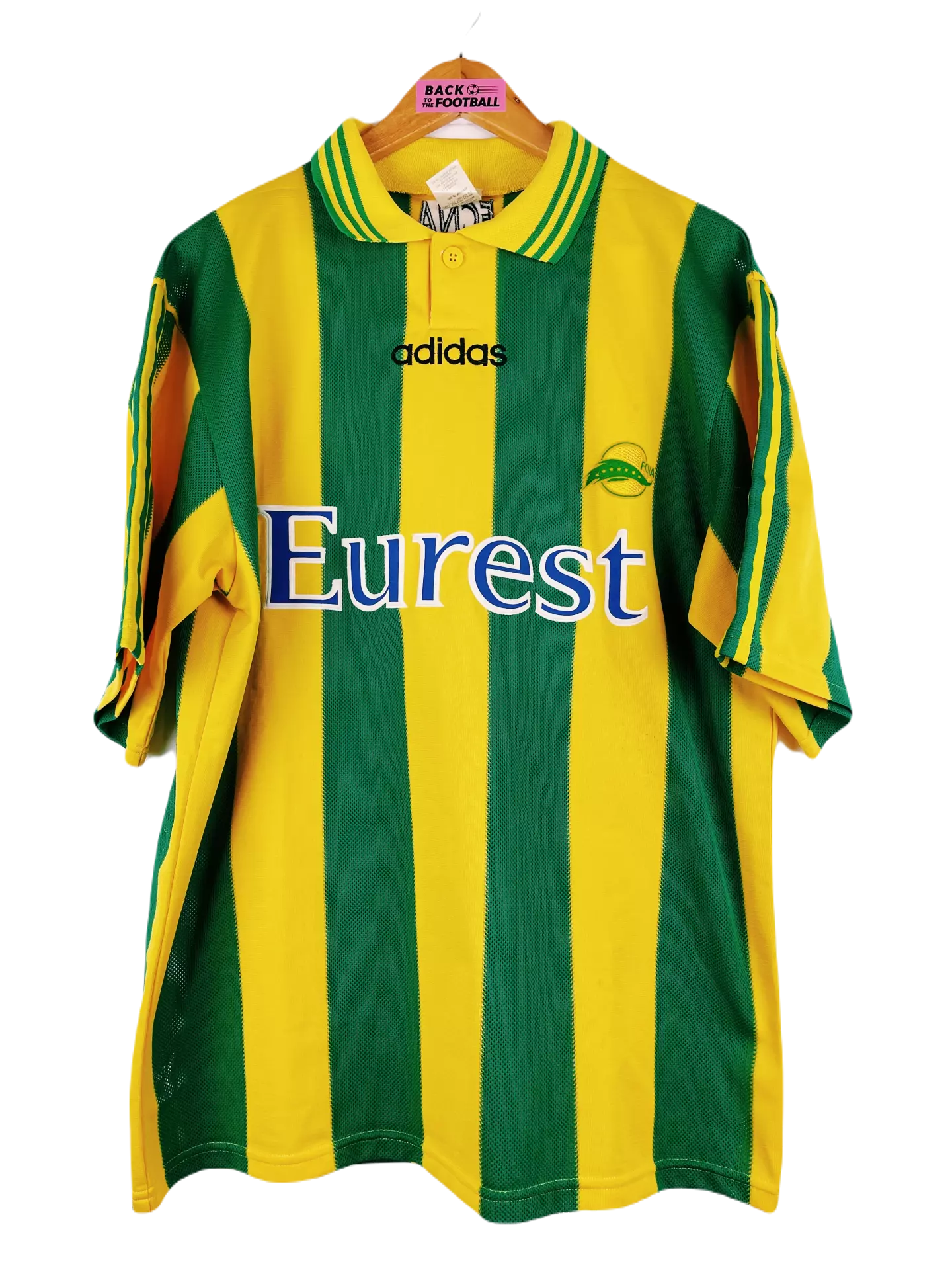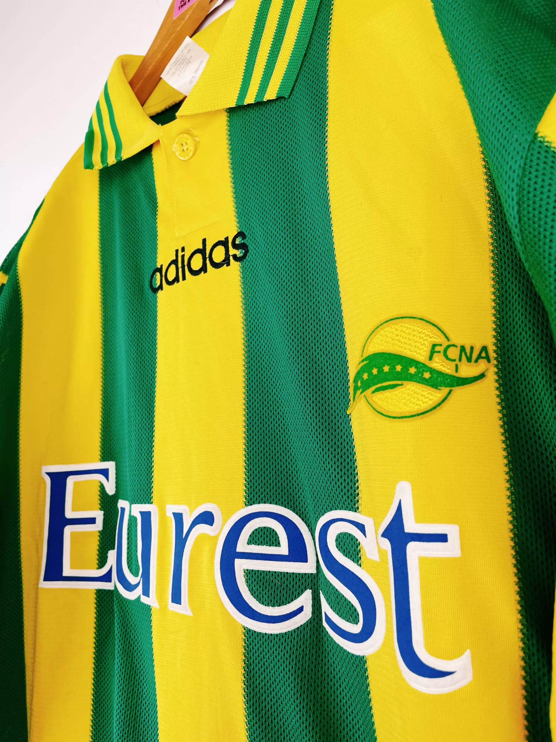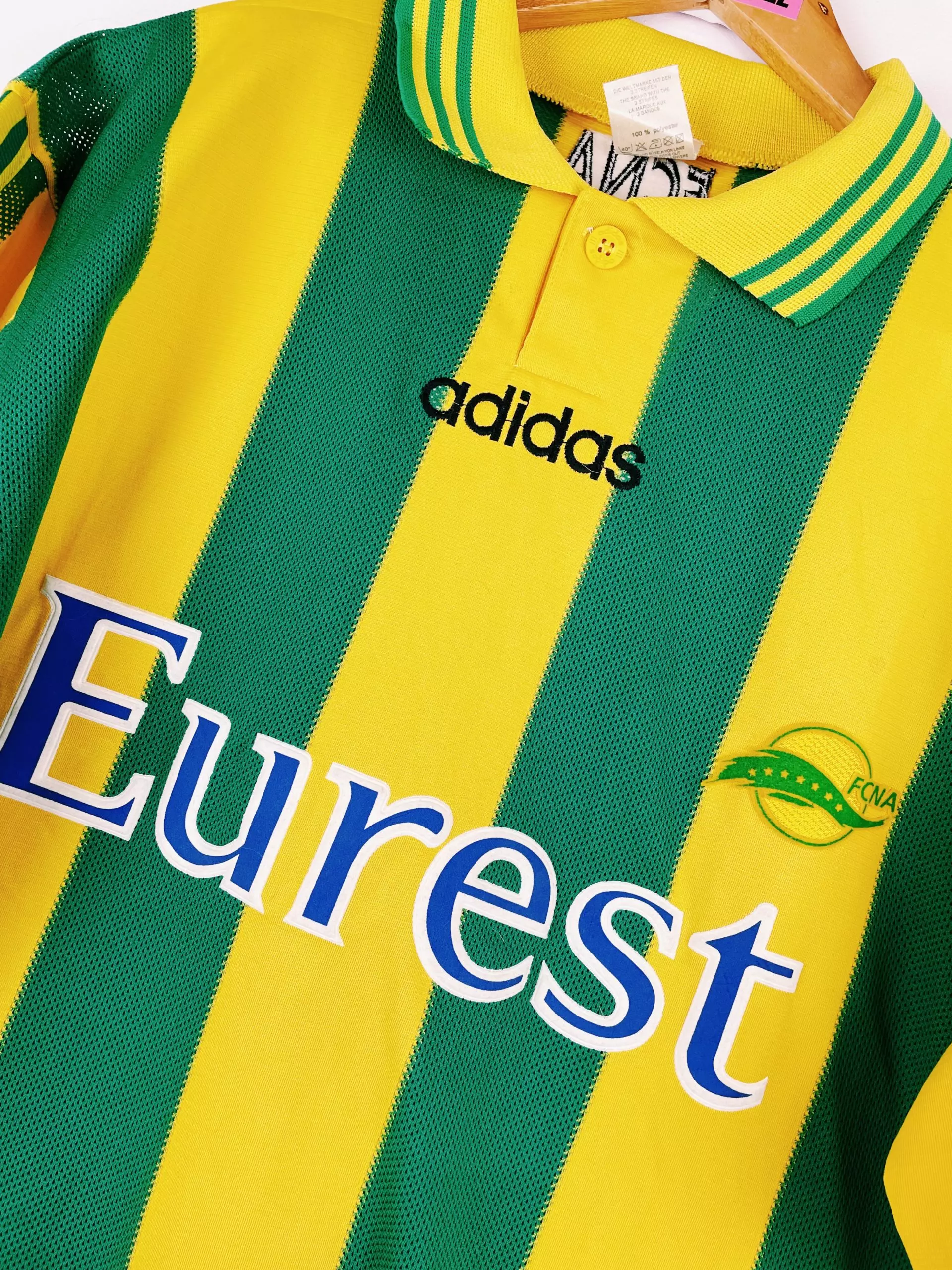 Taille : XL Etat : très bon état, petite tâche au dessus de l’écusson Le maillot : maillot vintage Adidas du FC Nantes, saison 1996/1997. Le maillot reprend les couleurs historiques des canaris avec le jaune et vert. L’ancien écusson du club est en feutrine, comme le sponsor Eurest. Le logo Adidas est brodé. Le col a un bouton. Histoire : les Canaris termineront sur le podium de Division 1, avec une belle 3ème place derrière l’AJ Auxerre et le PSG. Japhet N’Doram, « le sorcier de la Beaujoire » marquera 27 buts cette saison ! Gros milieu pour le FC Nantes…