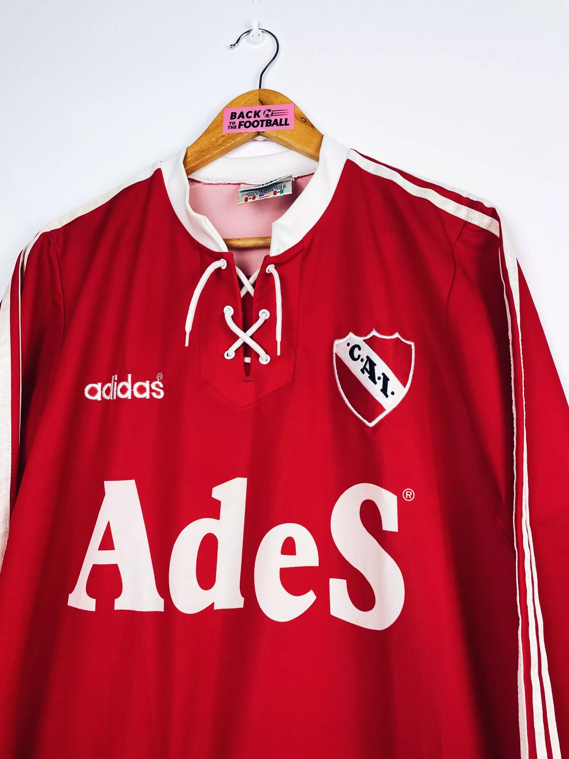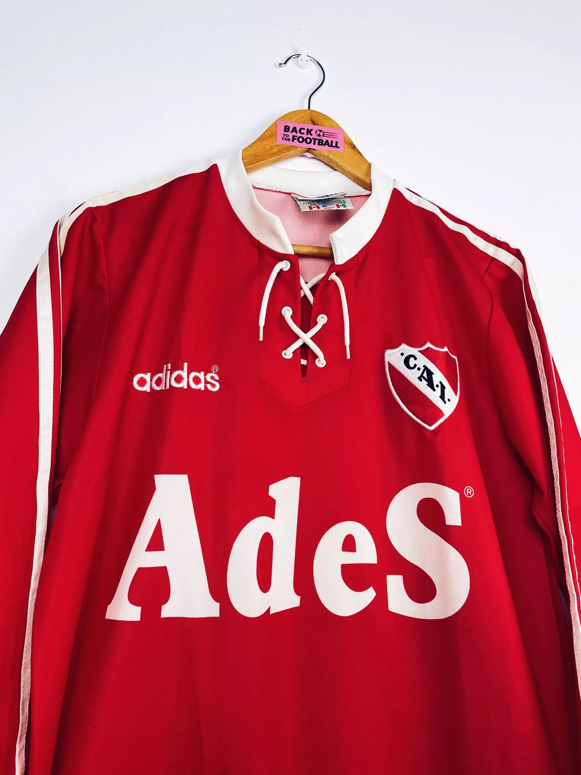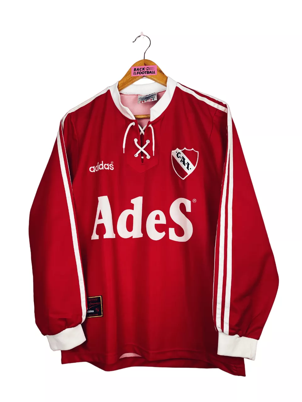 Taille : M Si tu veux plus de détails, tu peux nous contacter par mail ou sur les réseaux 😉 Etat : 9/10, excellent état Le maillot : maillot vintage de l’Independiente 1996/1997 domicile en manches longues. L’écusson et le logo Adidas sont brodés, le sponsor Ades est incrusté. Le col à lacets est splendide. Très beau maillot rétro de l’Independiente ! Histoire : lors du tournoi d’ouverture Argentin, l’Independiente termine à la deuxième place, derrière River Plate. Les Diables Rouges feront moins bien lors du tournoi de clôture avec une 4ème place. Mais au cumulé, ils terminent deuxièmes !