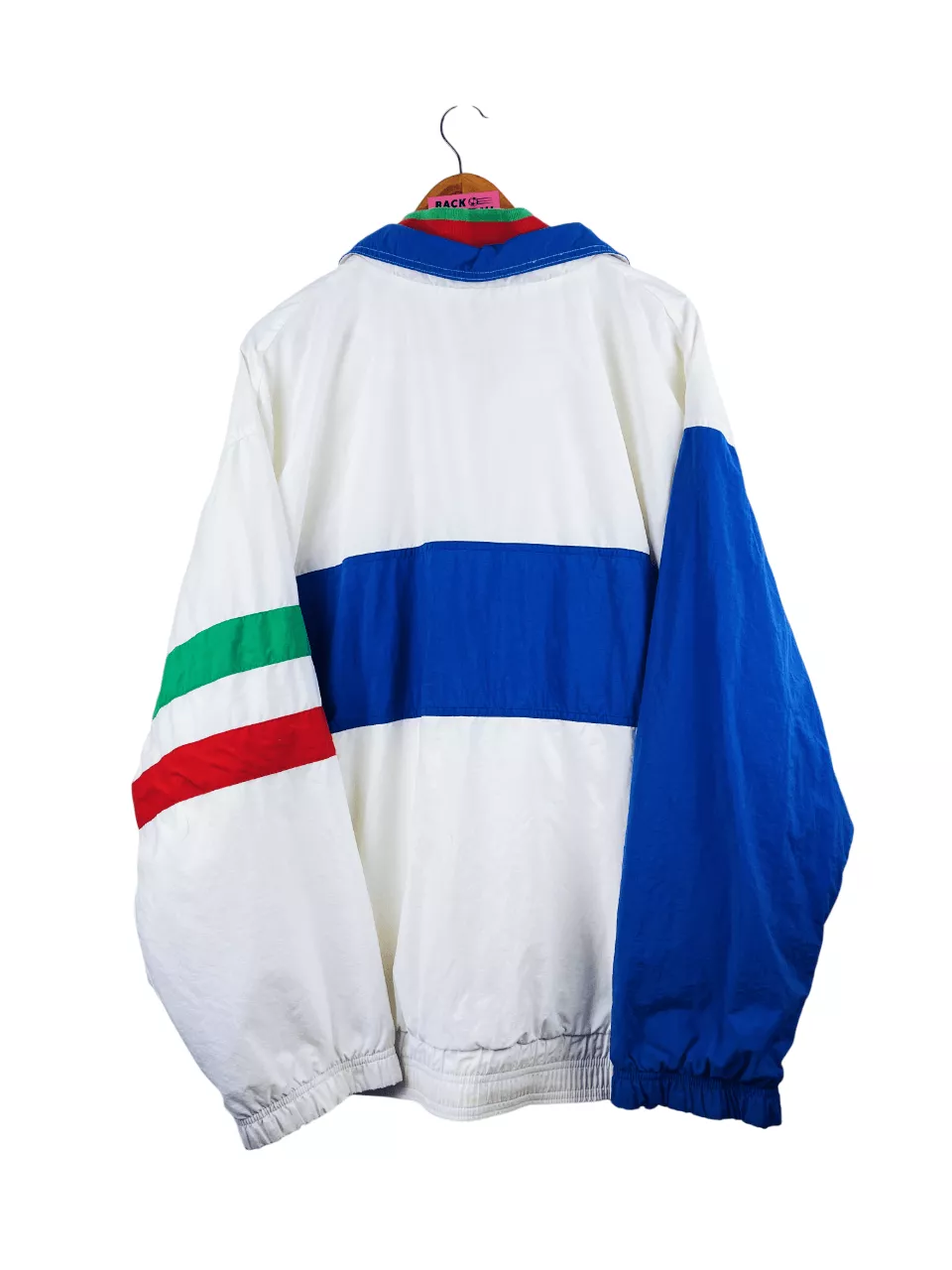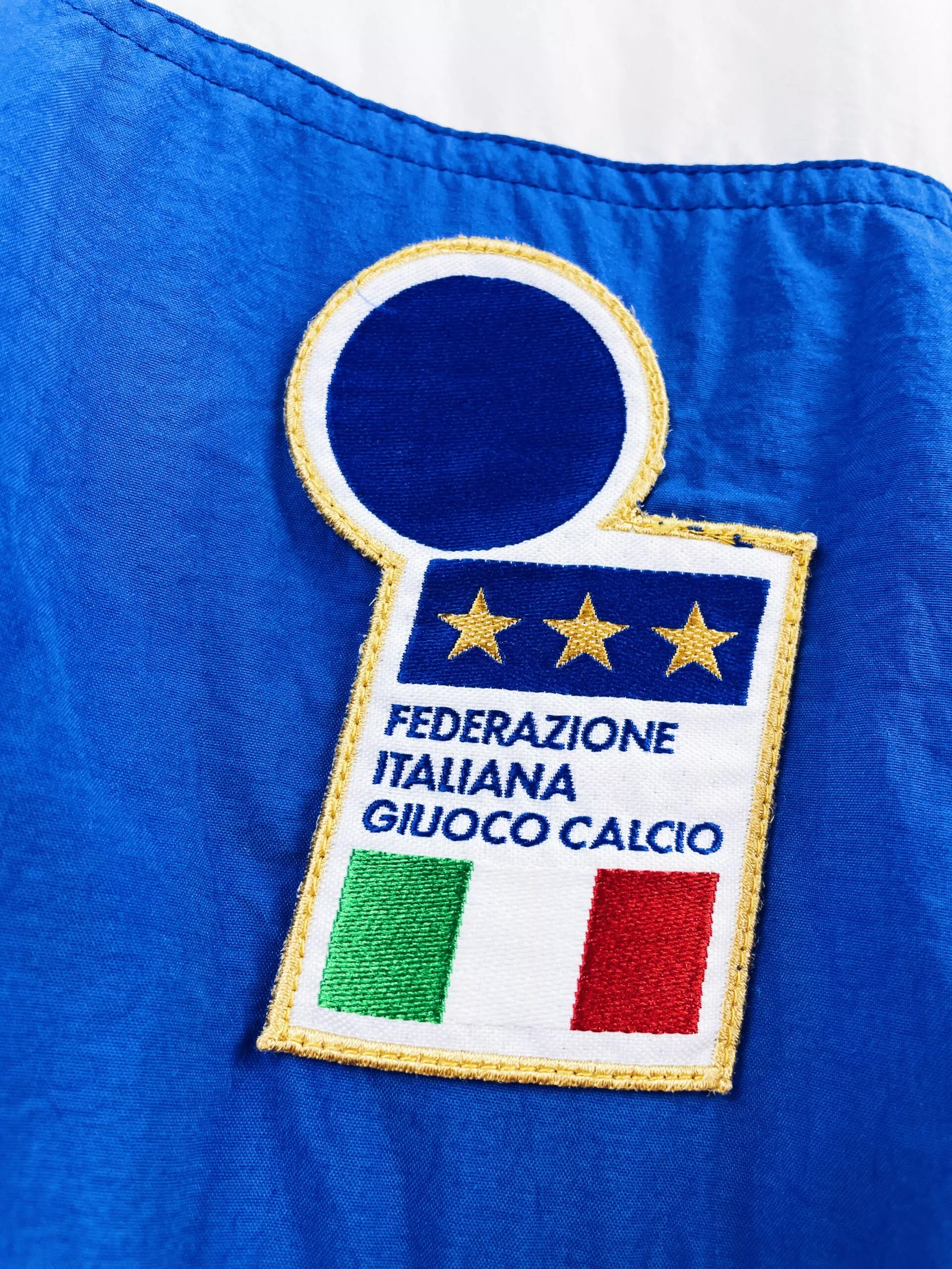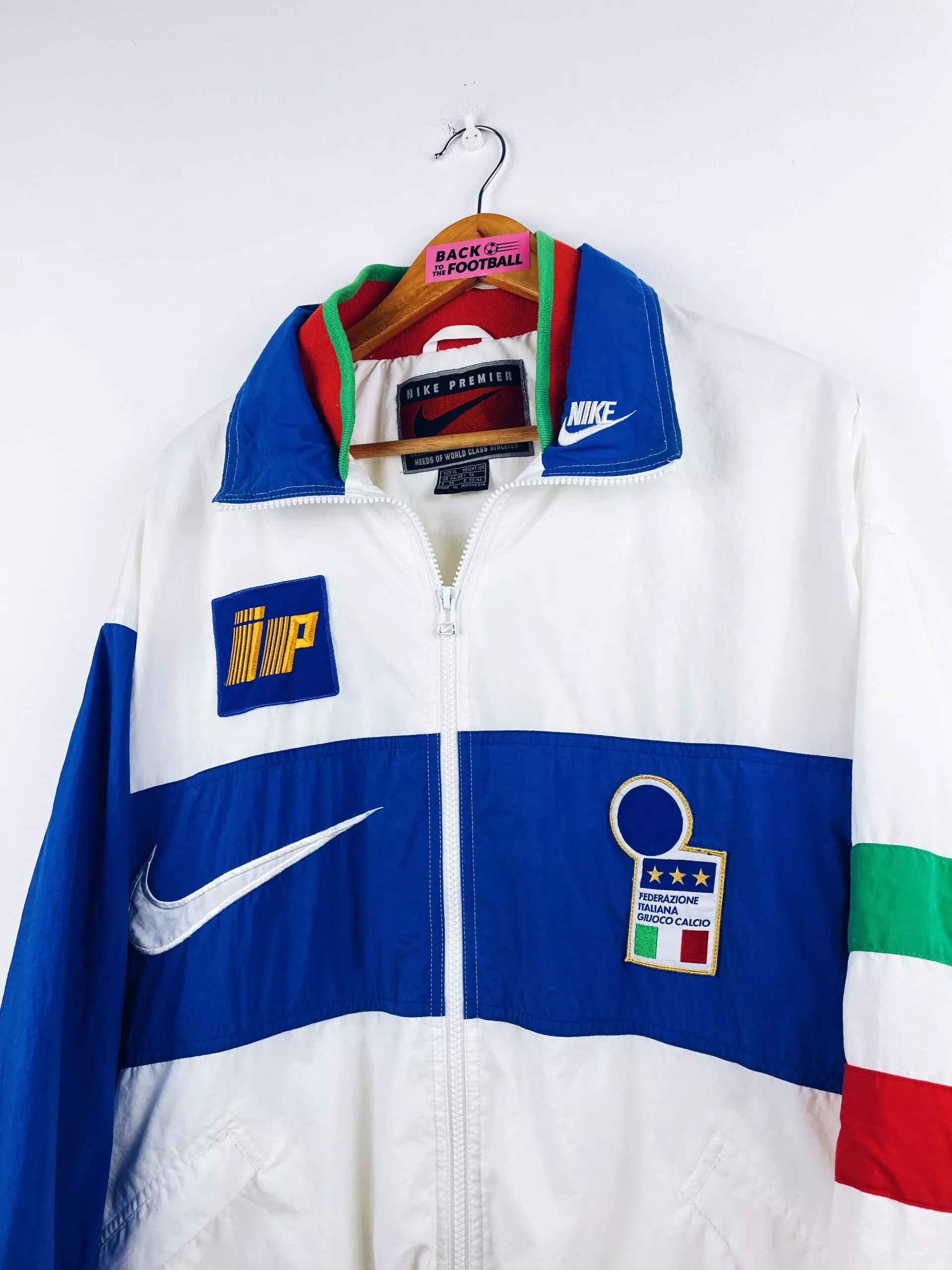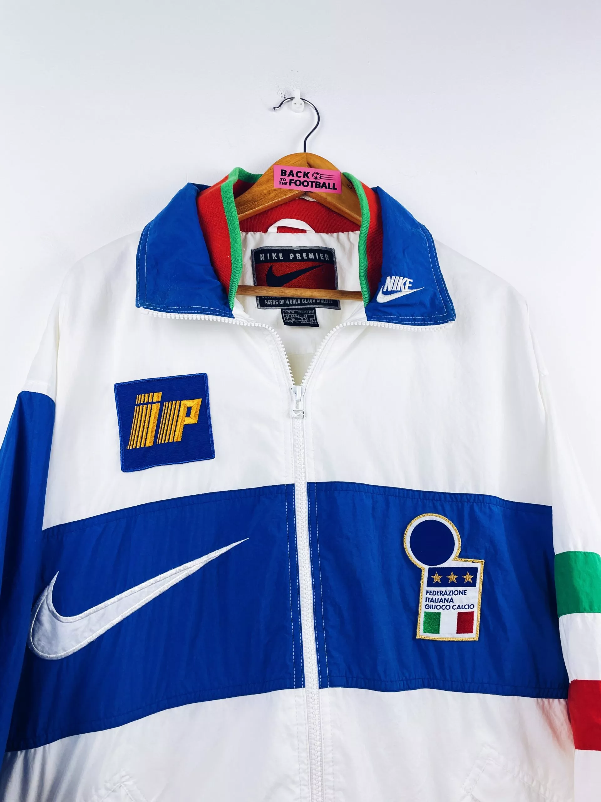Taille : XL Si tu veux plus de détails, tu peux nous contacter par mail ou sur les réseaux 😉 Etat : 8/10, très bon état. Le bas de la veste est très légèrement jaunie et très légère trace dans le dos (voir photos) La veste : veste vintage de l’Italie 1996/1997 issu du stock pro (player issue). L’écusson et le logo Nike sont brodés. Le logo IP aussi. Il y a 2 poches latérales. Très belle veste rétro de l’Italie ! Histoire : l’équipe d’Italie arrive à l’Euro 96 comme une des équipes favorites, notamment après sa finale au…
