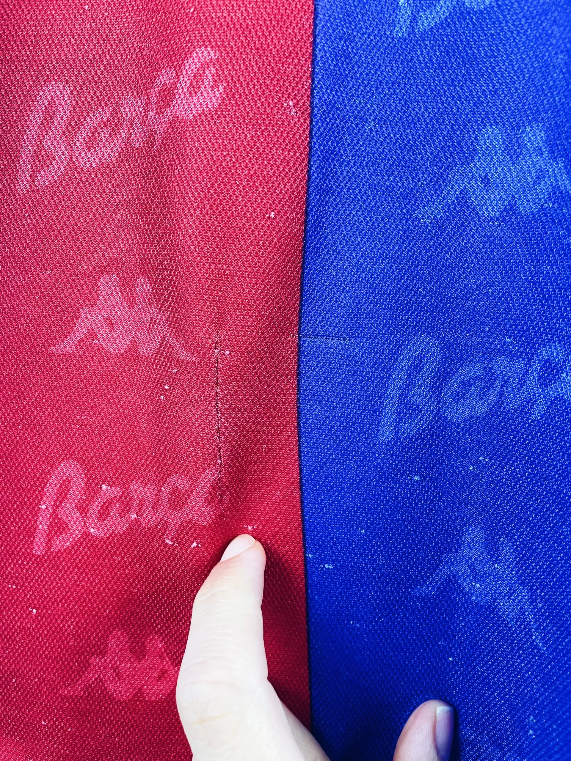 Taille : M Largeur : 55cm (aisselle à aisselle) Longueur : 71cm (base du col au bas) Si tu veux plus de détails, tu peux nous contacter par mail ou sur les réseaux 😉 Etat : 6.5/10, bon état général mais beaucoup de bouloches et quelques accrocs (voir photos) Le maillot : maillot vintage domicile du FC Barcelone 1996/1997 floqué Ronaldo #9. C’est un maillot issu du stock pro (player issue) : Ronaldo #9 incrusté et patch Liga. L’écusson et le logo Kappa sont brodés. On peut voir en tramé sur tout le maillot le logo de l’équipementier. Très beau maillot…
