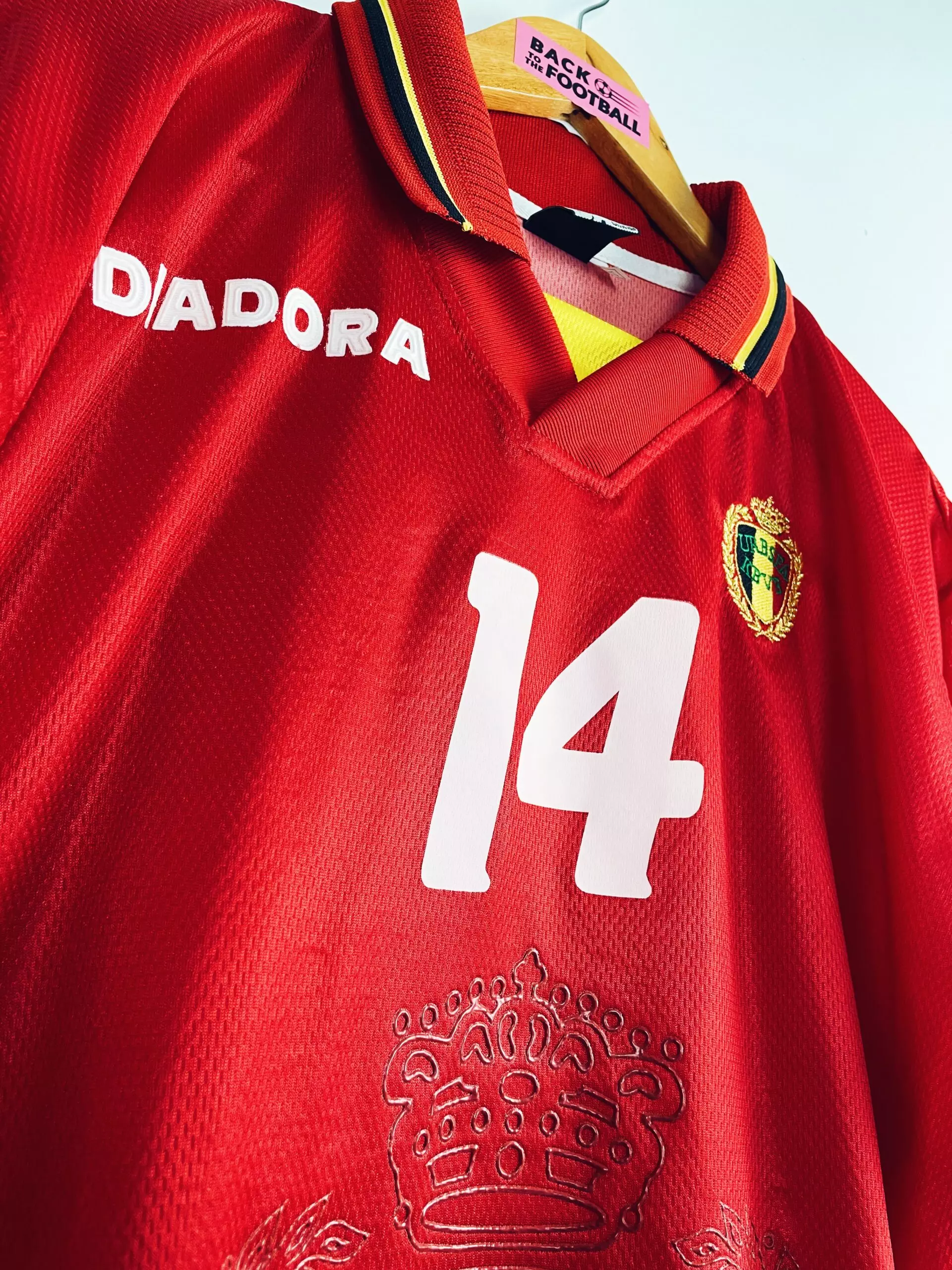 Taille : XL Etat : 8.5/10, excellent état Le maillot : maillot vintage domicile de la Belgique 1996/1997 préparé (match issue) ou porté (match worn) par le numéro 14. On nous a soufflé dans l’oreillette que c’était peut-être Gilles de Bilde. On est preneur d’info supplémentaire ! L’écusson est brodé, le logo Diadora est collé et le numéro 14 est floqué. L’écusson en tramé sur le maillot est en relief. Très beau maillot rétro de la Belgique ! Histoire : pas qualifiée pour l’Euro 1996, les Diables Rouges valident leur ticket pour la Coupe du Monde 1998 en terminant à…