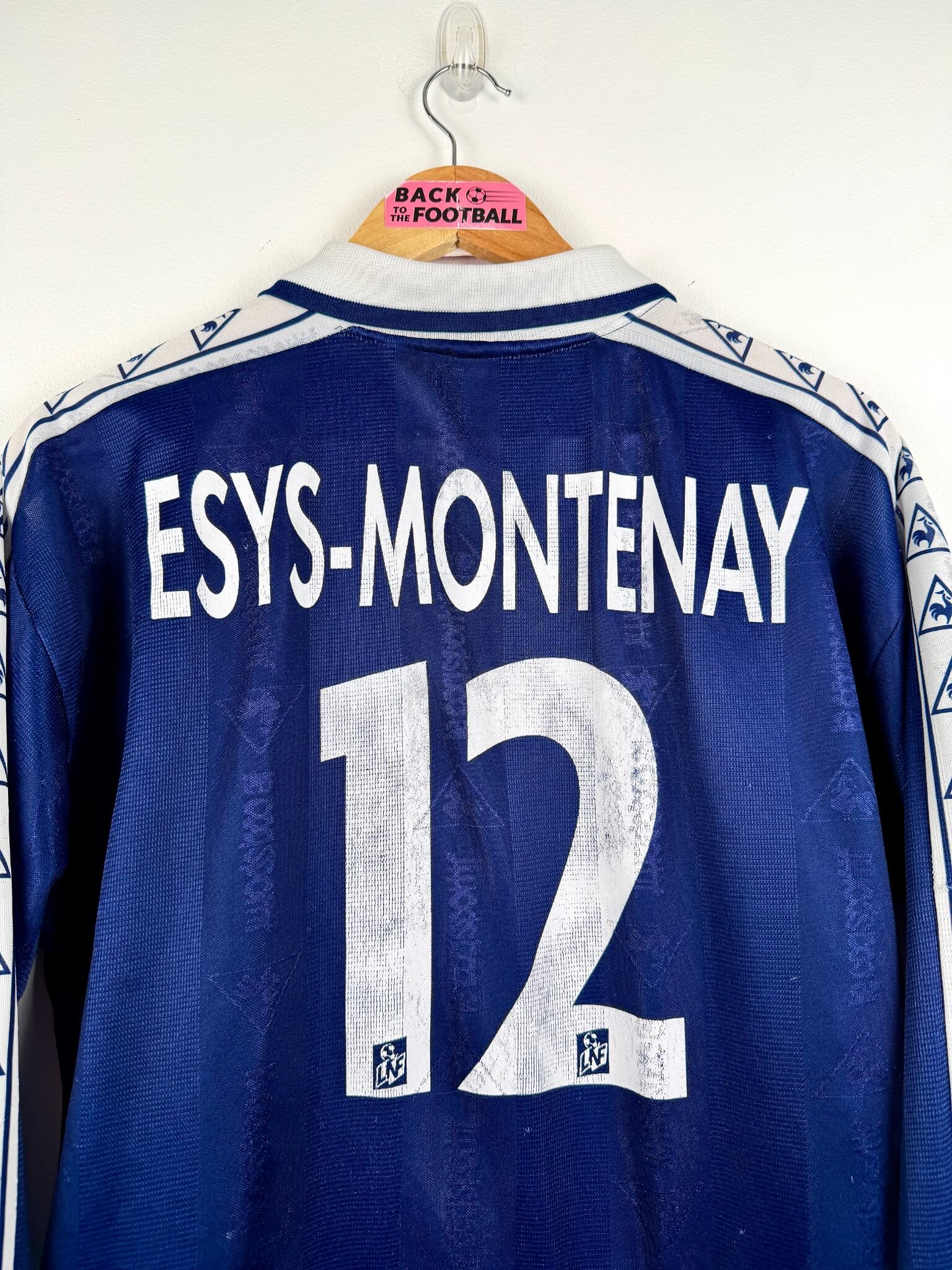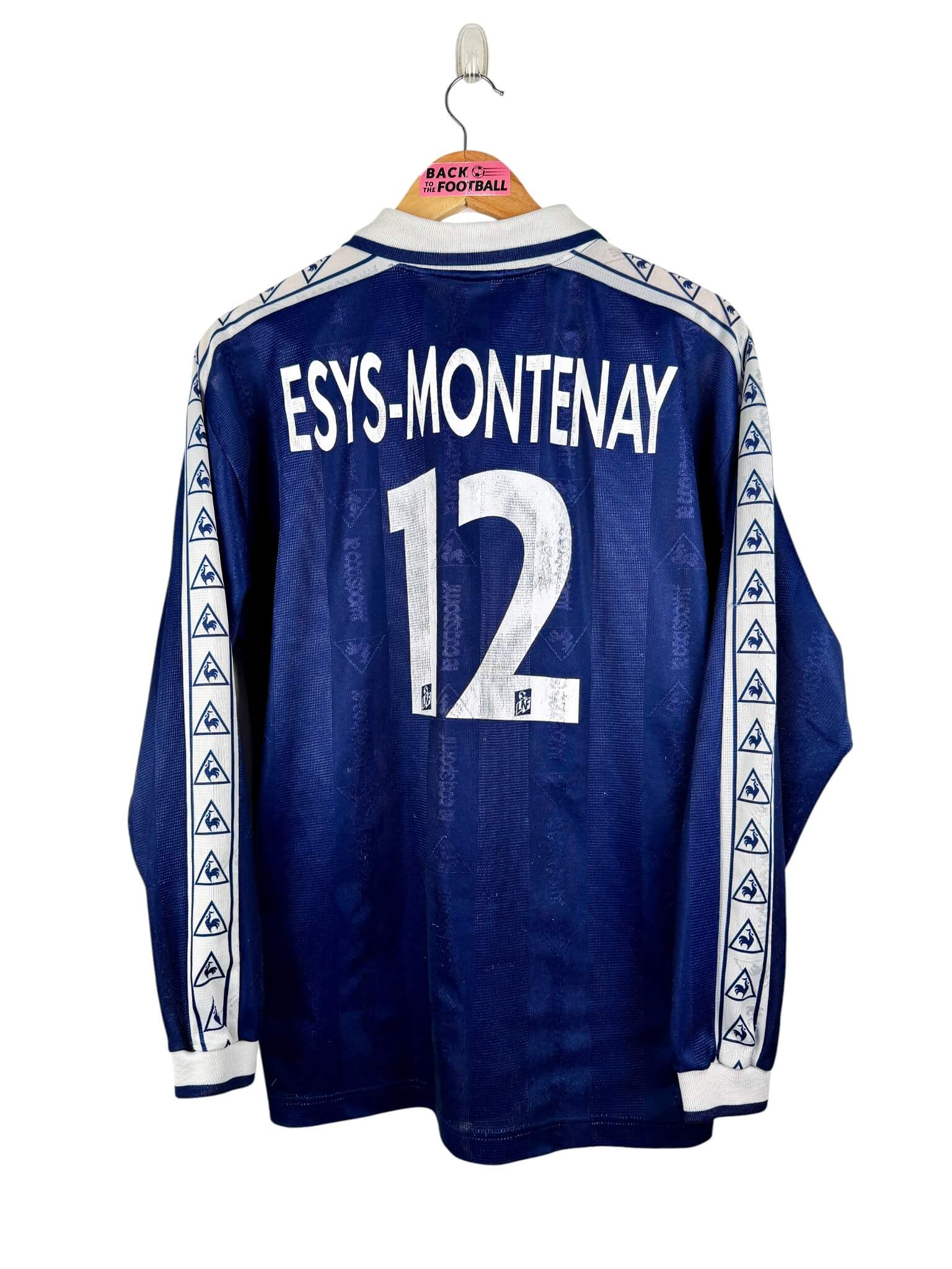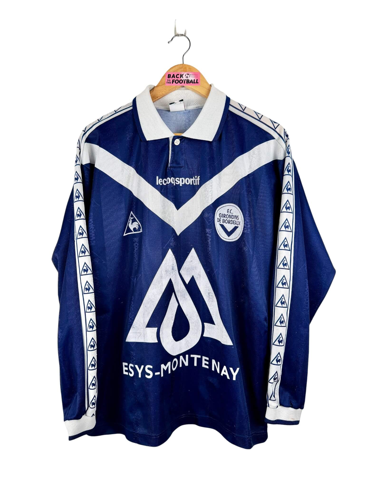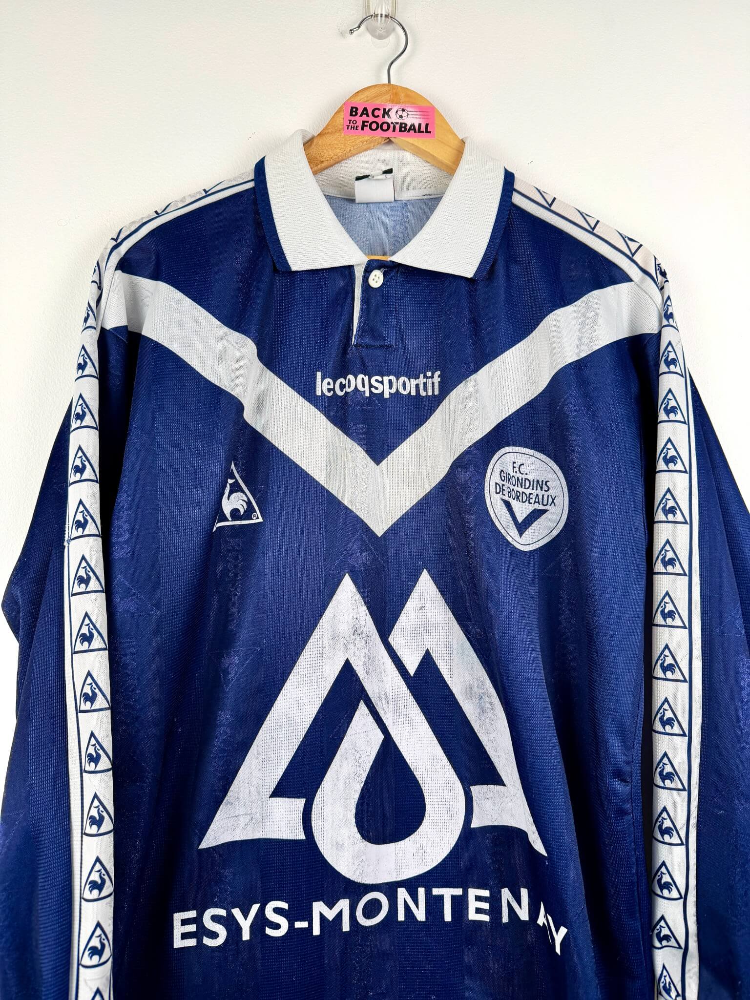Taille : M Largeur : 55cm (aisselle à aisselle) Longueur : 71cm (base du col au bas) Si tu veux plus de détails, tu peux nous contacter par mail ou sur les réseaux 😉 Etat : 7/10, bon état général mais les flocages sont abimés (voir photos) Le maillot : maillot vintage domicile des Girondins de Bordeaux 1996/1997 préparé (match issue) ou porté (match worn) par le numéro 12 de la réserve : manches longues, sponsor différent de l’équipe A. On n’est pas sûr à 100% de la saison. L’écusson, le logo Le Coq Sportif, le sponsor Esys-Montenay sont floqués.…