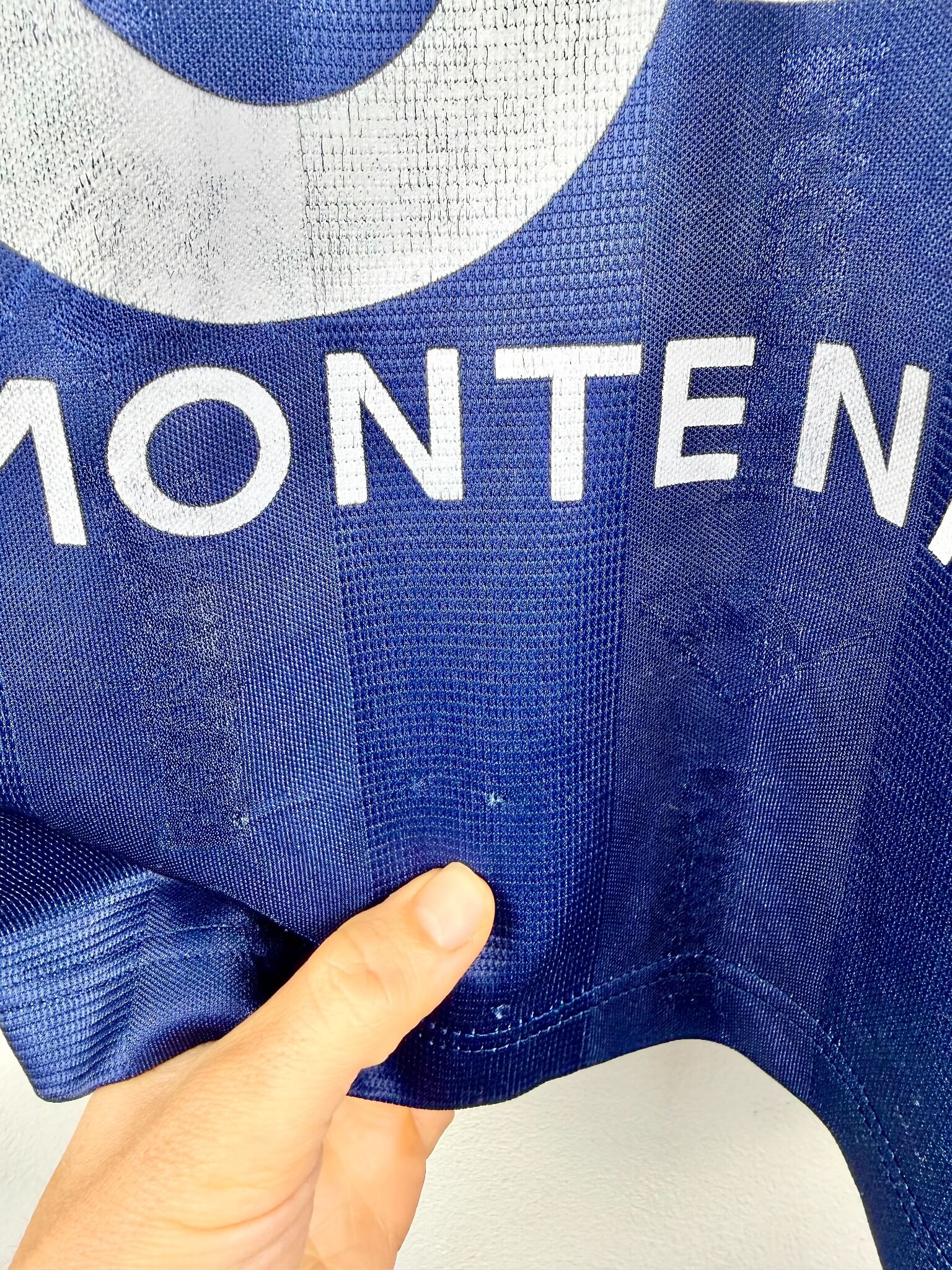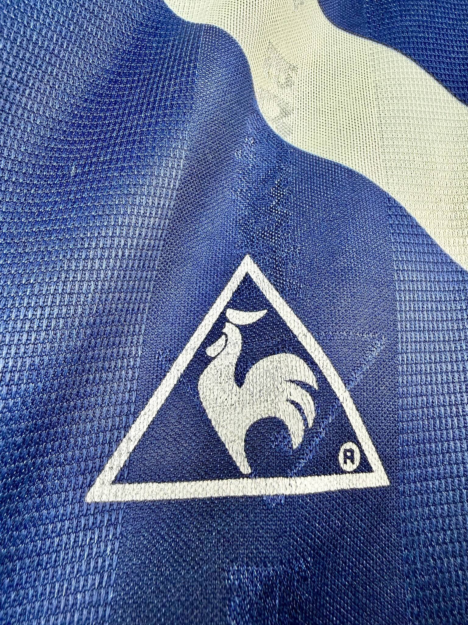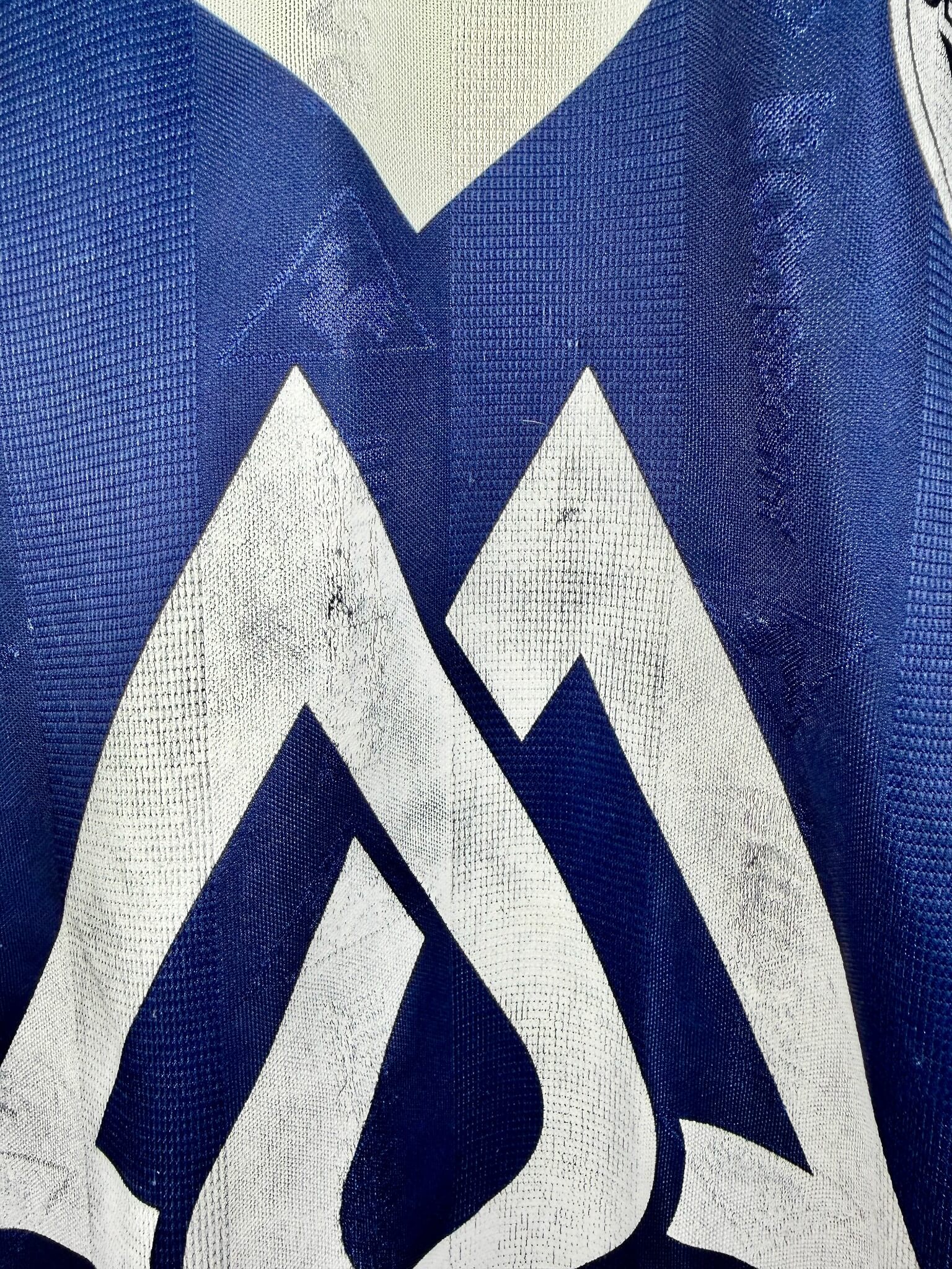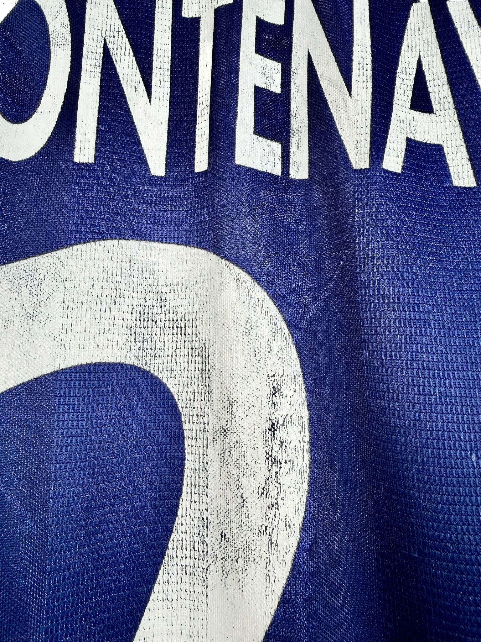 Taille : M Largeur : 55cm (aisselle à aisselle) Longueur : 71cm (base du col au bas) Si tu veux plus de détails, tu peux nous contacter par mail ou sur les réseaux 😉 Etat : 7/10, bon état général mais les flocages sont abimés (voir photos) Le maillot : maillot vintage domicile des Girondins de Bordeaux 1996/1997 préparé (match issue) ou porté (match worn) par le numéro 12 de la réserve : manches longues, sponsor différent de l’équipe A. On n’est pas sûr à 100% de la saison. L’écusson, le logo Le Coq Sportif, le sponsor Esys-Montenay sont floqués.…