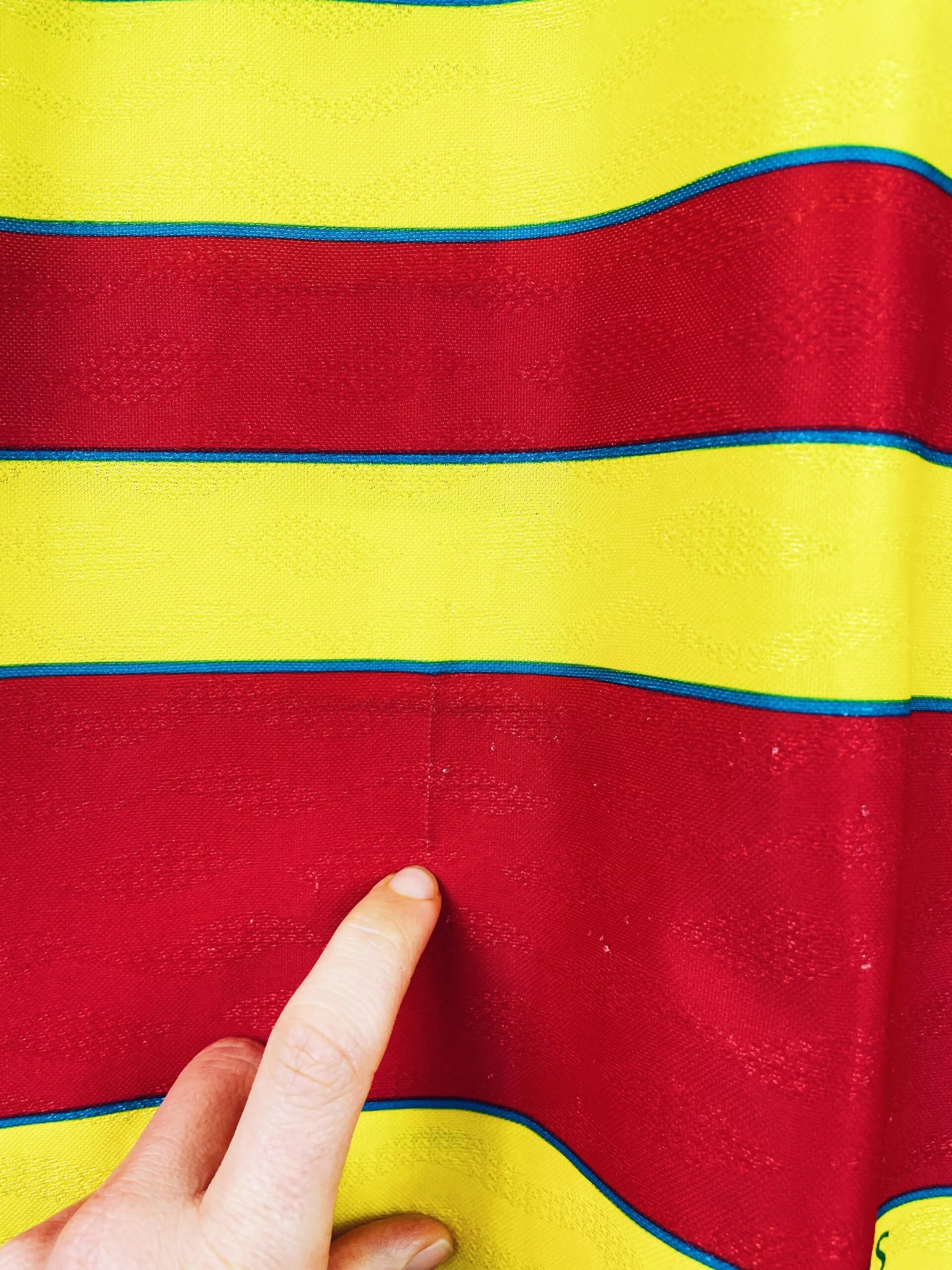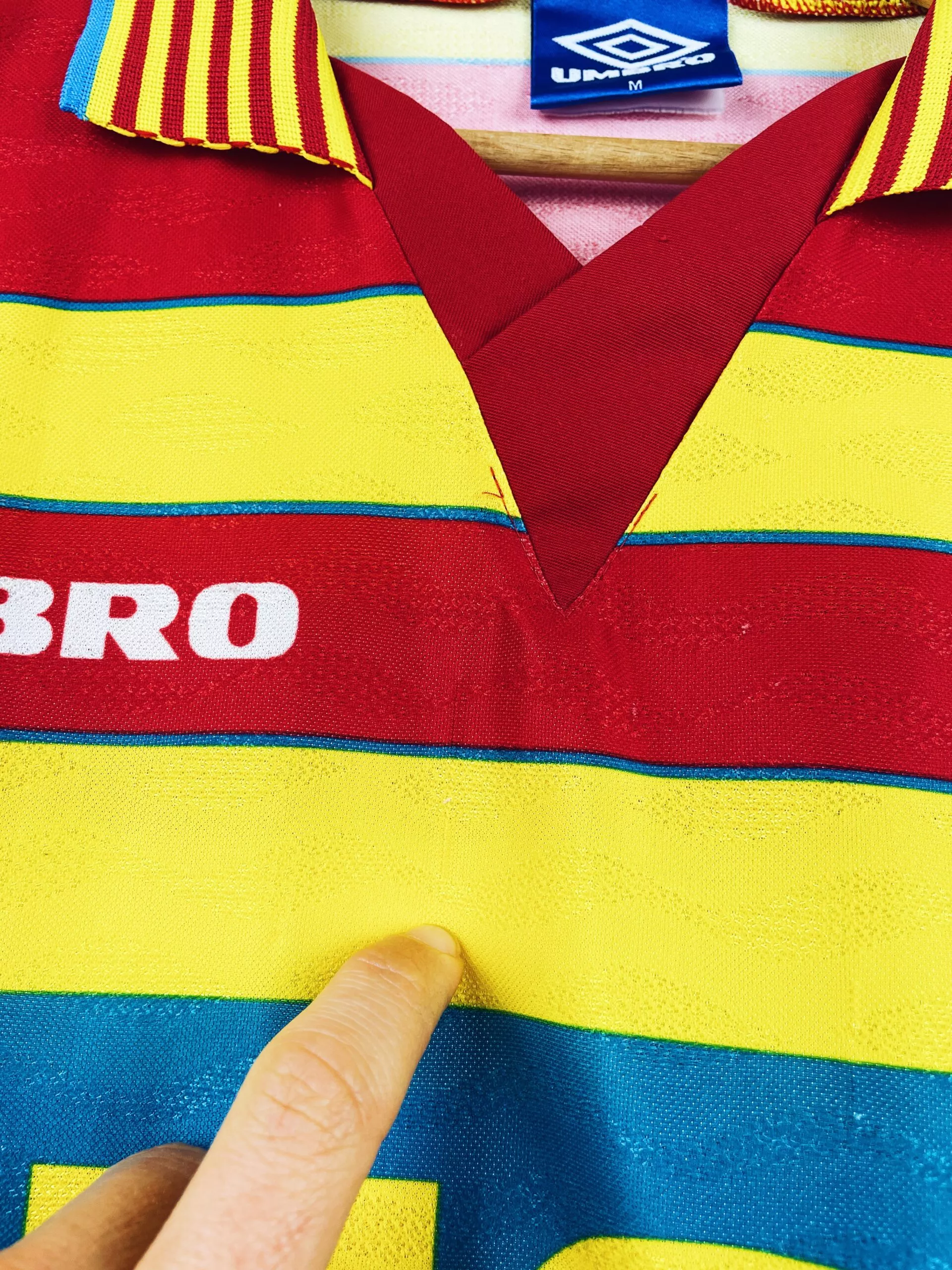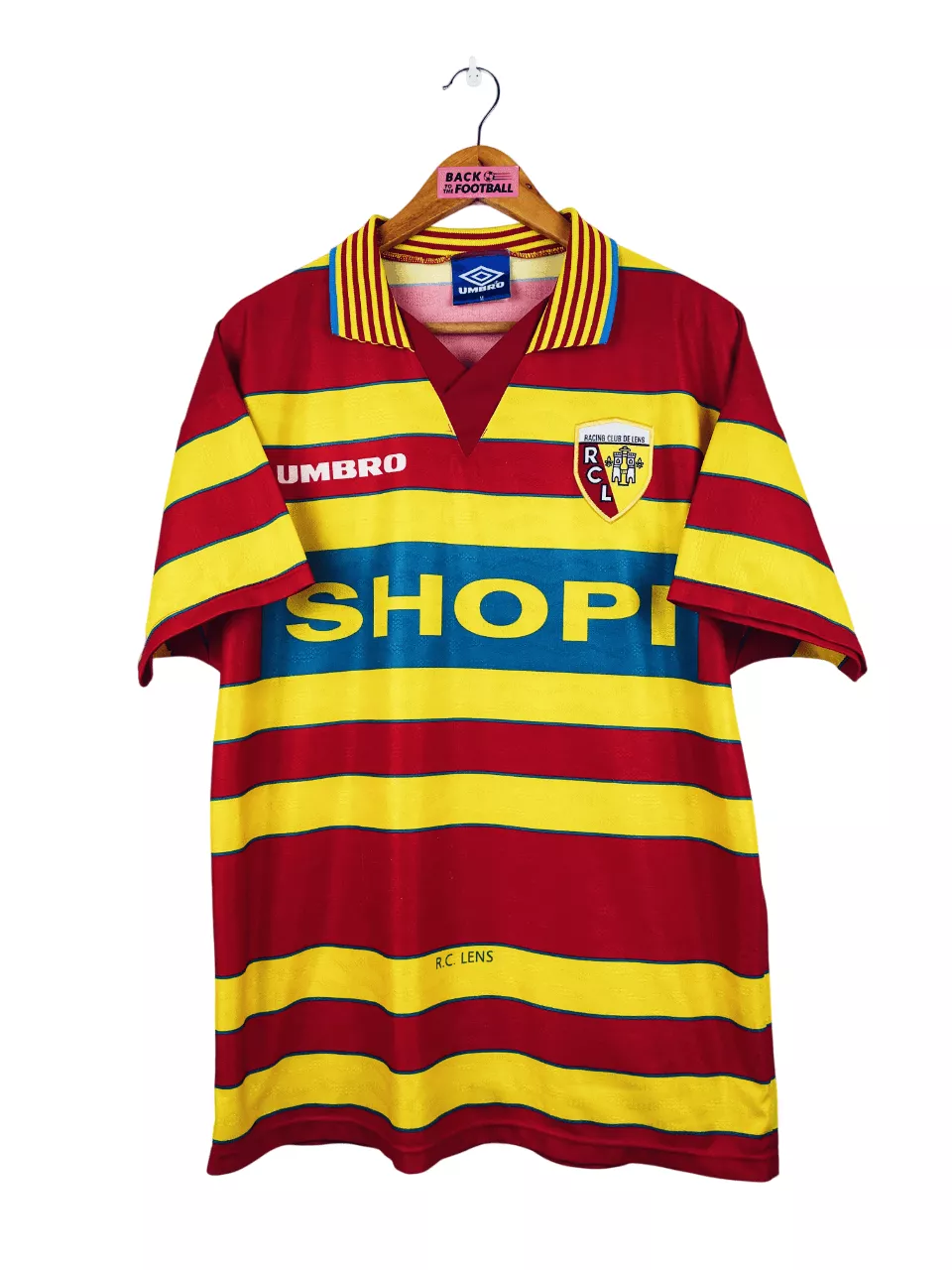 Taille : M Largeur : 53cm (aisselle à aisselle) Longueur : 73cm (base du col au bas) Si tu veux plus de détails, tu peux nous contacter par mail ou sur les réseaux 😉 Etat : 8/10, très bon état hormis des micros accrocs (voir photos) Le maillot : maillot vintage domicile du RC Lens 1996/1997. L’écusson est brodé, le logo Umbro et le sponsor sont incrustés. Très beau maillot rétro de Lens ! Histoire : les Sang et Or terminent à la 13ème place de Division 1. Ils seront éliminés en 16èmes de Coupe de France et quarts de…