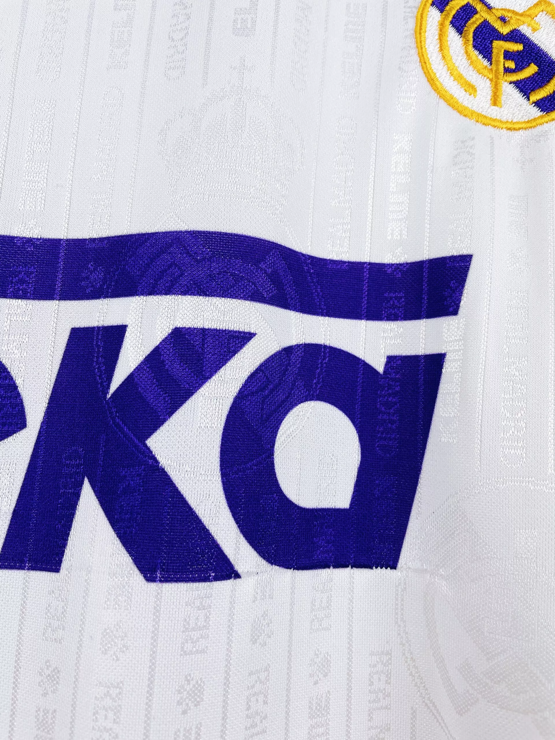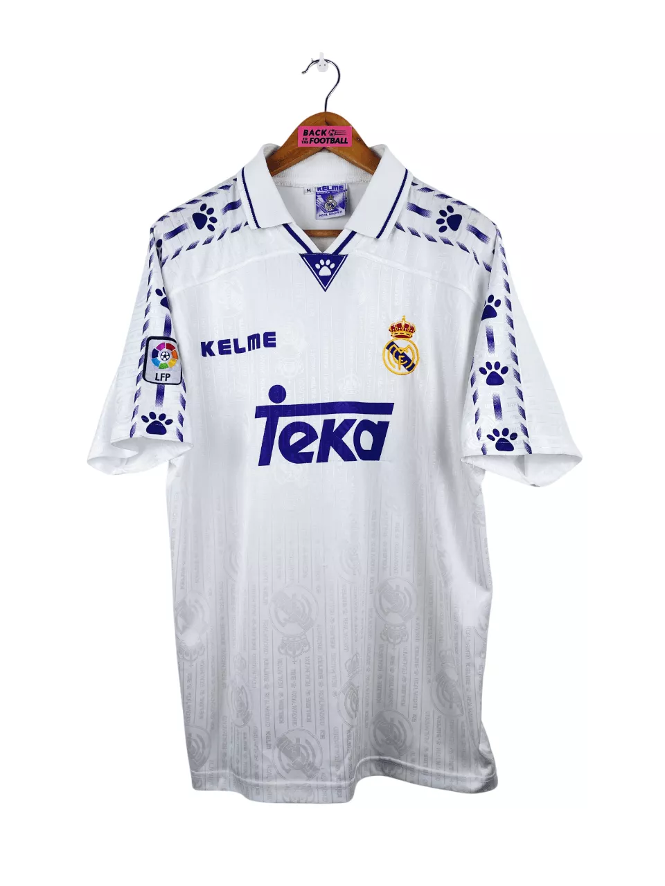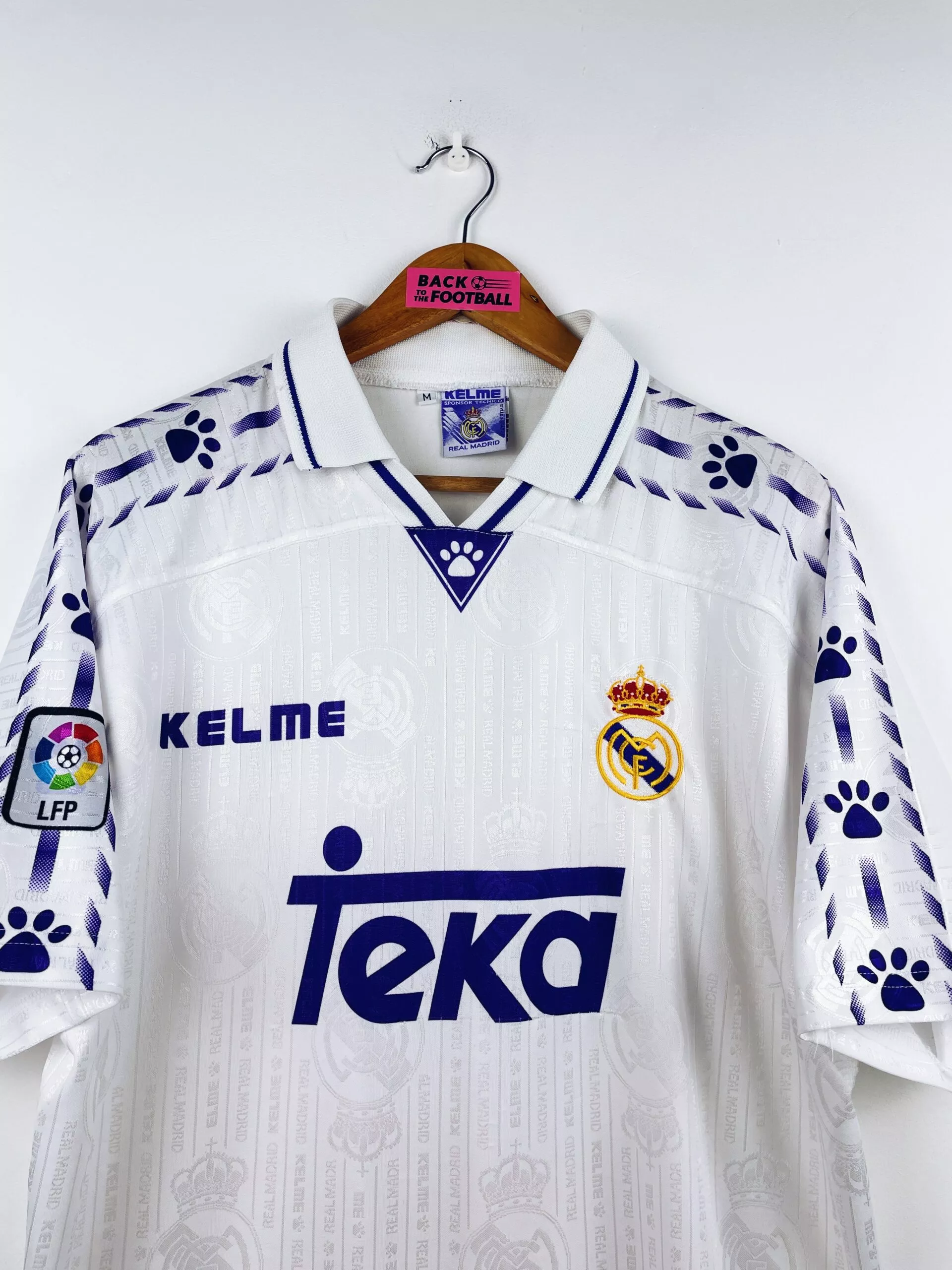 Taille : M, taille large Largeur : 56cm (aisselle à aisselle) Longueur : 73cm (base du col au bas) Si tu veux plus de détails, tu peux nous contacter par mail ou sur les réseaux 😉 Etat : 8/10, très bon état, léger accroc au niveau du sponsor, quelques bouloches (voir photo) Le maillot : maillot vintage domicile du Real Madrid 1996/1997. L’écusson est brodé, le logo Kelme et le sponsor Teka sont incrustés. Le patch Liga sur la manche l’est aussi. On peut voir en tramé l’écusson du Real et le logo Kelme. Très beau maillot rétro du Real…