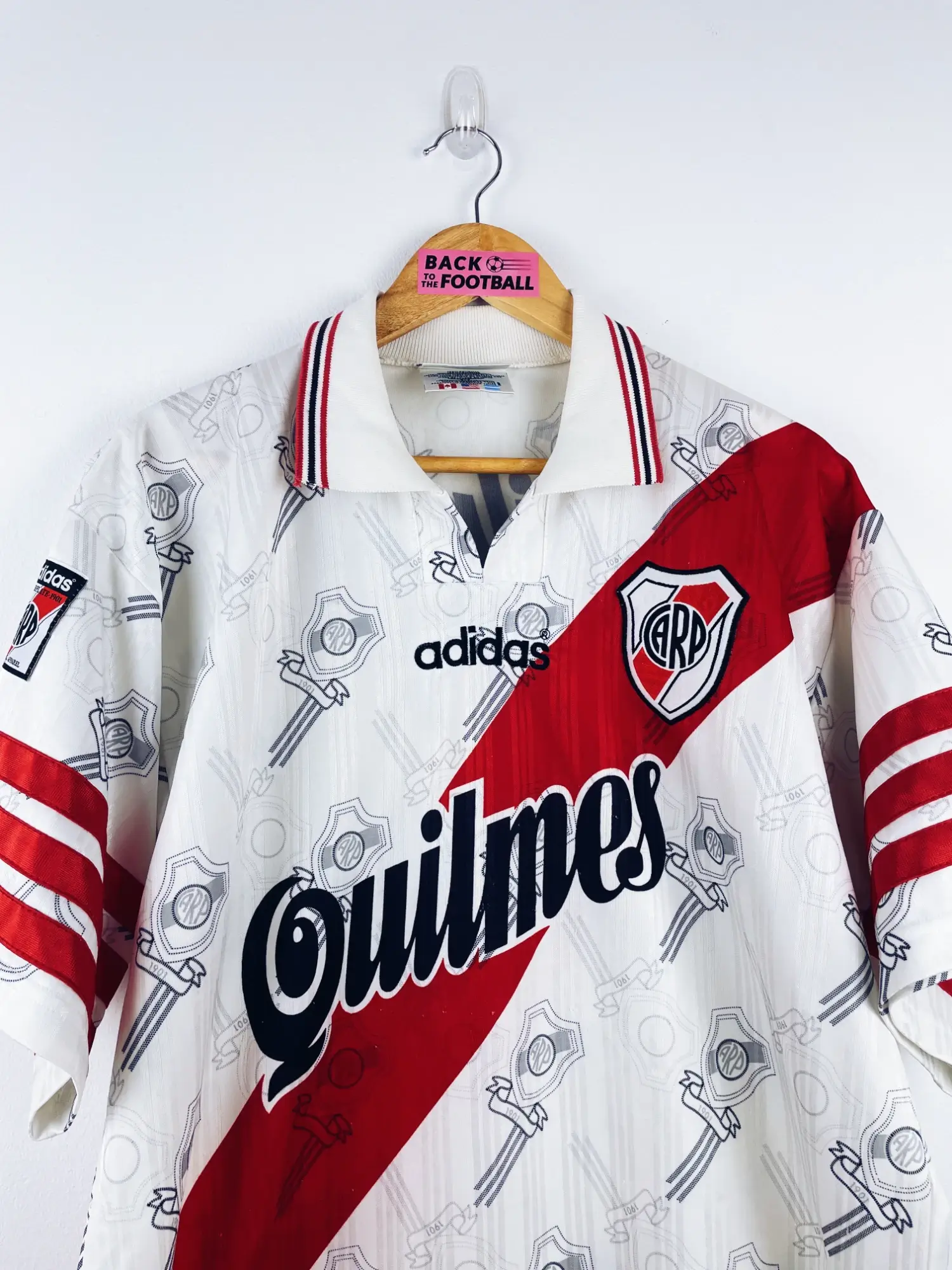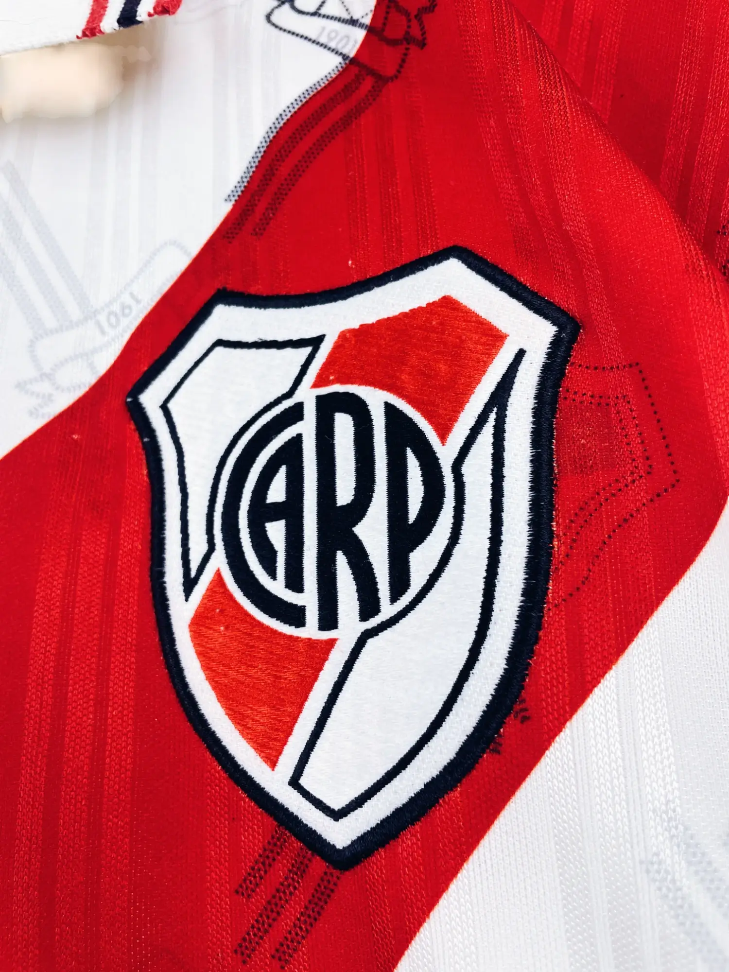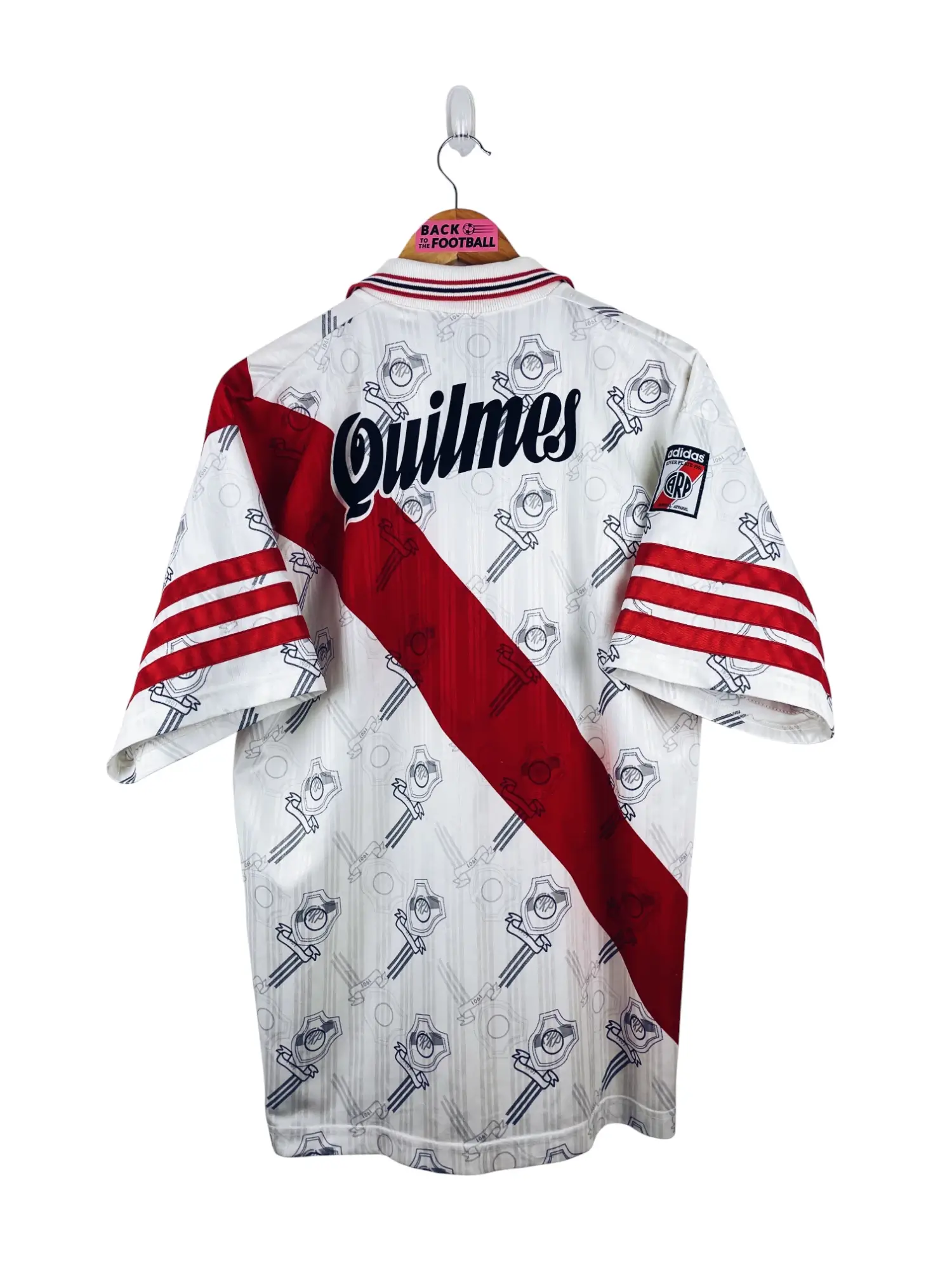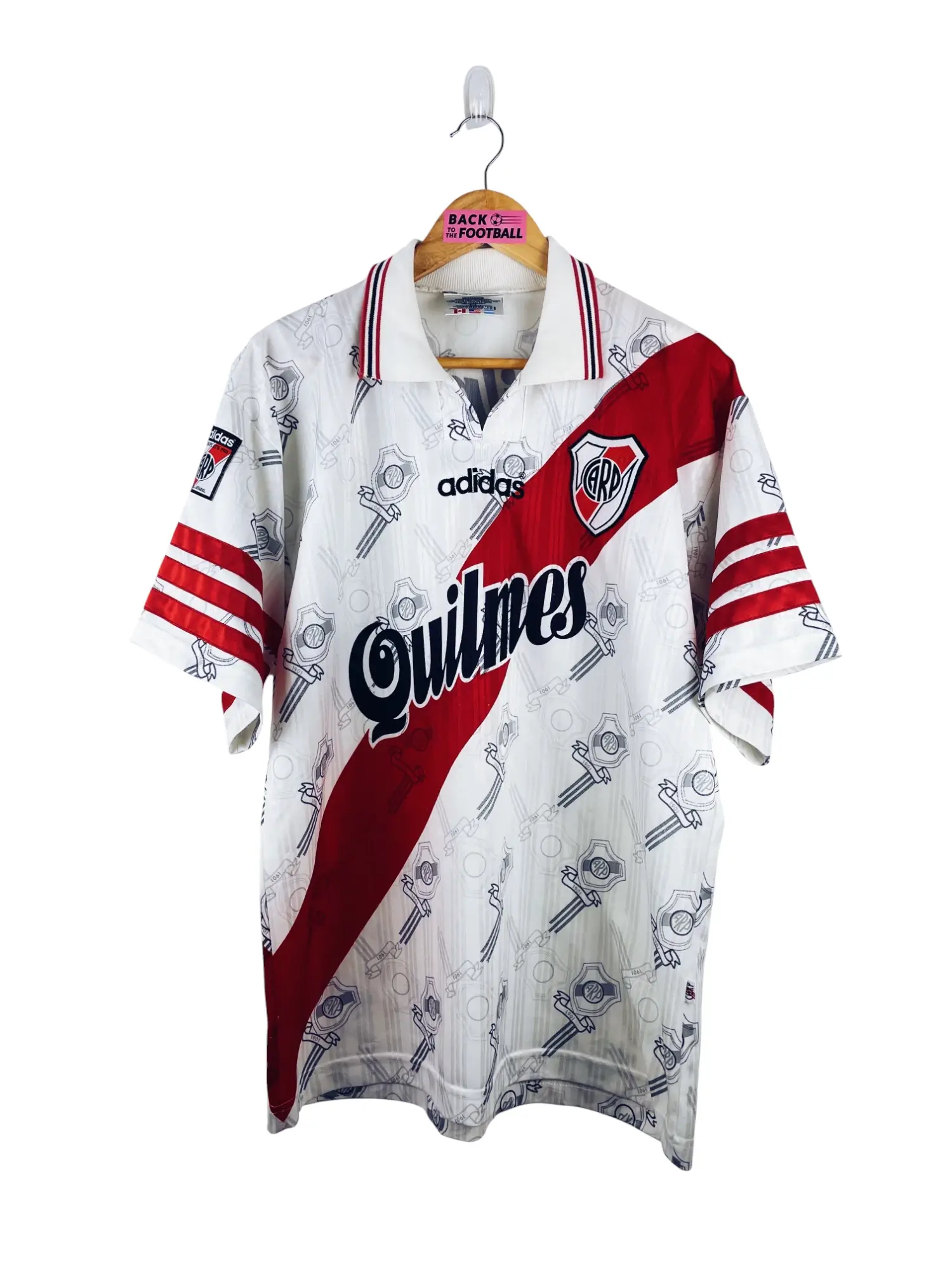 Taille : L Largeur : 55cm (aisselle à aisselle) Longueur : 74cm (base du col au bas) Si tu veux plus de détails, tu peux nous contacter par mail ou sur les réseaux 😉 Etat : 8/10, très bon état, quelques bouloches, légère trace en bas (voir photos) Le maillot : maillot vintage domicile de River Plate 1996/1997. L’écusson et le logo Adidas sont brodés. Le sponsor Quilmes est incrusté. On peut voir l’écusson en tramé sur tout le maillot. Très beau maillot rétro de River Plate ! Histoire : énorme saison du Club Atlético River Plate avec une victoire…