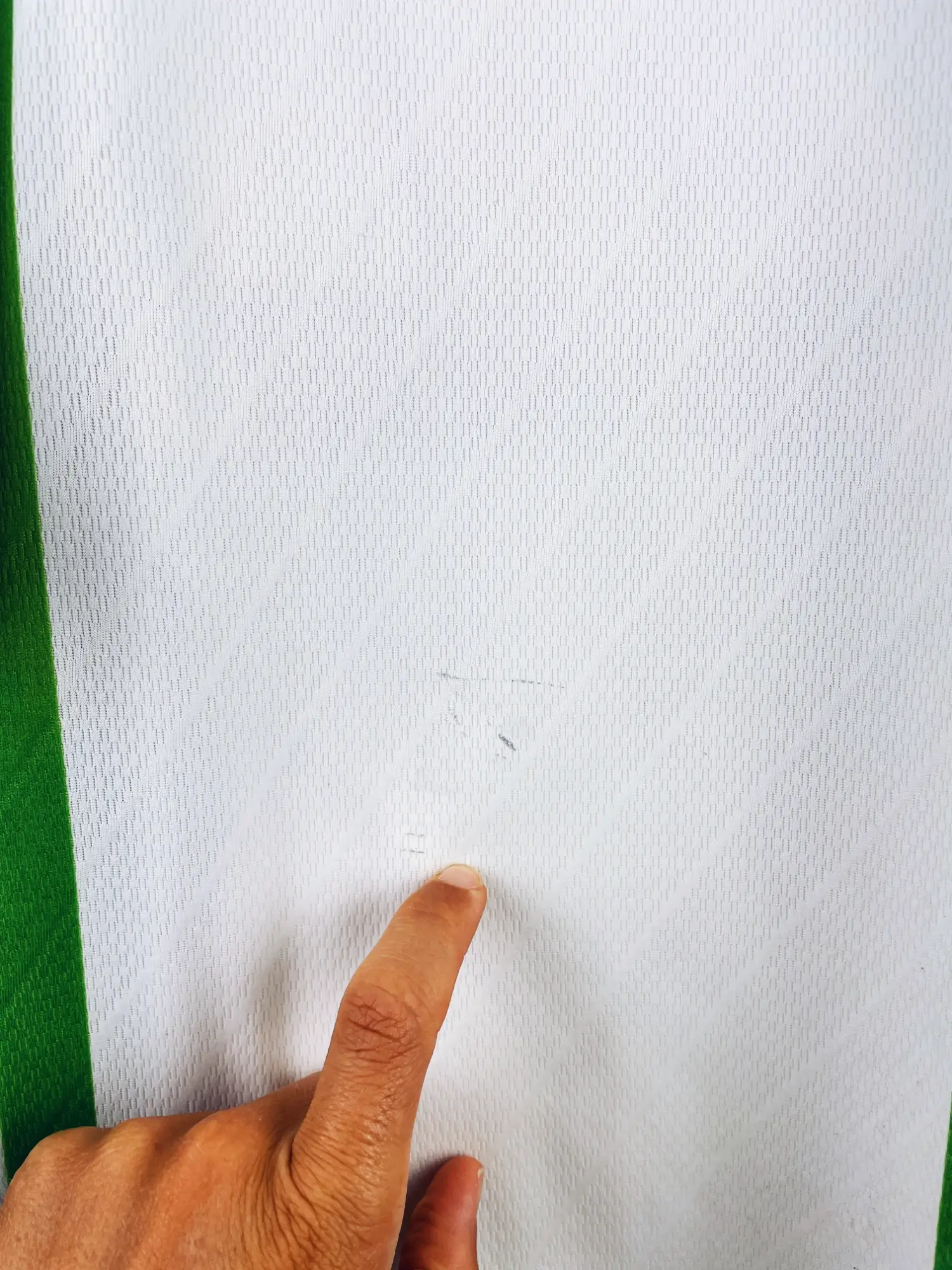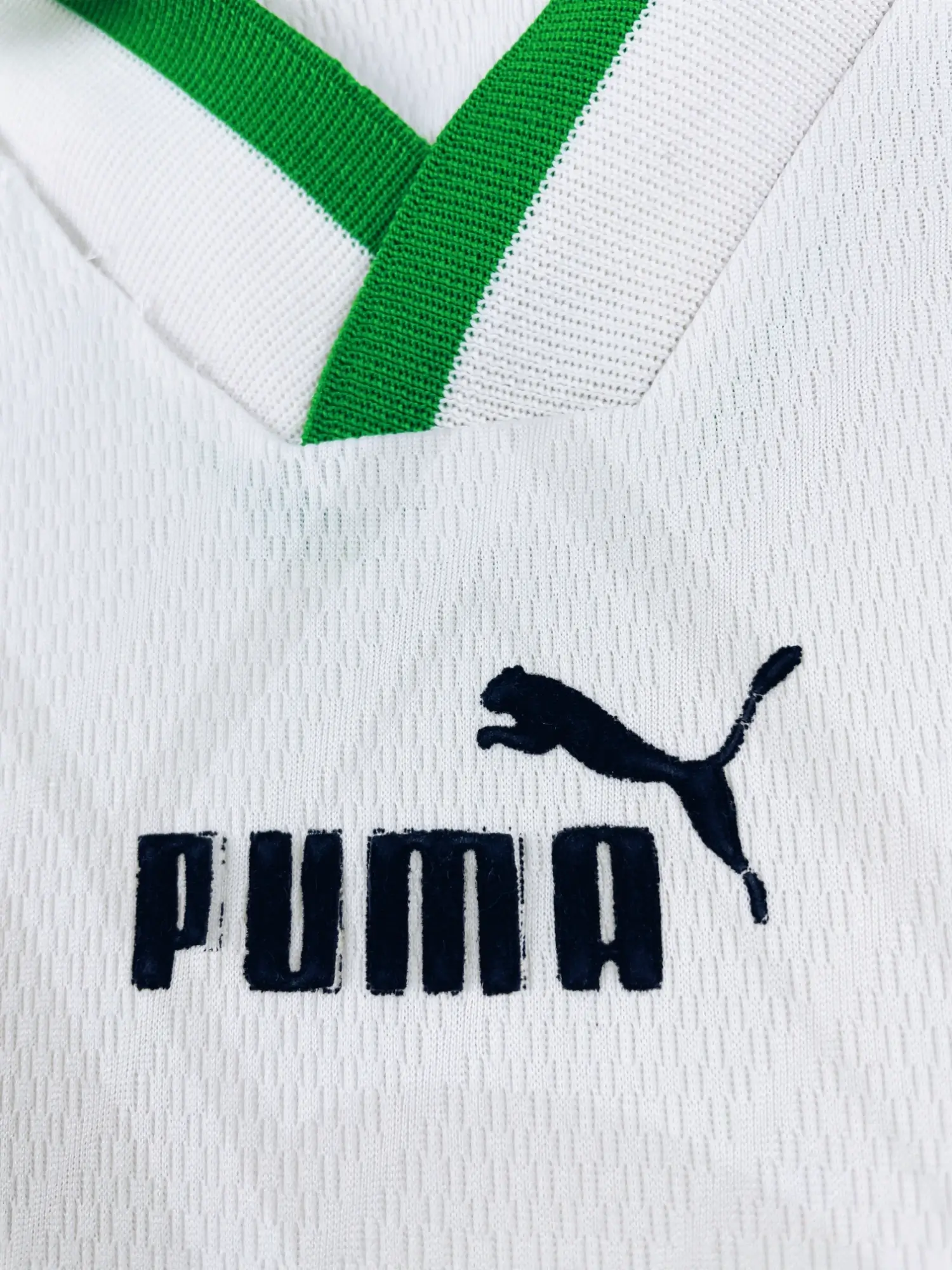 Taille : XL Largeur : 60cm (aisselle à aisselle) Longueur : 74cm (base du col au bas) Si tu veux plus de détails, tu peux nous contacter par mail ou sur les réseaux 😉 Etat : 6/10, bon état général mais des défauts dans le dos et le logo Puma se décolle légèrement (voir photos) Le maillot : maillot vintage domicile du Werder Brême 1996/1997. L’écusson est brodé, le logo Puma, le sponsor DBV et le patch Bundesliga sont en feutrine. Joli maillot rétro du Werder ! Histoire : le Werder Bremen termine à la 8ème place de Bundesliga. Le…