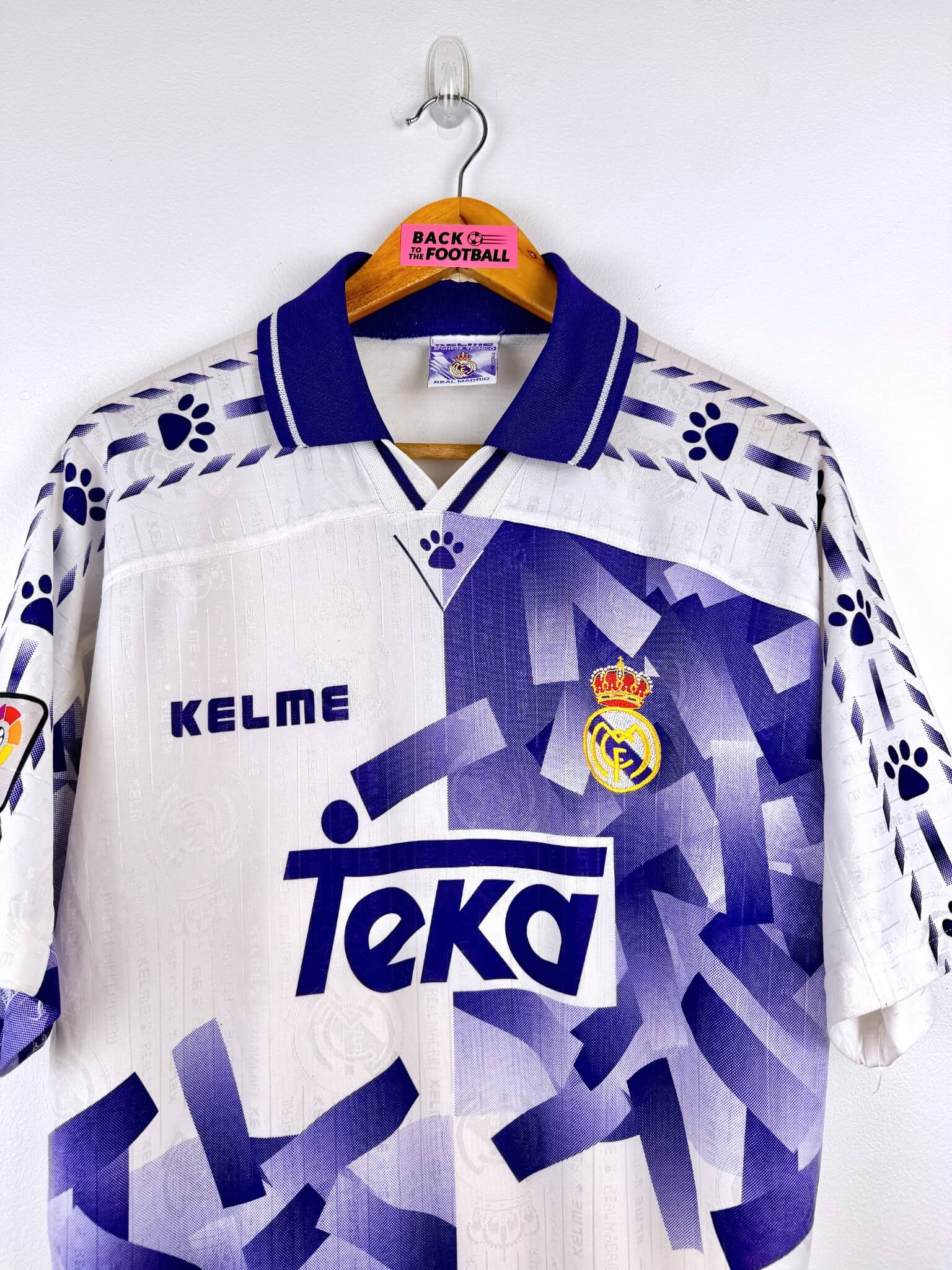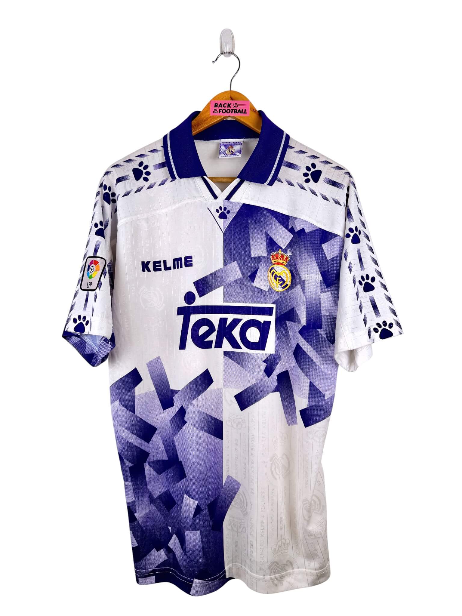 Taille : M – taille oversize Largeur : 55cm (aisselle à aisselle) Longueur : 75cm (base du col au bas) Si tu veux plus de détails, tu peux nous contacter par mail ou sur les réseaux 😉 Etat : 8.5/10, excellent état, mini accroc en bas du dos (voir photo) Le maillot : maillot vintage third du Real Madrid 1996/1997. L’écusson est brodé, le logo Kelme, le sponsor Teka et le patch Liga sur la manche sont incrustés. On peut voir en tramé l’écusson du Real et le logo Kelme. Très beau maillot rétro du Real Madrid ! Histoire :…