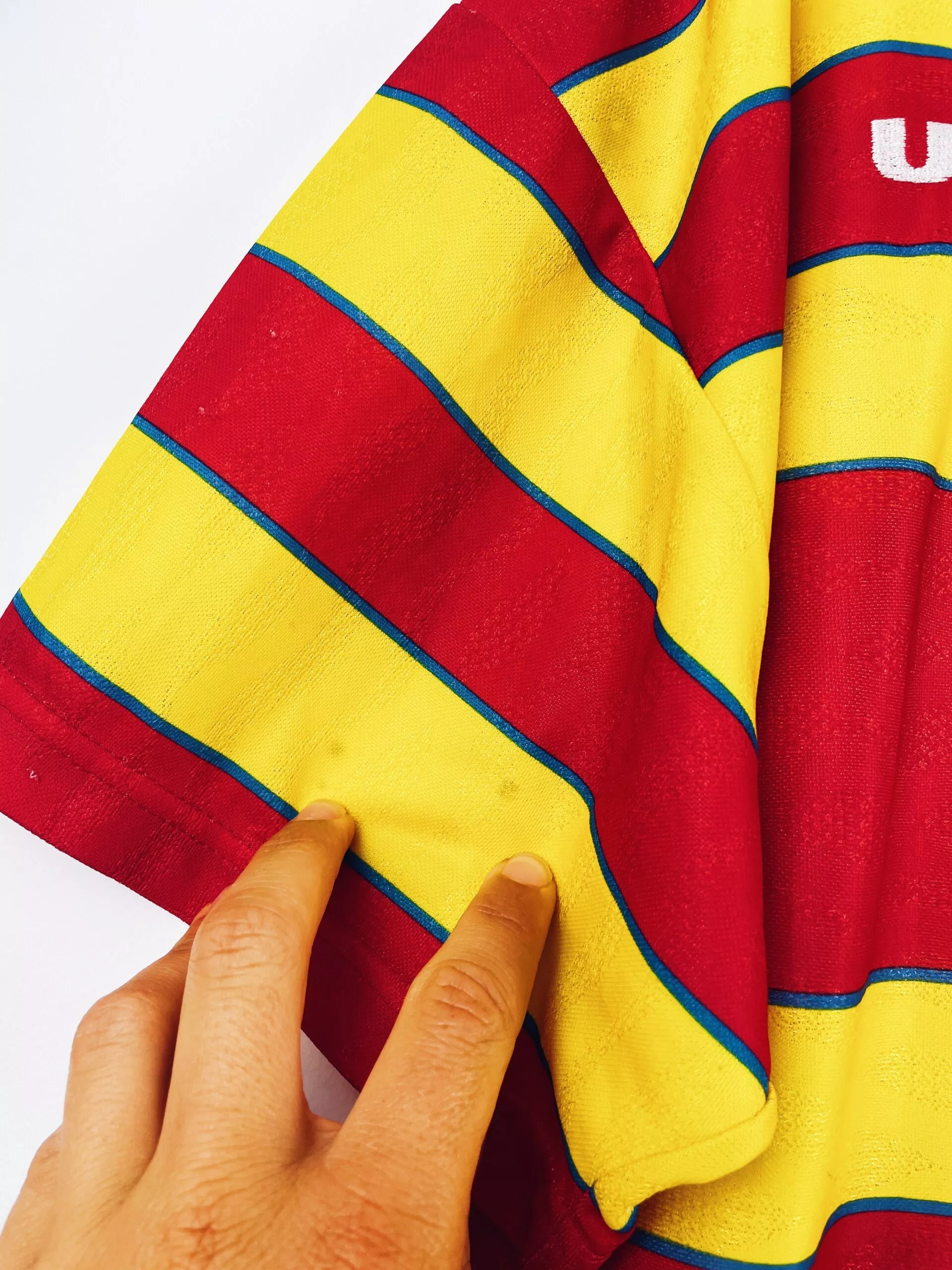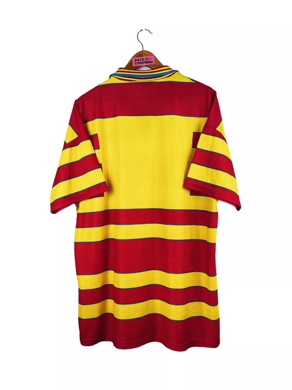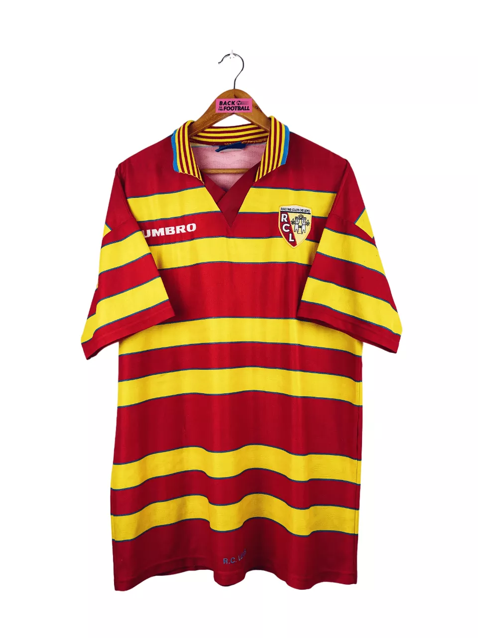 Taille : XL Si tu veux plus de détails, tu peux nous contacter par mail ou sur les réseaux 😉 Etat : 8/10, très bon état, micros traces sur les manches (voir photos) Le maillot : maillot vintage domicile du RC Lens 1996/1997 issu du stock pro (player issue) : pas de sponsor, logo RC Lens brodé en bas de la face avant, place pour le numéro au dos. Très beau maillot rétro de Lens ! Histoire : les Sang et Or terminent à la 13ème place de Division 1. Ils seront éliminés en 16èmes de Coupe de France et…
