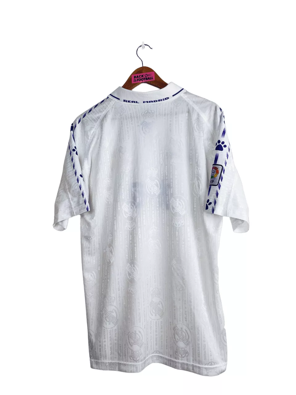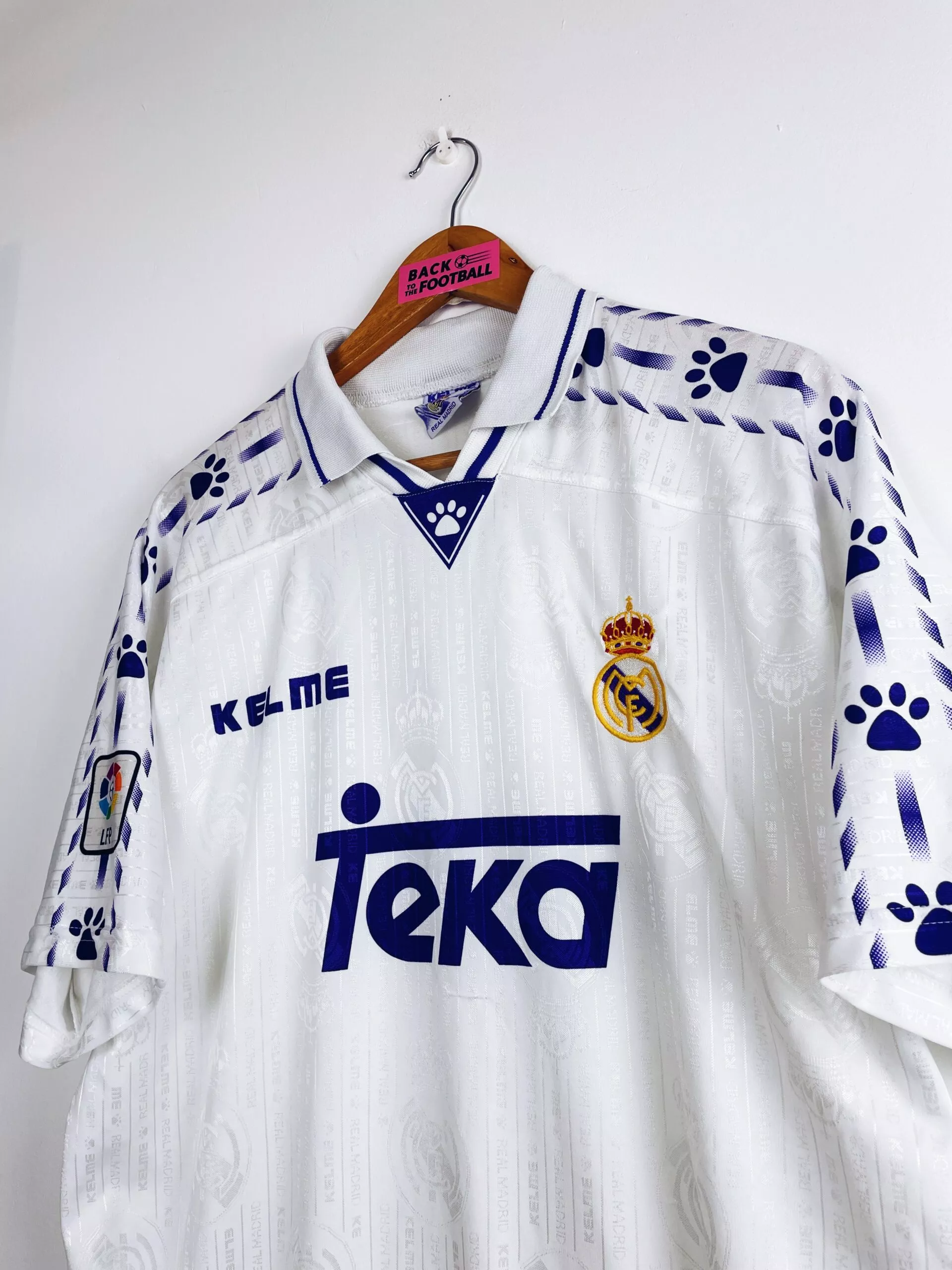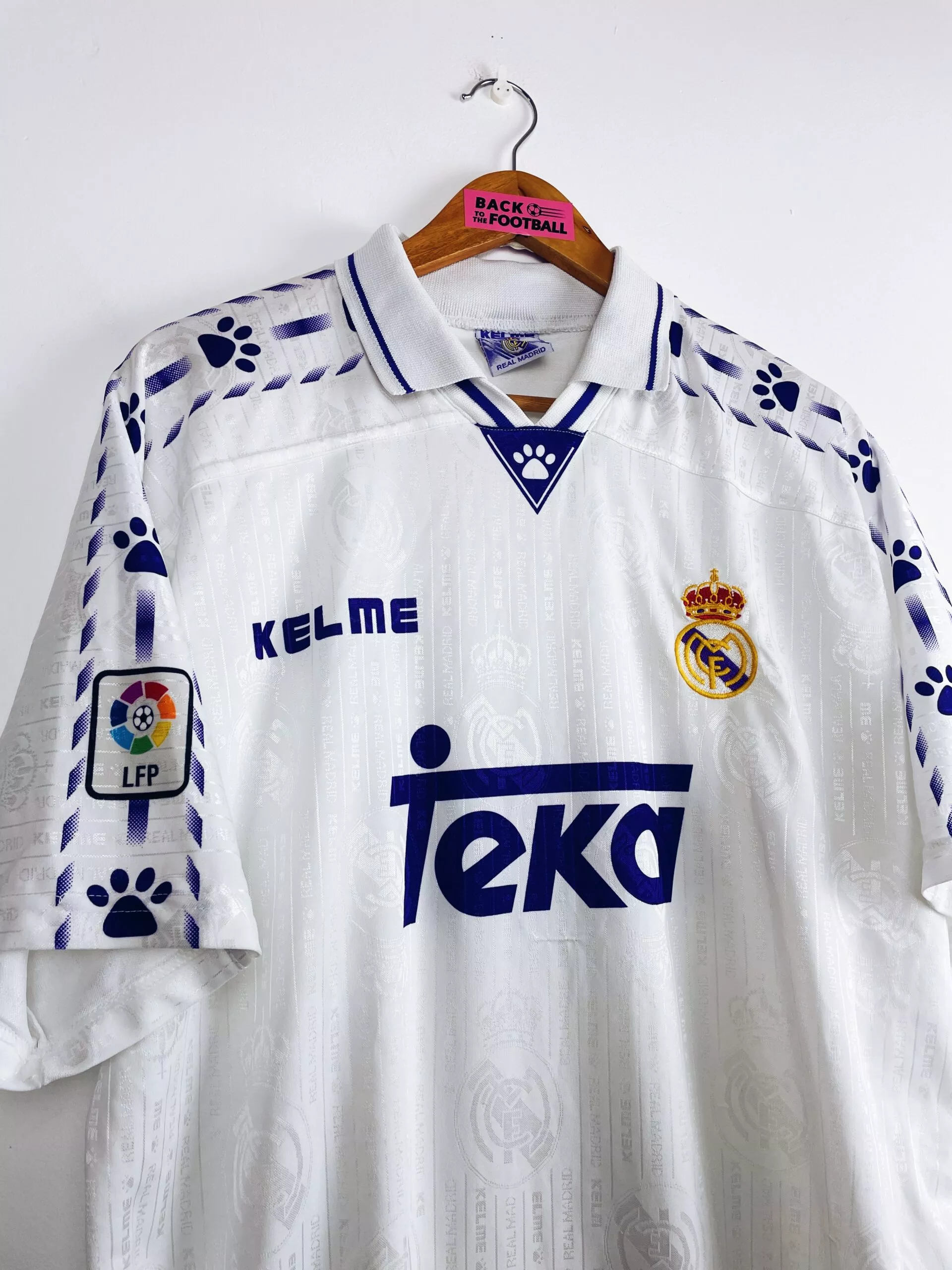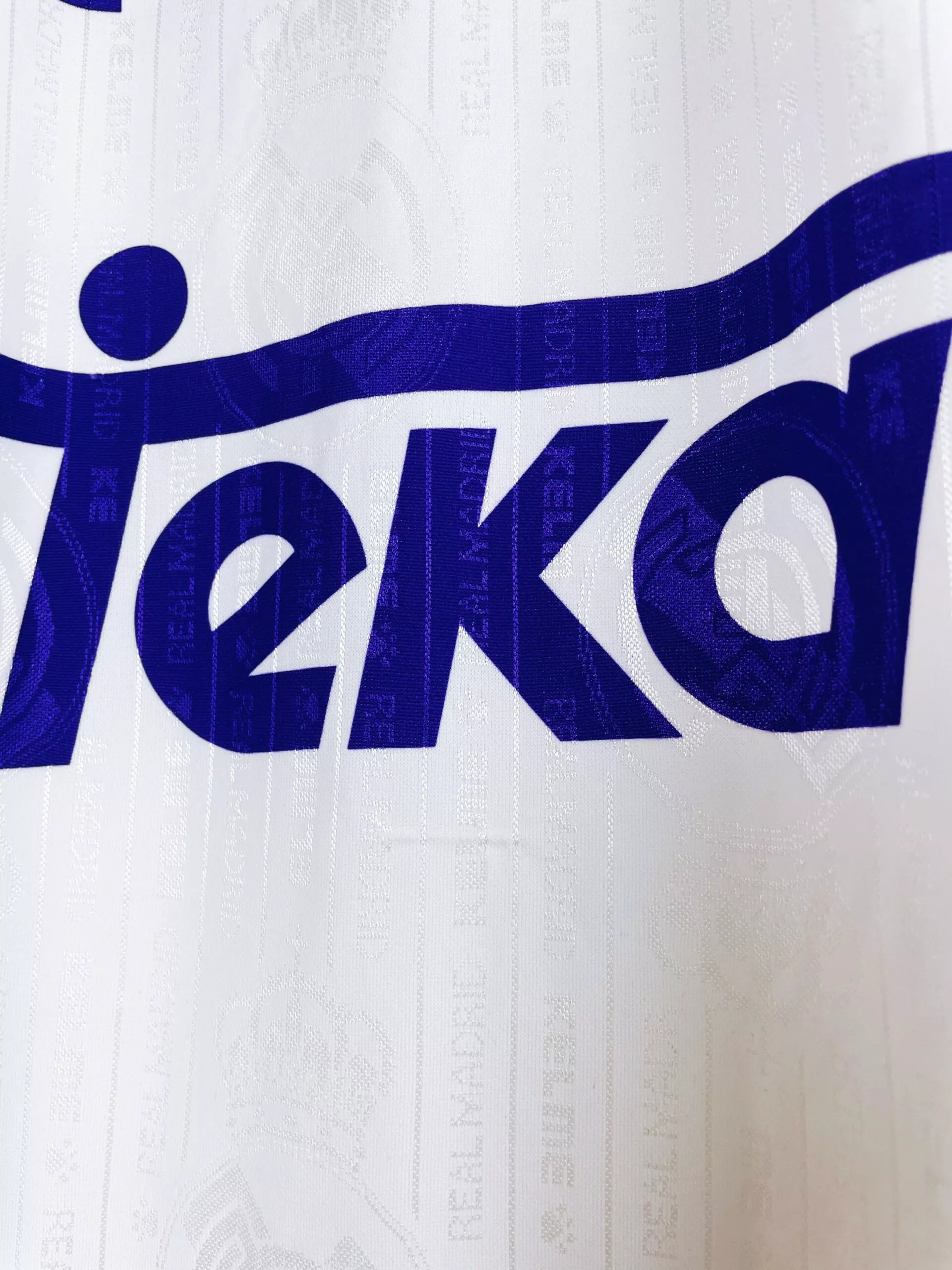 Taille : L/XL Largeur : 58cm (aisselle à aisselle) Longueur : 72cm (base du col au bas du maillot) Si tu veux plus de détails, tu peux nous contacter par mail ou sur les réseaux 😉 Etat : 8/10, très bon état, léger accro en bas du sponsor (voir photo) Le maillot : maillot vintage domicile du Real Madrid 1996/1997. L’écusson est brodé, le logo Kelme et le sponsor Teka sont incrustés. Le patch Liga sur la manche l’est aussi. On peut voir en tramé l’écusson du Real et le logo Kelme. Les pattes sur les manches sont magnifiques. Très…