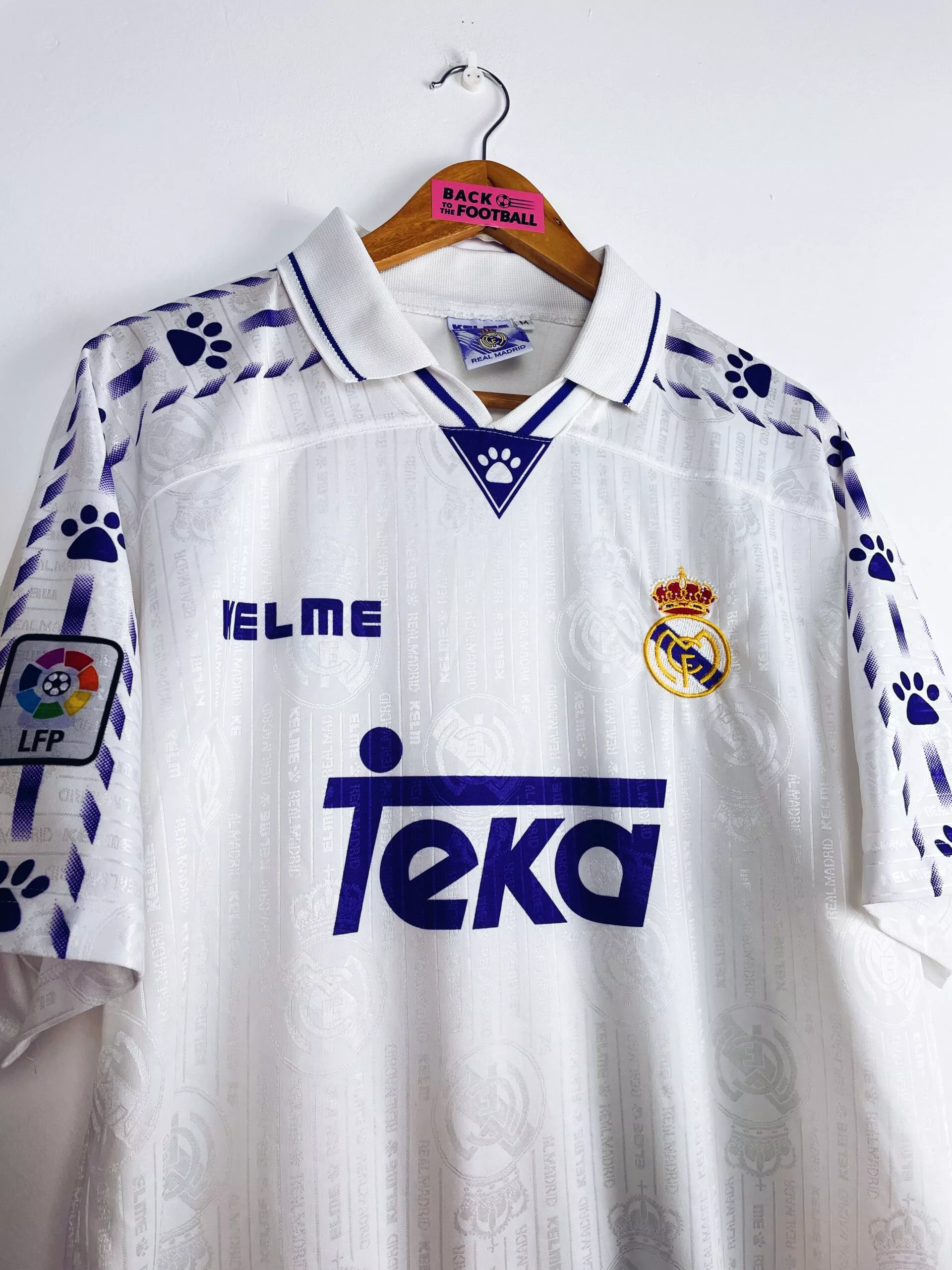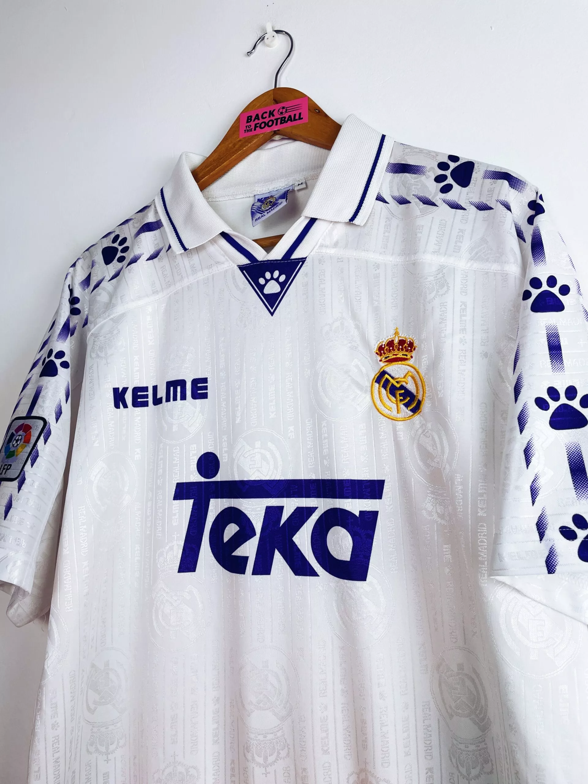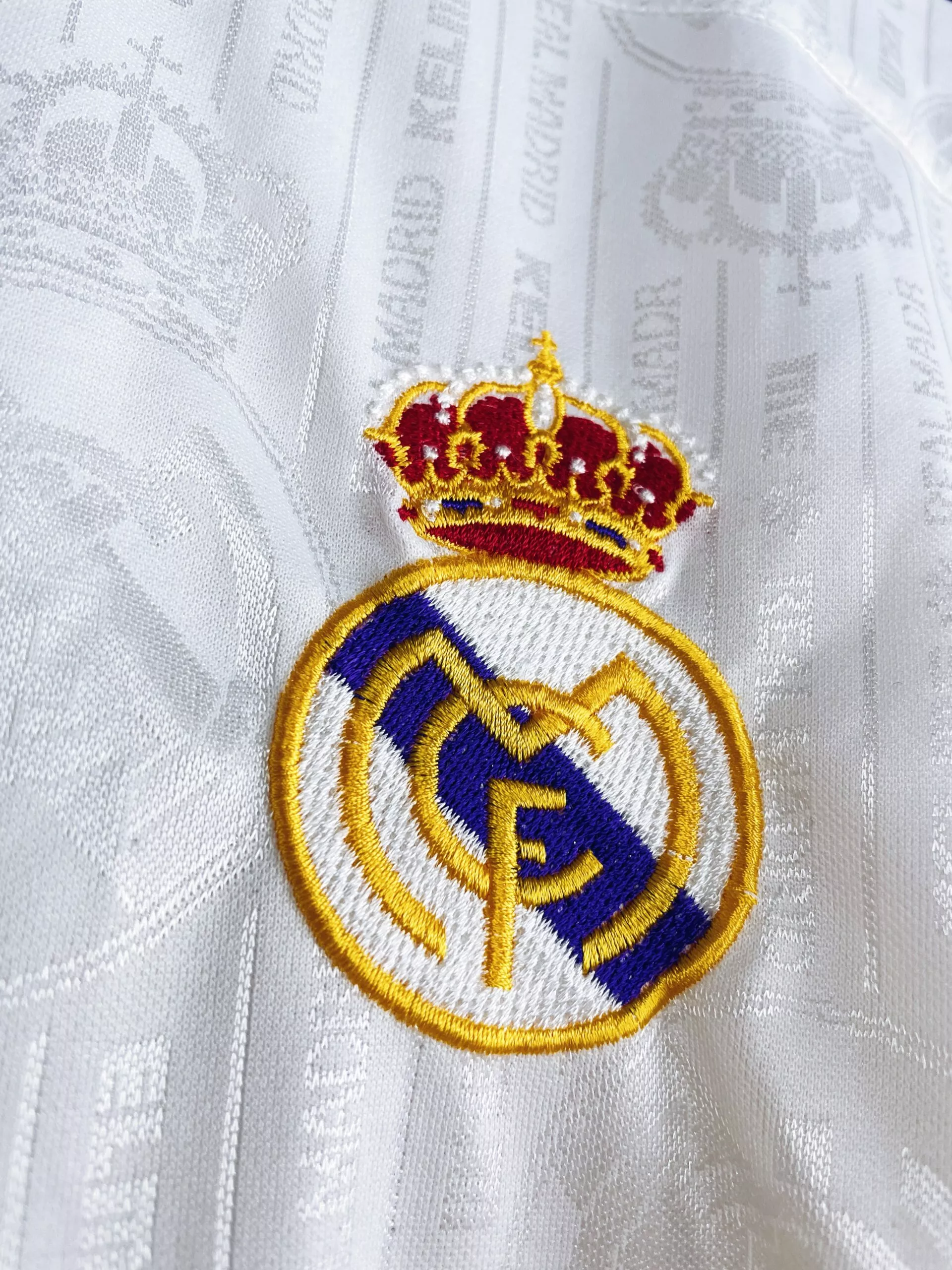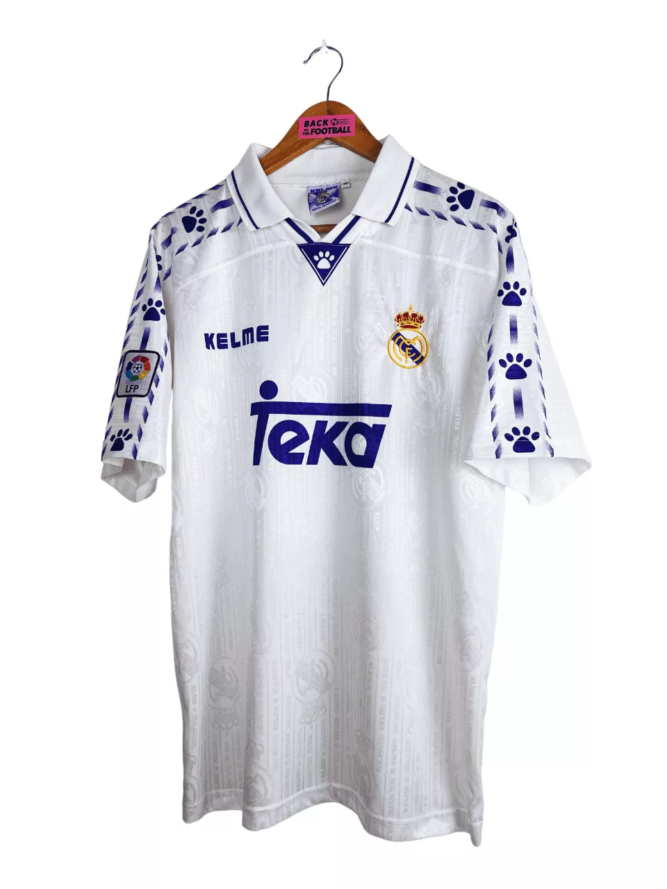 Taille : M Si tu veux plus de détails, tu peux nous contacter par mail ou sur les réseaux 😉 Etat : 8.5/10, excellent état Le maillot : maillot vintage domicile du Real Madrid 1996/1997. L’écusson est brodé, le logo Kelme et le sponsor Teka sont incrustés. Le patch Liga sur la manche l’est aussi. On peut voir en tramé l’écusson du Real et le logo Kelme. Les pattes sur les manches sont magnifiques. Très beau maillot rétro du Real Madrid ! Histoire : grosse saison du Real qui remporte le championnat 2 points devant Barcelone. Les Madrilènes seront par…