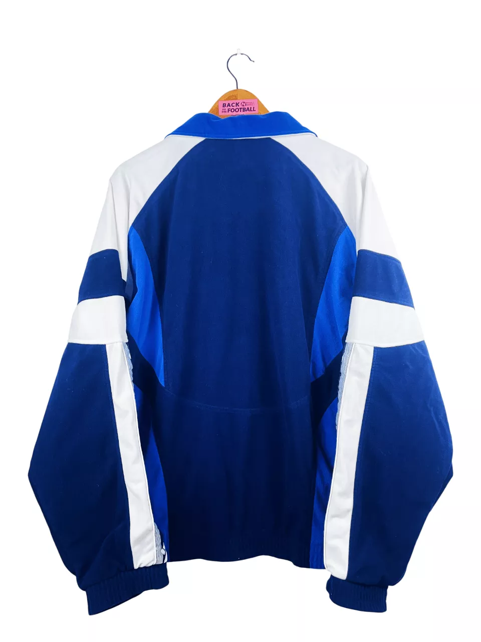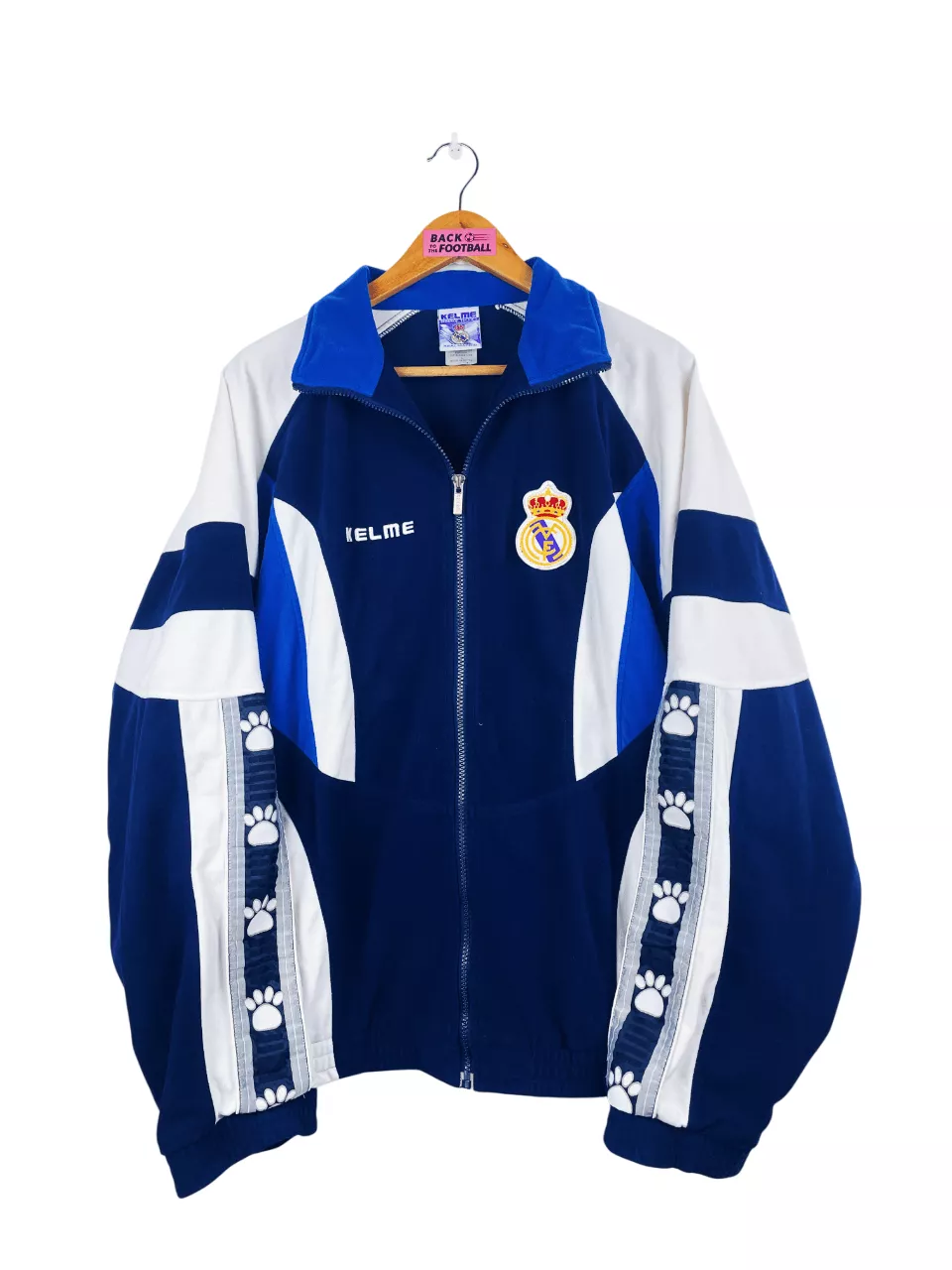 Taille : L Largeur : 63cm (aisselle à aisselle) Longueur : 70cm Si tu veux plus de détails, tu peux nous contacter par mail ou sur les réseaux 😉 Etat : 8.5/10, excellent état La veste : veste vintage du Real Madrid 1996/1997. L’écusson et le logo Kelme sont brodés. Très belle veste rétro du Real Madrid ! Histoire : grosse saison du Real qui remporte le championnat 2 points devant Barcelone. Les Madrilènes seront par contre éliminés en 16èmes de Copa del Rey face à Barcelone justement. Suker sera le meilleur buteur avec 29 réalisations. Quelques joueurs : Raúl,…