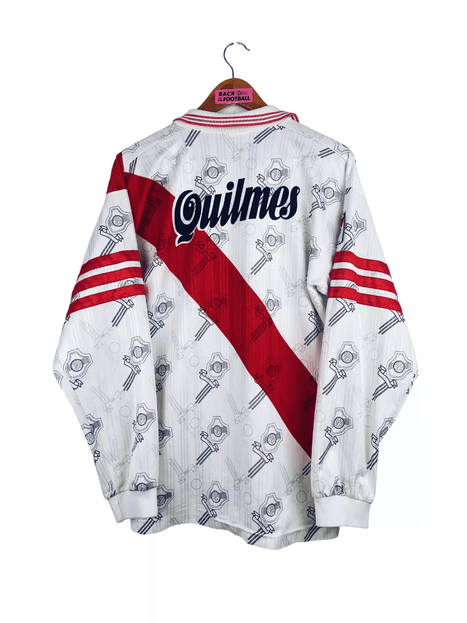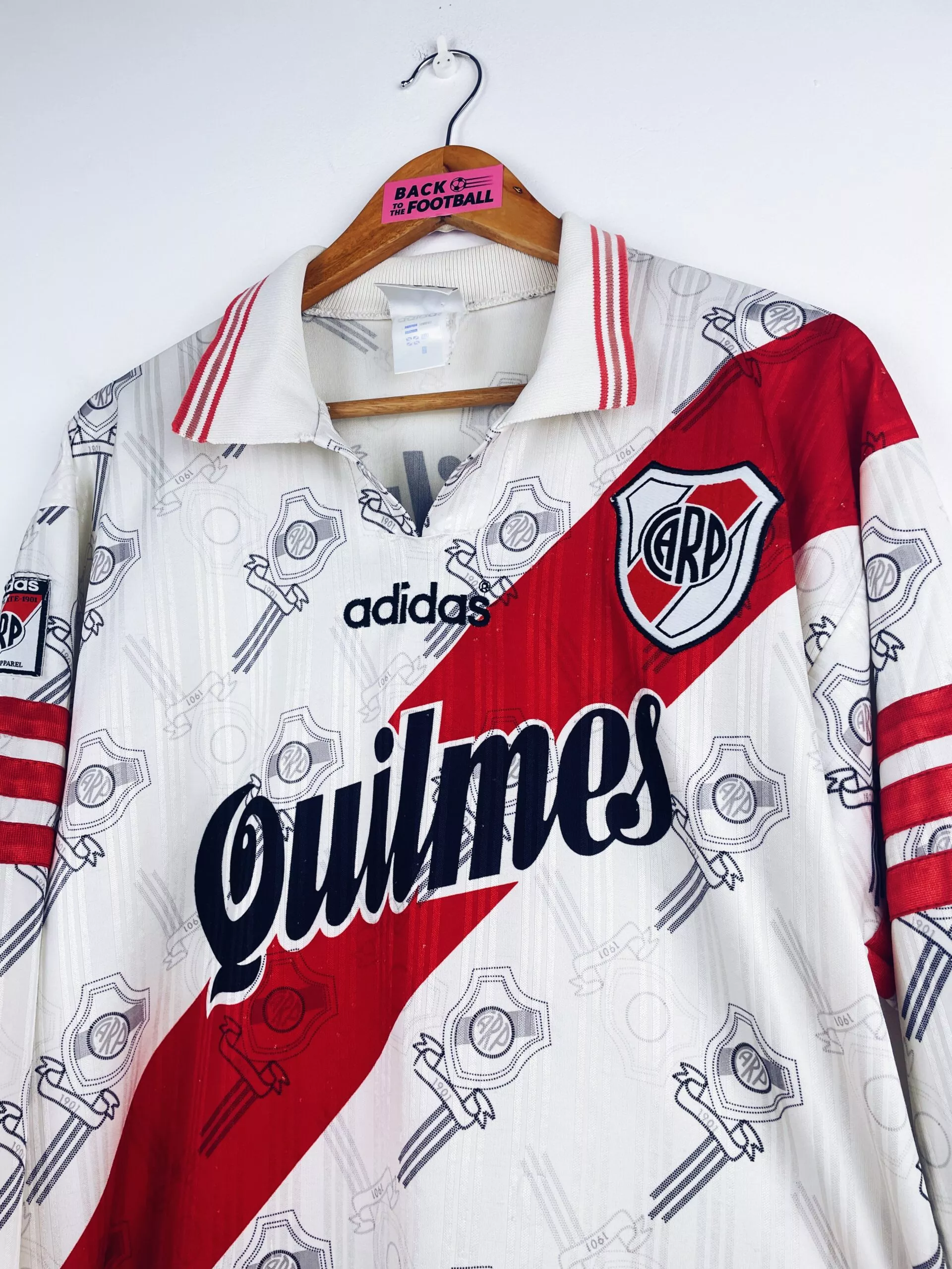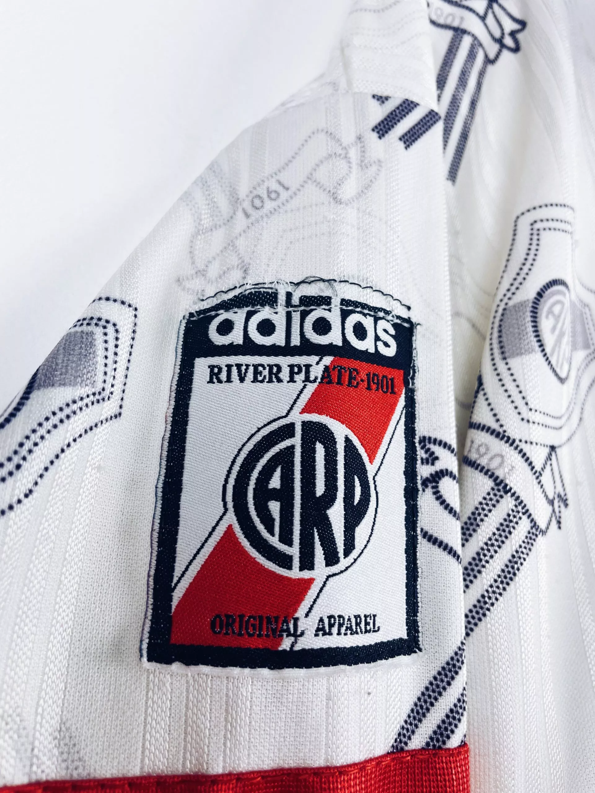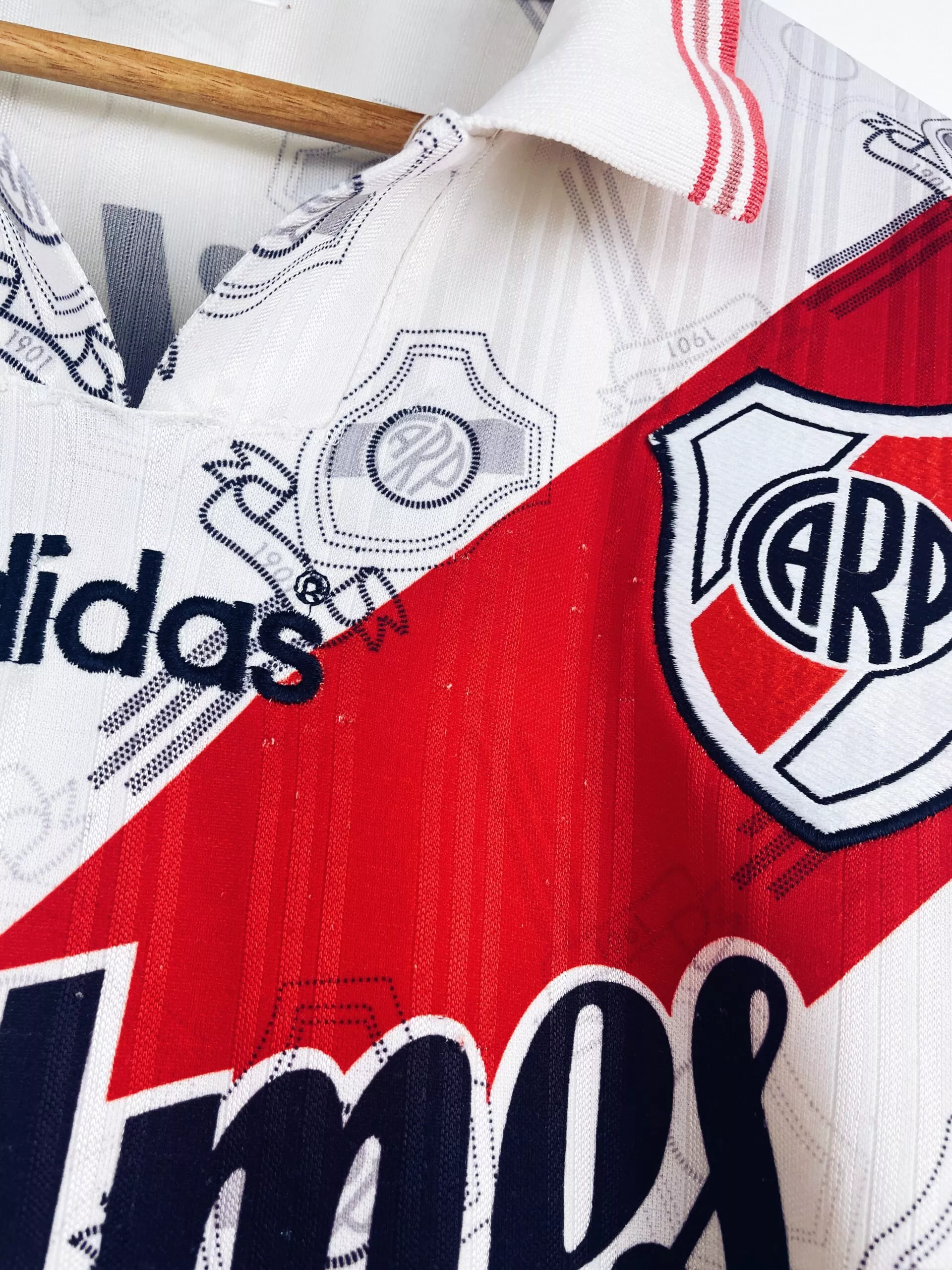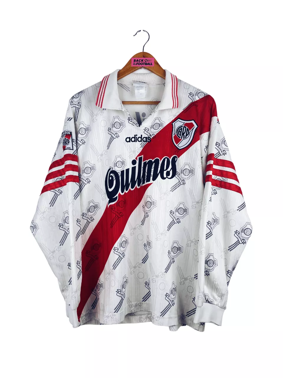 Taille : M Si tu veux plus de détails, tu peux nous contacter par mail ou sur les réseaux 😉 Etat : 8/10, très bon état mais des bouloches et le patch sur la manche a perdu des fils (voir photos) Le maillot : maillot vintage de River Plate 1996/1997 domicile manches longues. L’écusson et le logo Adidas sont brodés. Le sponsor Quilmes est incrusté. On peut voir l’écusson en tramé sur tout le maillot. Très beau maillot rétro de River Plate ! Histoire : énorme saison du Club Atlético River Plate avec une victoire aux championnats d’ouverture et de…
