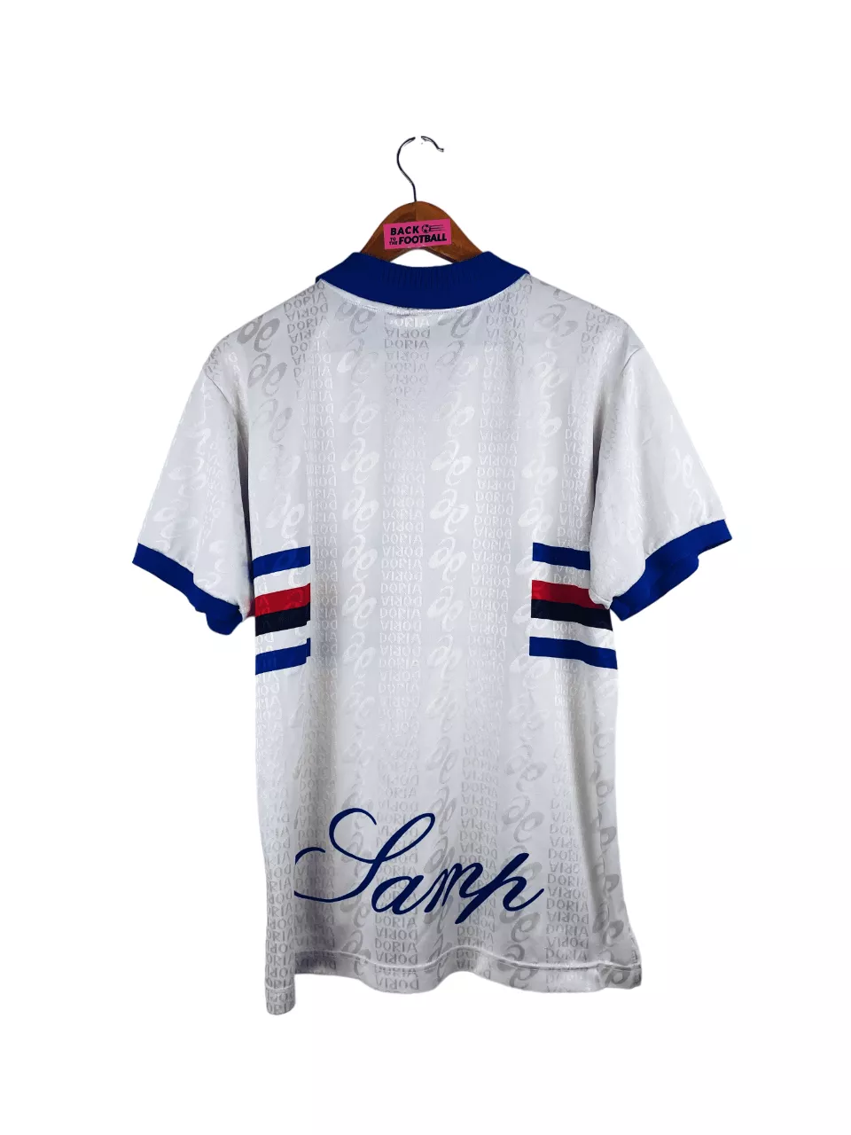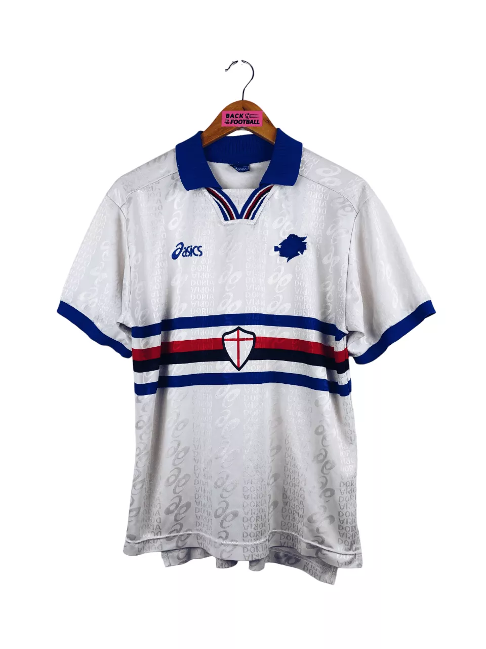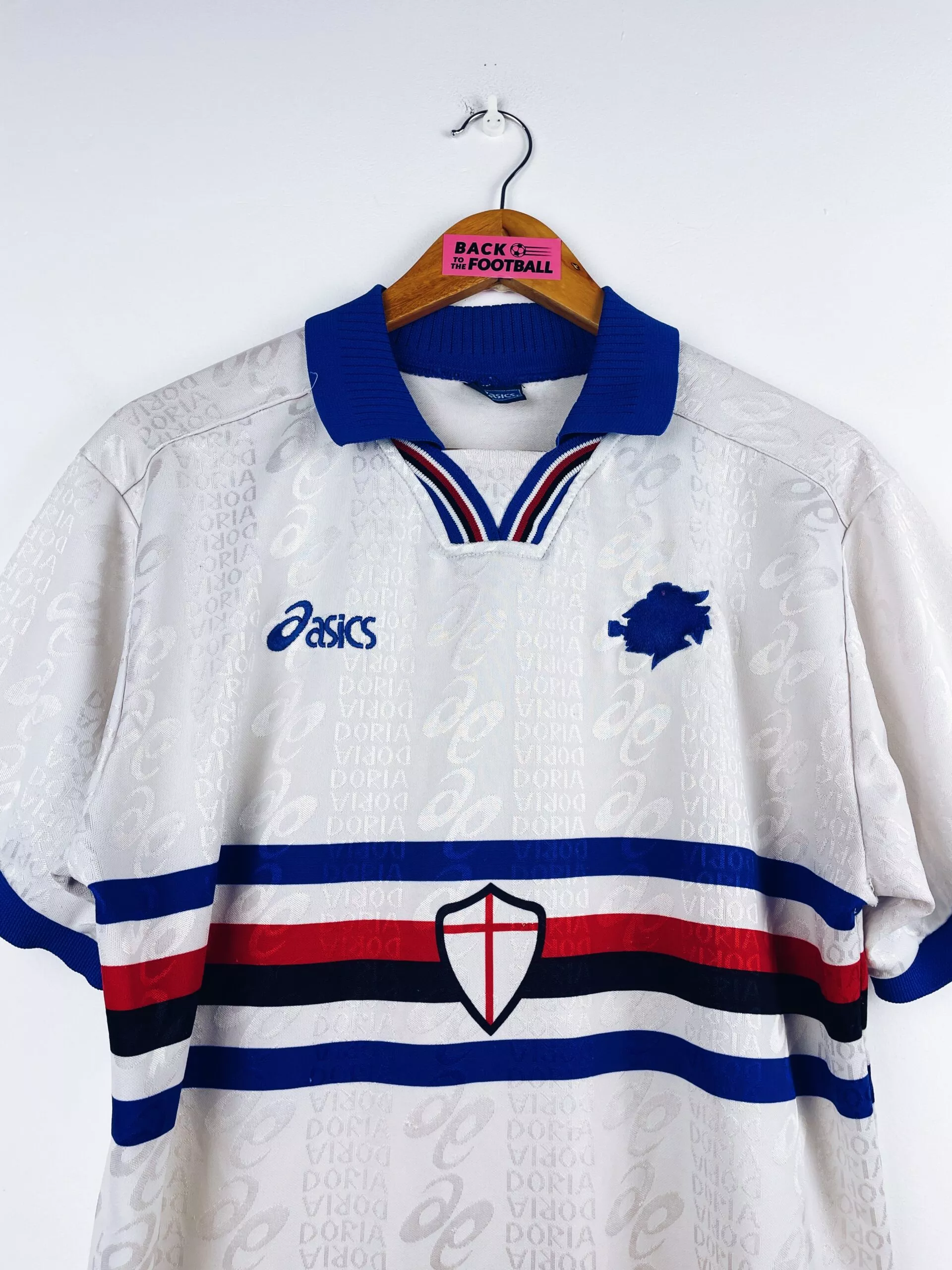 Taille : M Si tu veux plus de détails, tu peux nous contacter par mail ou sur les réseaux 😉 Etat : 8/10, très bon état, des petites bouloches et un mini accroc à noter, mini trace sur l’écusson (voir photos) Le maillot : maillot vintage extérieur de la Sampdoria de Gênes 1996/1997. L’écusson et le logo Asics sont brodés. La croix de Gênes est incrustée. On peut voir en tramé le logo Asics et « Doria ». Très beau maillot rétro de la Sampdoria ! Histoire : la Samp termine à la 6ème place de Serie A et se qualifie pour…