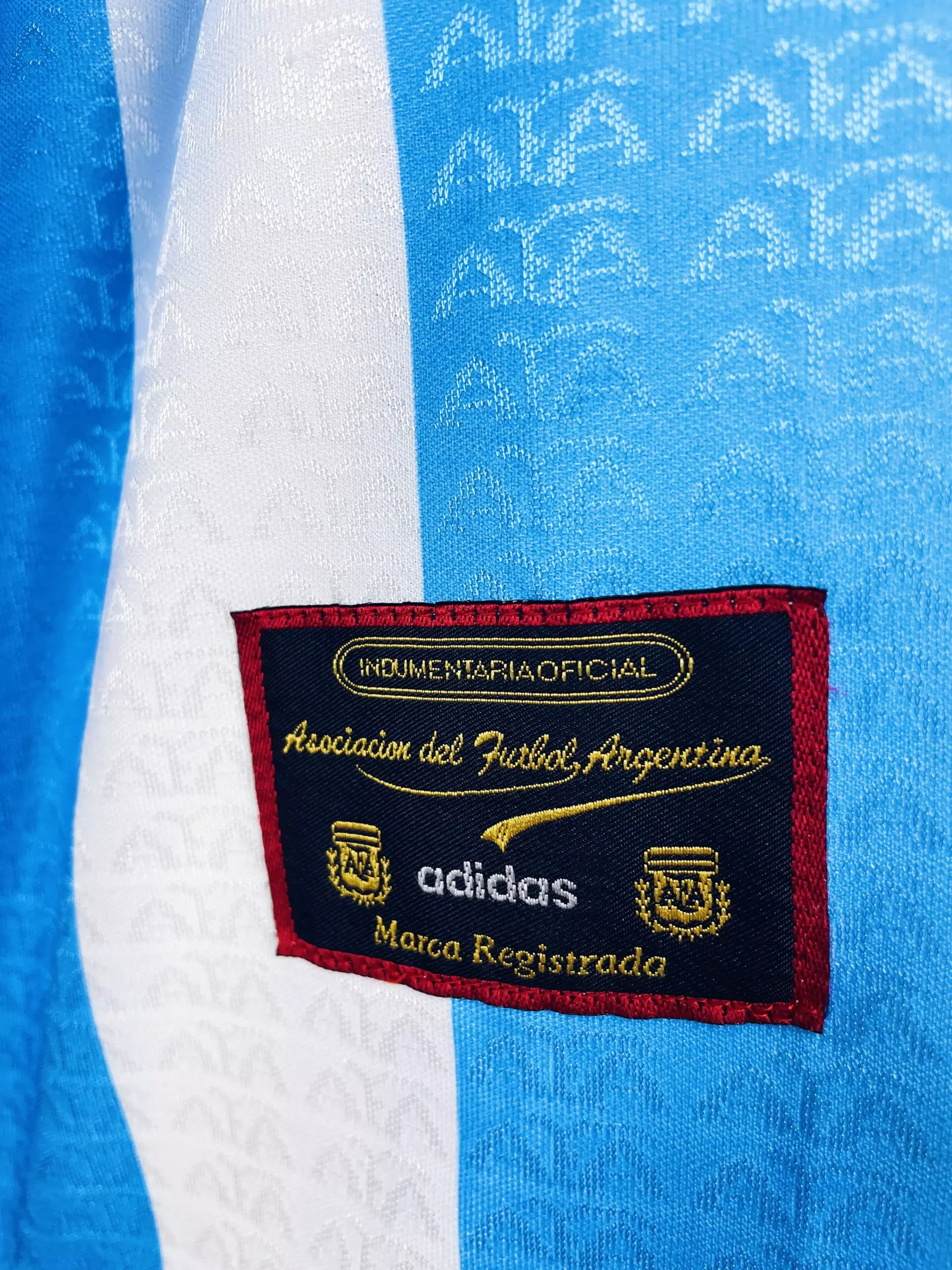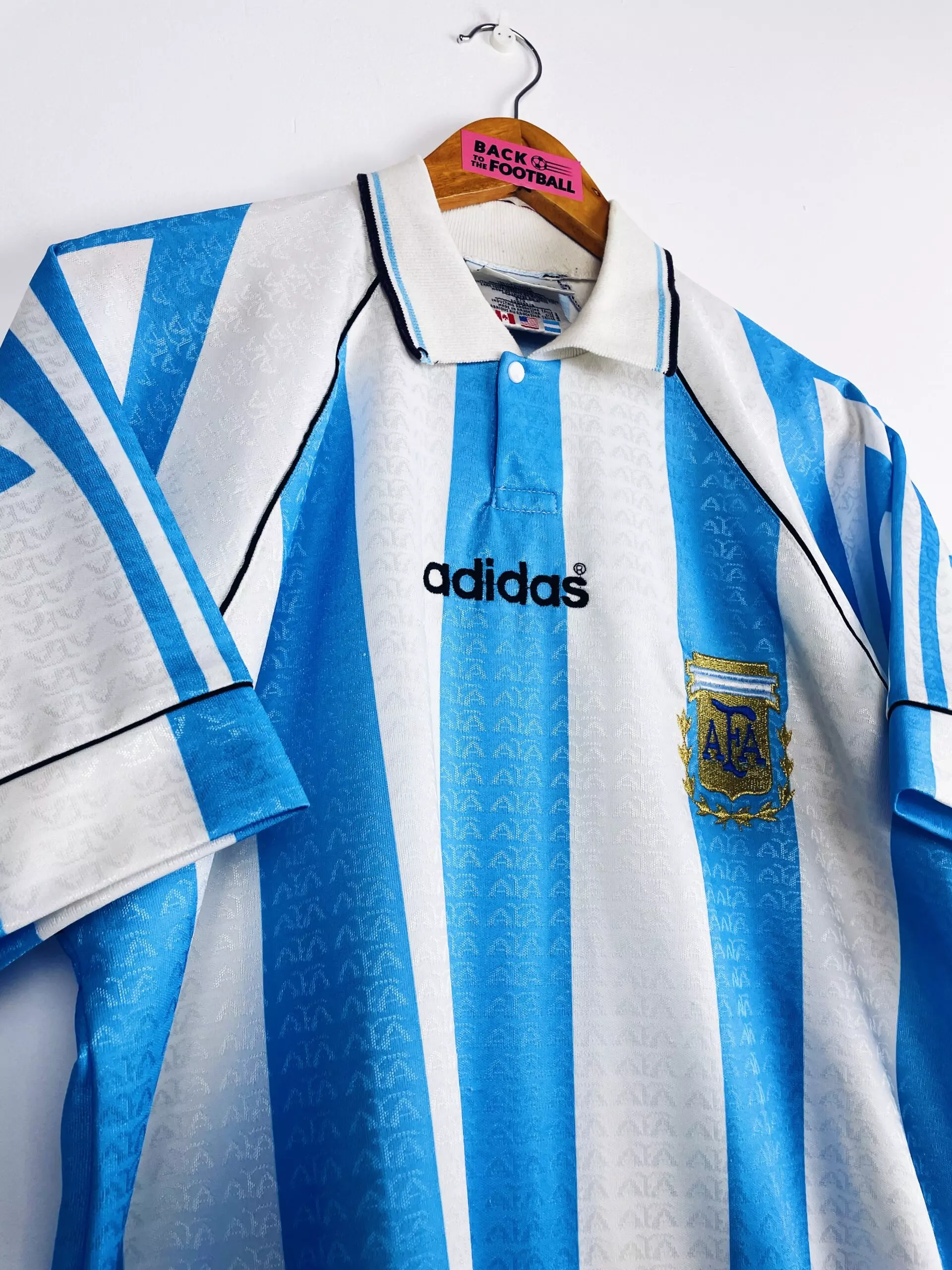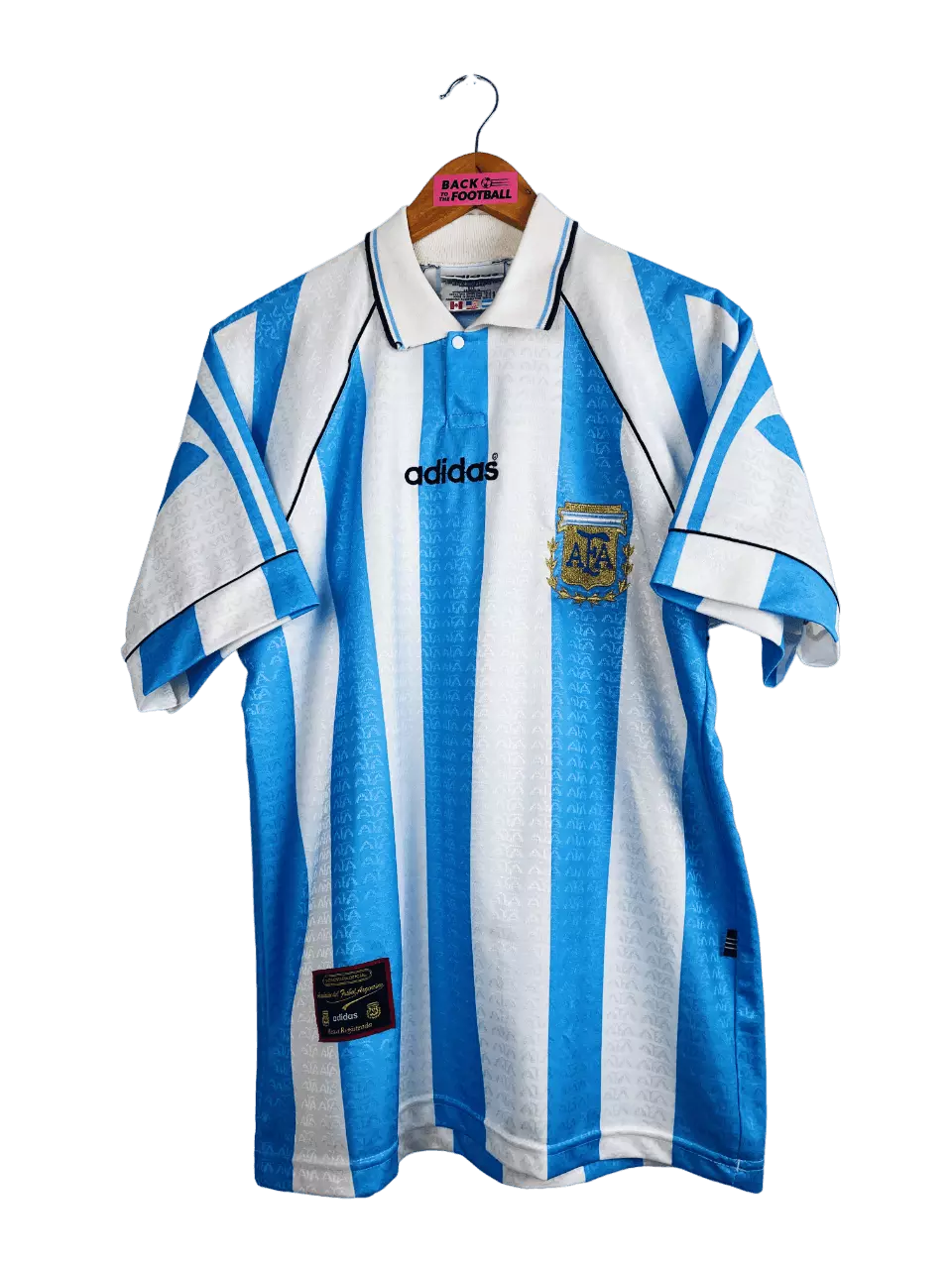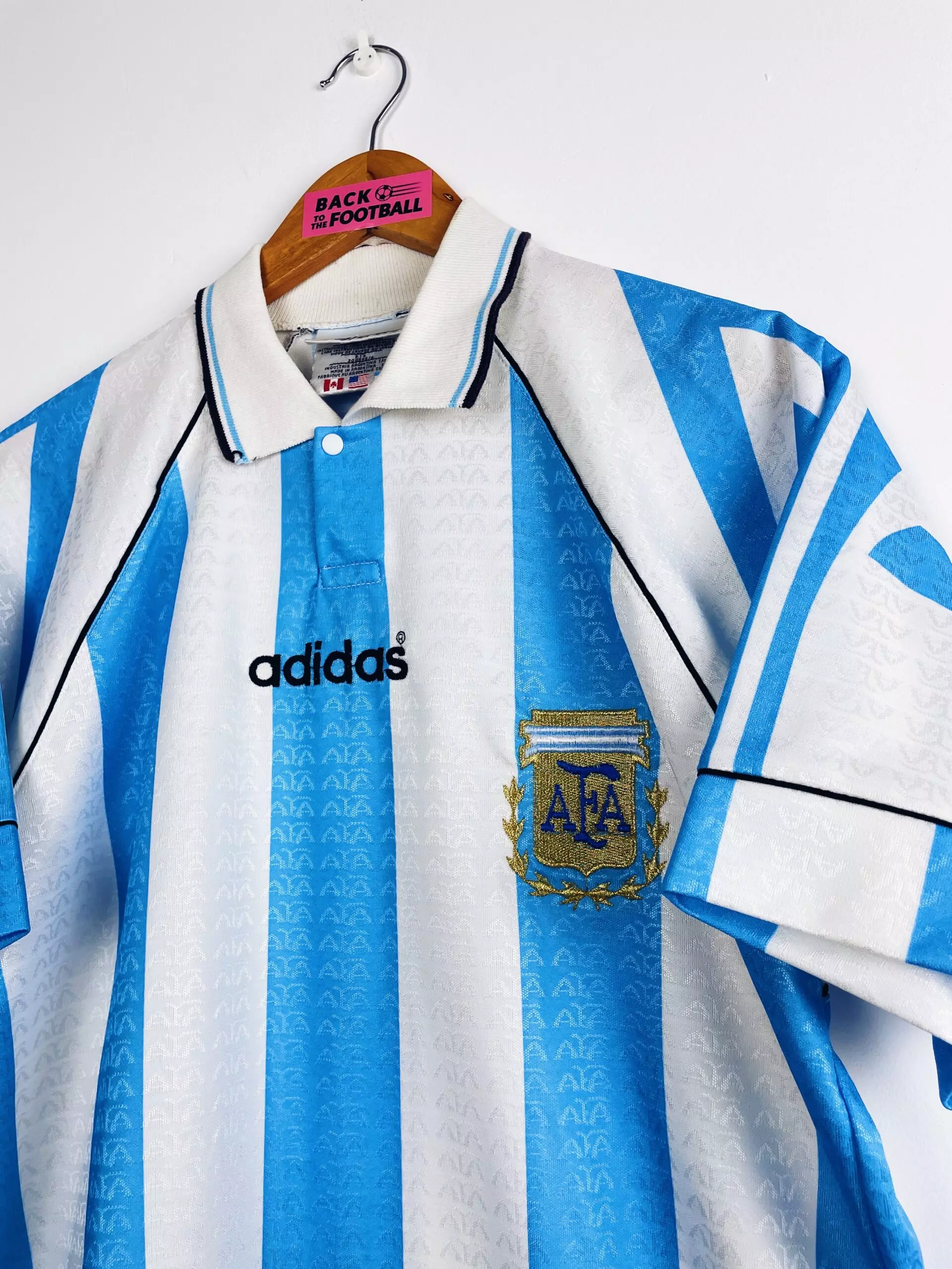 Taille : L Si tu veux plus de détails, tu peux nous contacter par mail ou sur les réseaux 😉 Etat : 8/10, très bon état, quelques légères bouloches Le maillot : maillot vintage domicile de l’Argentine 1996/1998, notamment utilisé pour la Copa América 1997. L’écusson et le logo Adidas sont brodés. On peut voir en tramé sur tout le maillot le logo AFA (Asociacion del Futbol Argentina). Il est fabriqué en Argentine. Très beau maillot rétro de l’Argentine ! Histoire : l’Albiceleste passe le premier tour de la Copa América en terminant à la 2ème place du groupe, derrière…