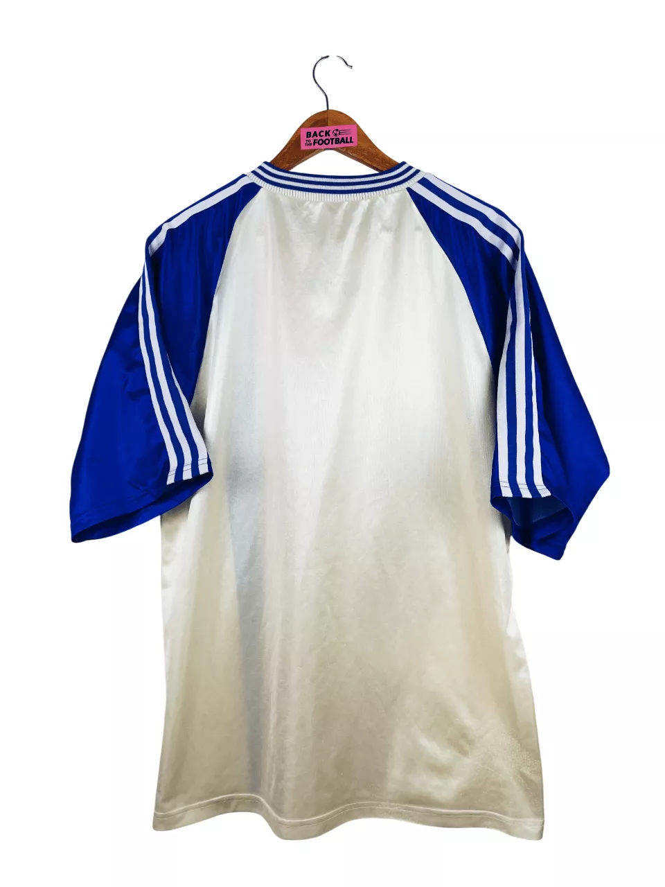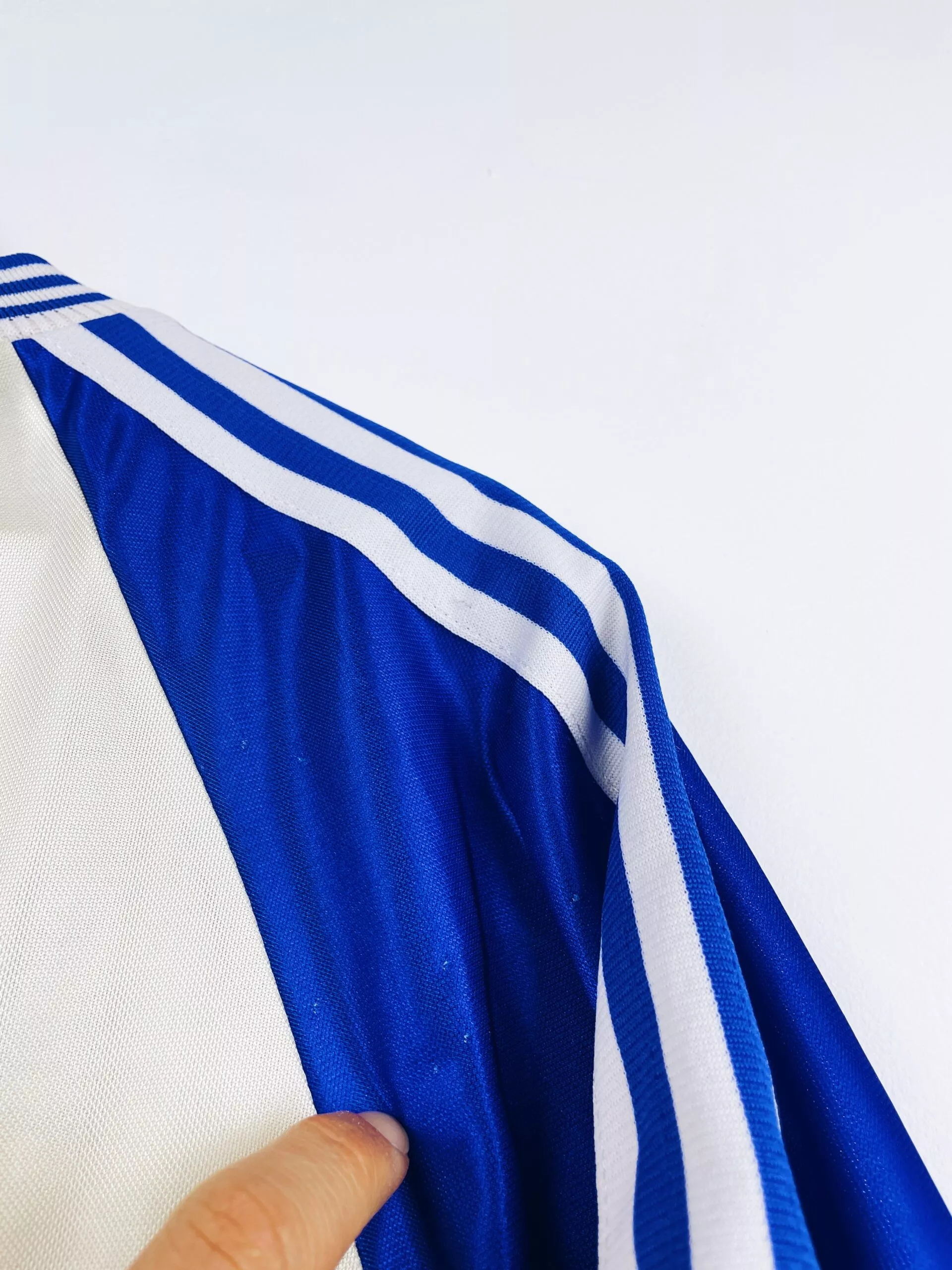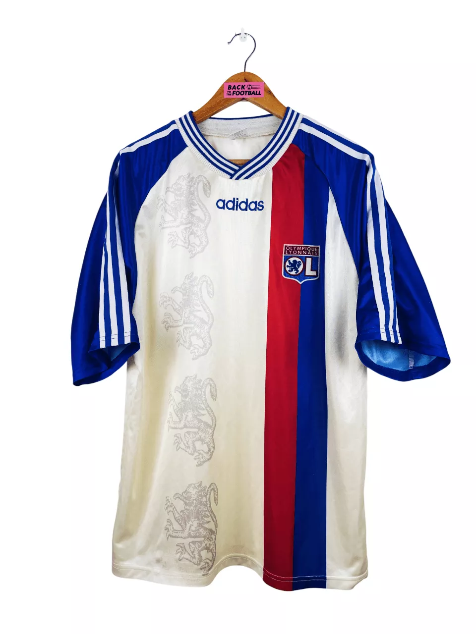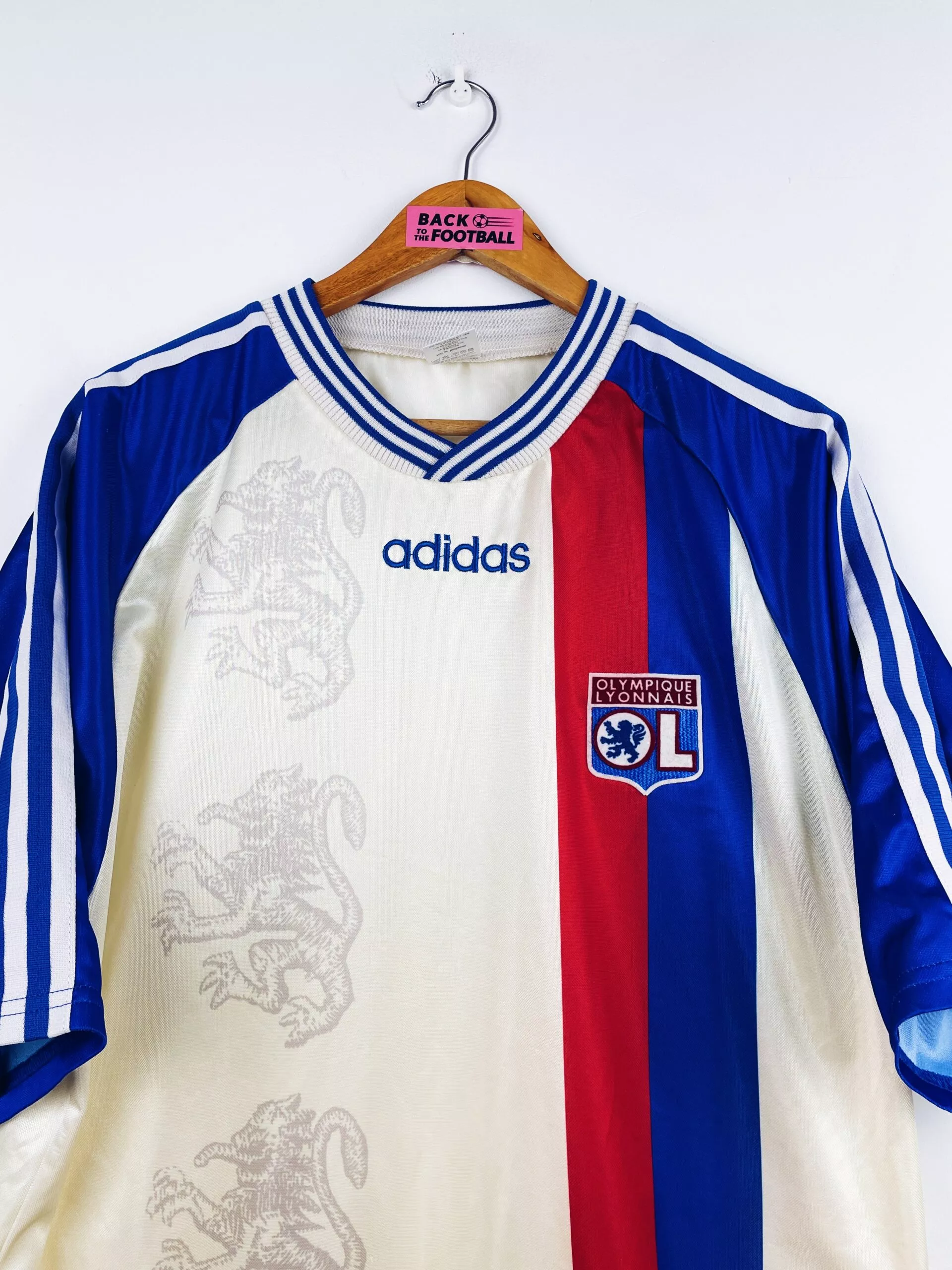 Taille : L Largeur : 56cm (aisselle à aisselle) Longueur : 74cm (base du col au bas) Si tu veux plus de détails, tu peux nous contacter par mail ou sur les réseaux 😉 Etat : 8.5/10, excellent état. Le blanc est moins blanc qu’à l’origine. Le maillot : maillot vintage domicile de l’OL 1996/1998. L’écusson est en feutrine, le logo Adidas brodé. Les lions en motifs sont magnifiques. Très beau maillot rétro de l’Olympique Lyonnais ! Histoire : la 1ère saison, les Gones terminent 8èmes de D1. Ils n’iront pas loin en coupes nationales. La 2ème saison, l’OL termine…