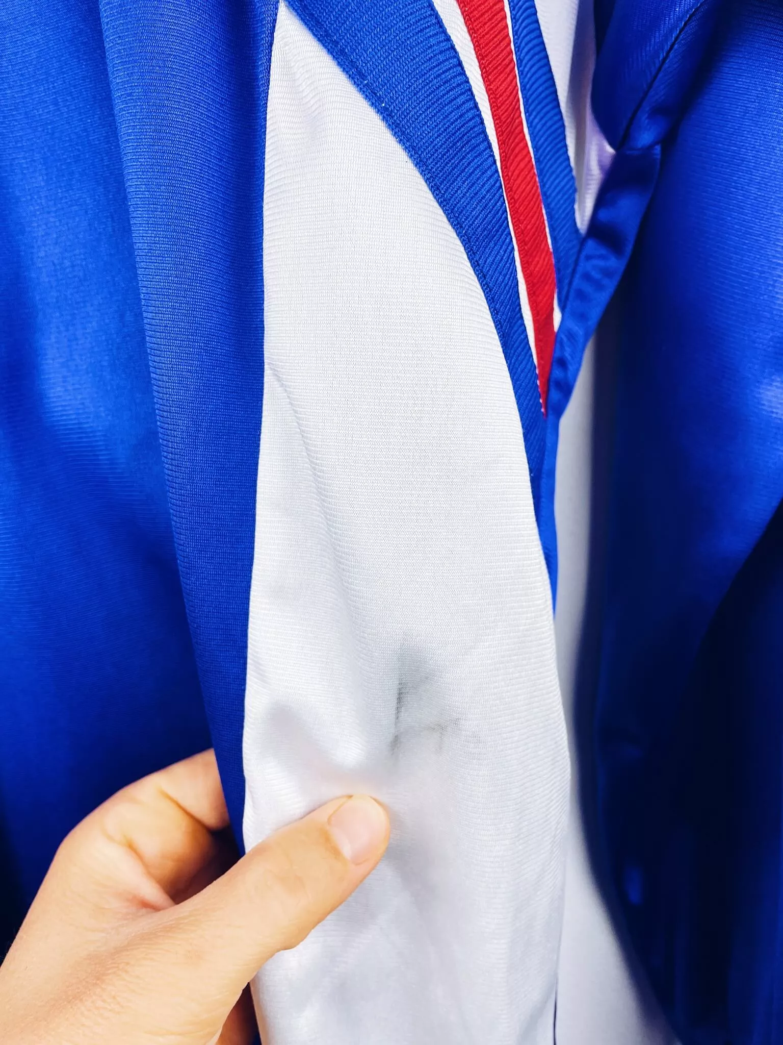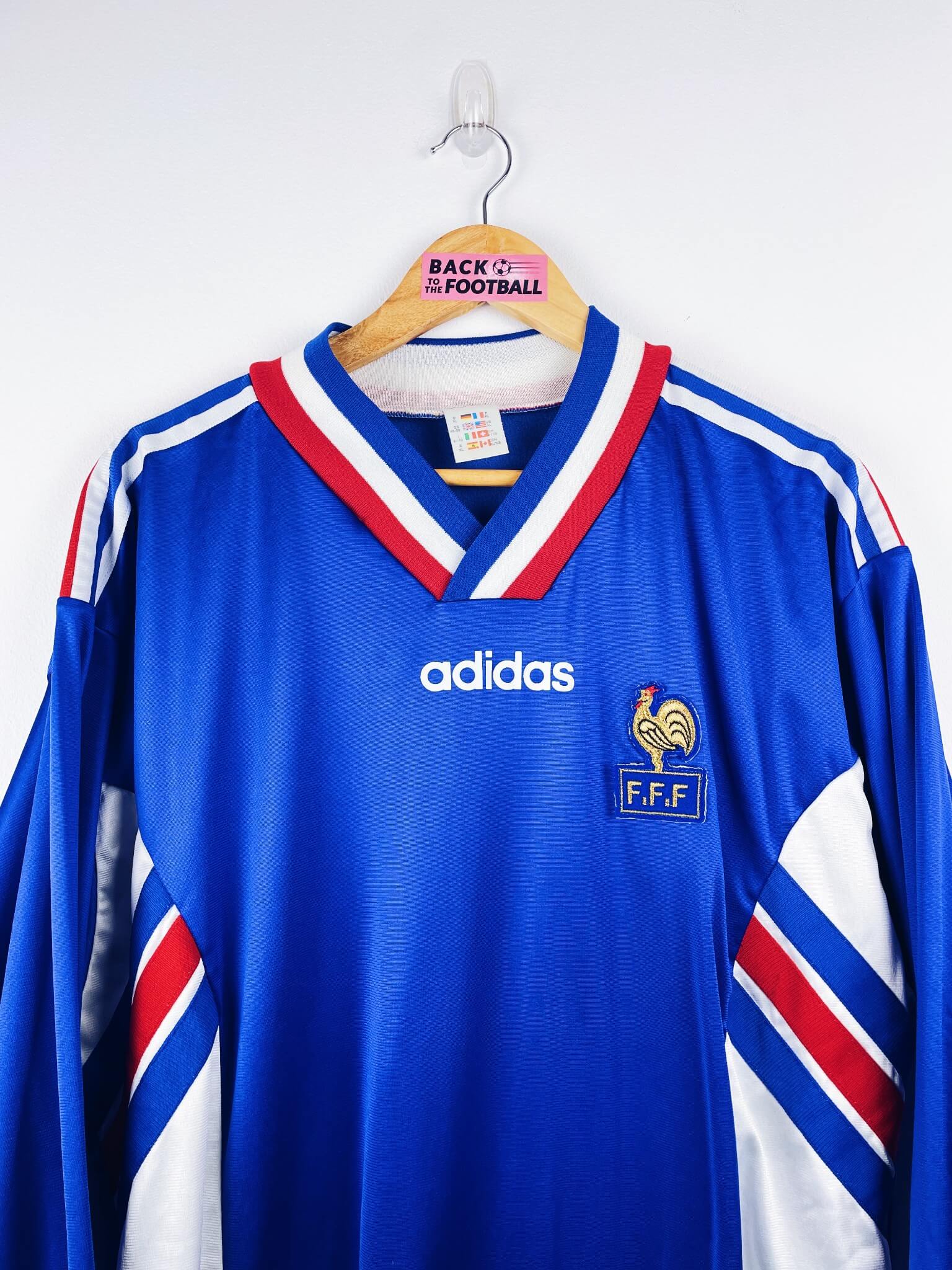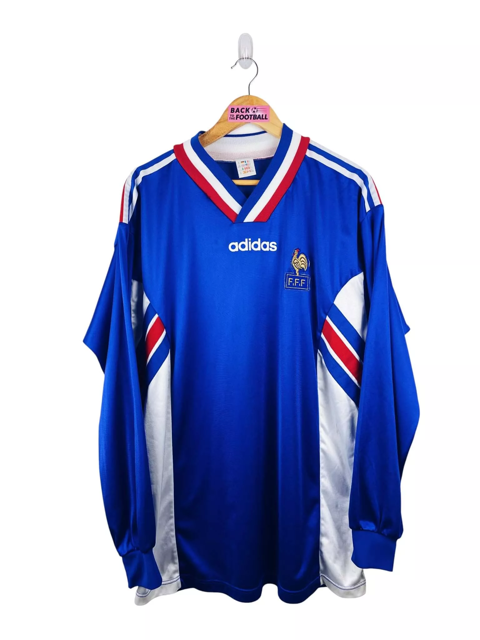 Taille : XL Largeur : 59cm (aisselle à aisselle) Longueur : 78cm (base du col au bas) Si tu veux plus d’infos, tu peux nous contacter par mail ou sur les réseaux 😉 Etat : 8.5/10, excellent état hormis une trace sur un côté, sûrement une trace du match (voir photo). Sent un peu le renfermé, on n’a pas osé le laver. Le maillot : maillot vintage domicile de l’équipe de France Espoirs 1996 manches longues porté (match worn) ou préparé (match issue) pour le numéro 2. Maillot récupéré via la collection d’un ancien joueur pro. Le coq sans les…