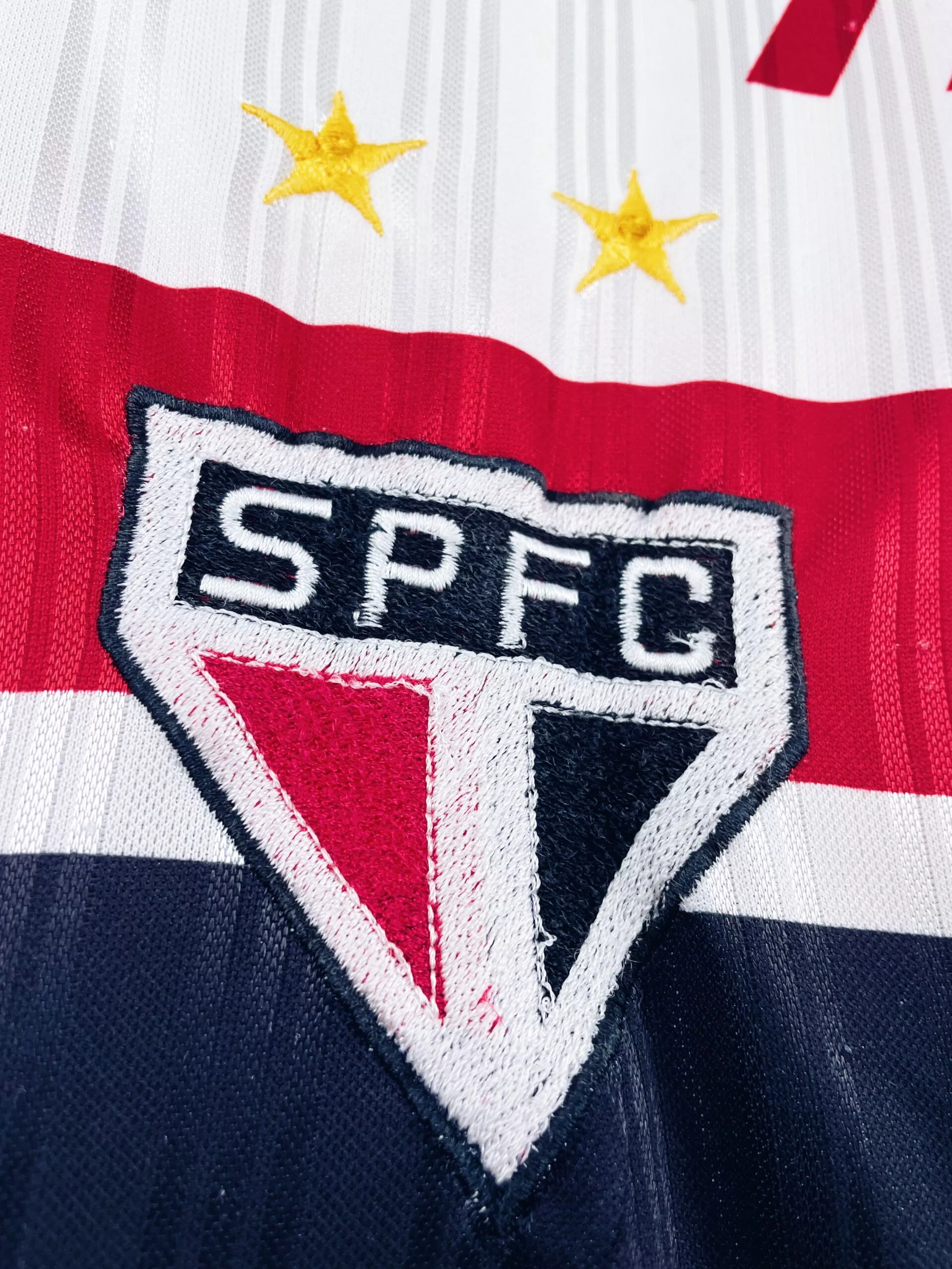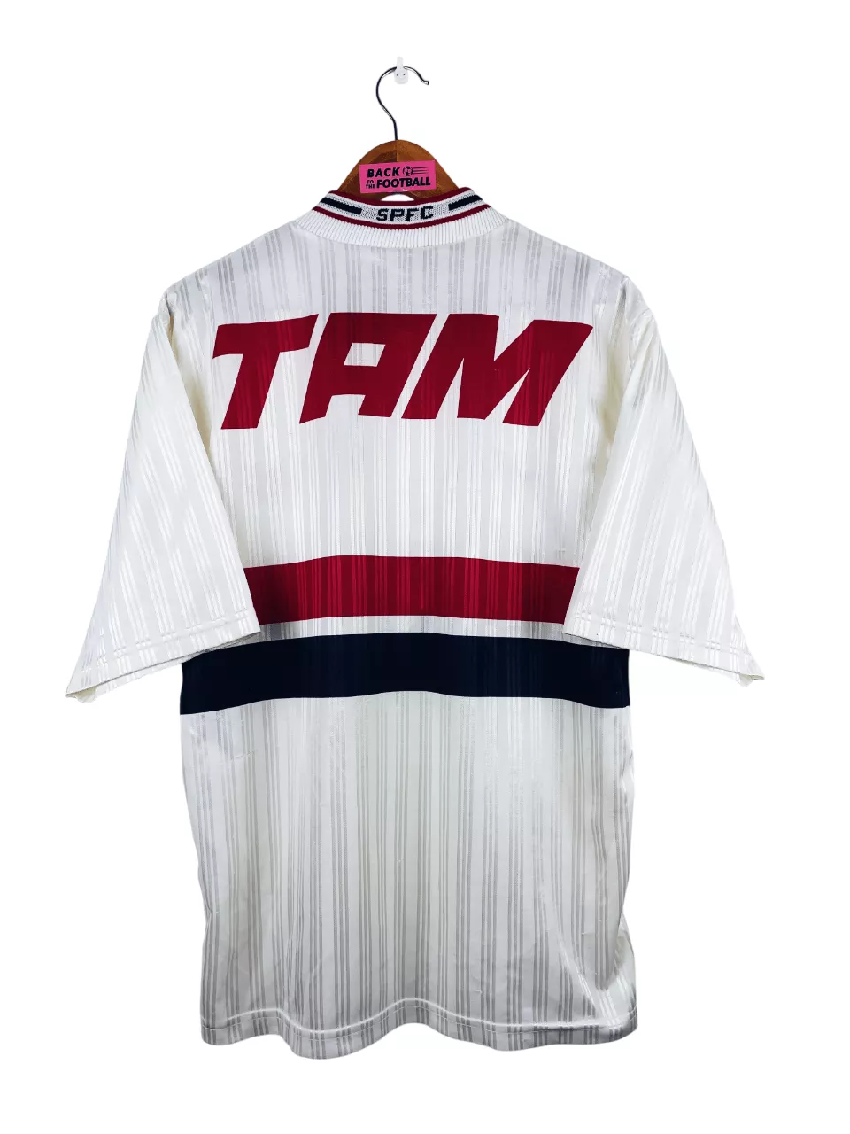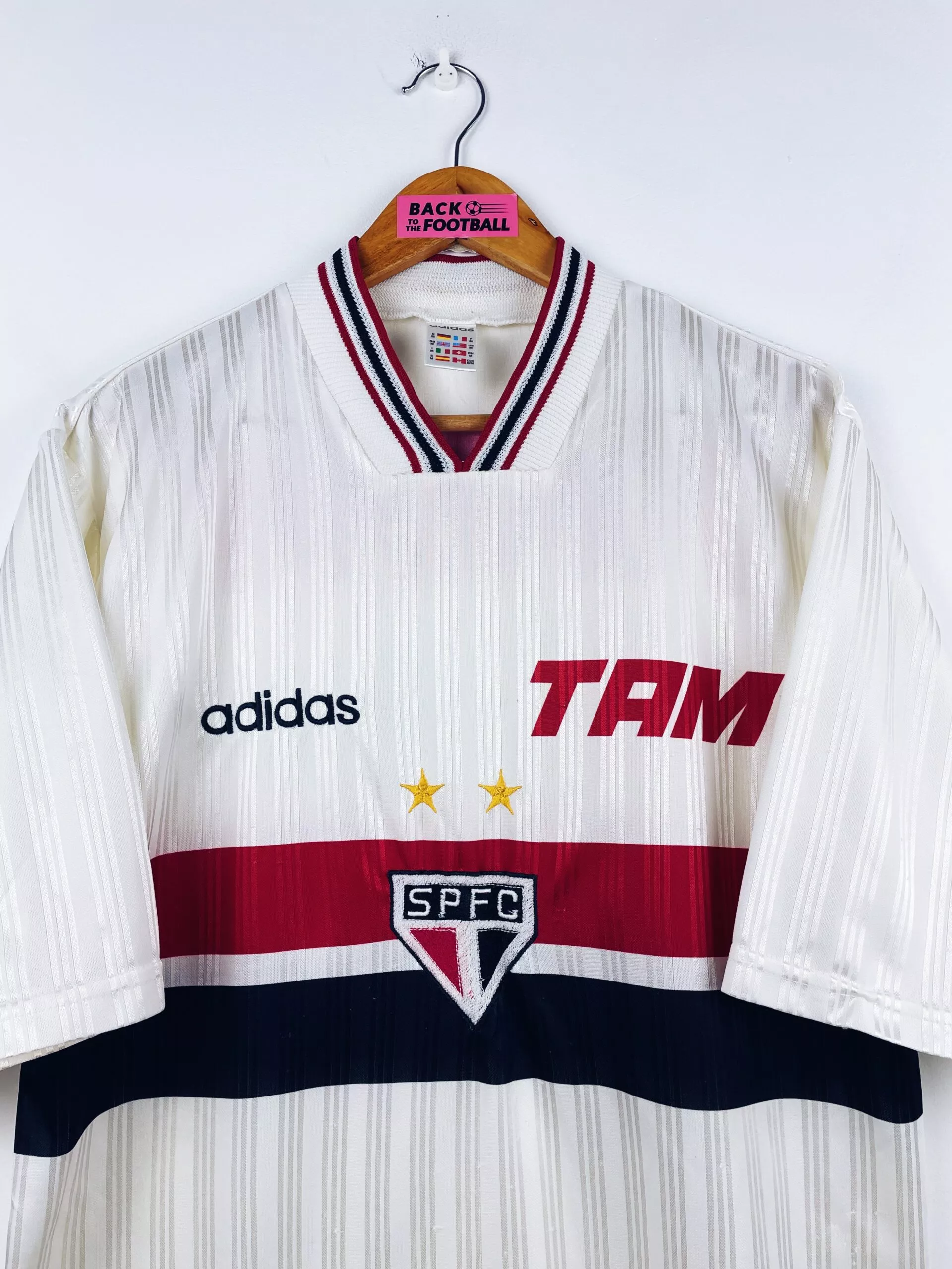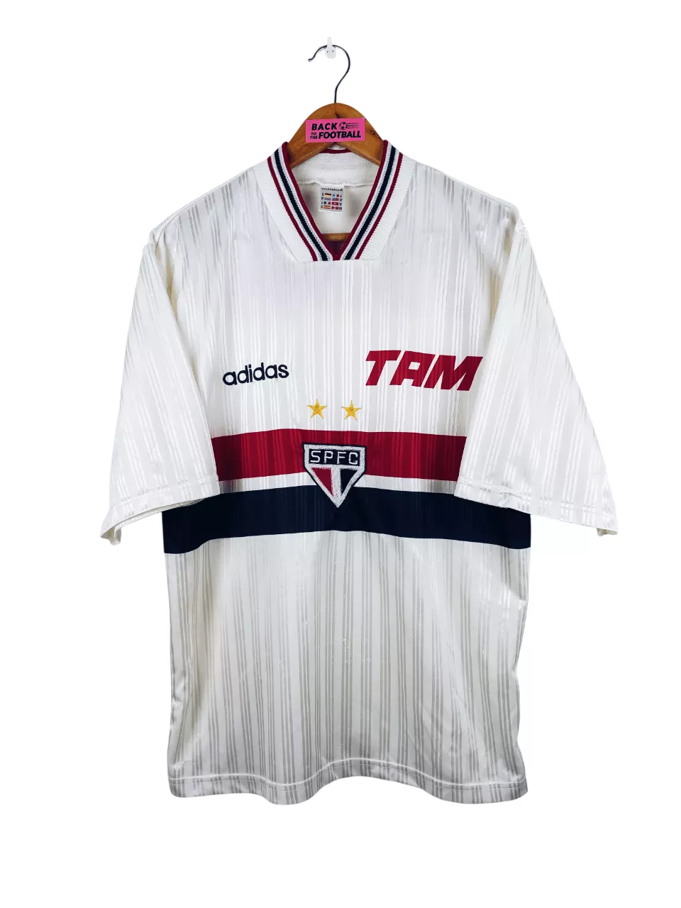 Taille : M Largeur : 52cm (aisselle à aisselle) Longueur : 70cm (base du col au bas) Si tu veux plus de détails, tu peux nous contacter par mail ou sur les réseaux 😉 Etat : 7/10, très bon état général mais des bouloches (voir photo) Le maillot : maillot vintage domicile de São Paulo 1996. L’écusson et le logo Adidas sont brodés, les sponsors Tam sont incrustés. Très beau maillot rétro de São Paulo ! Histoire : le SPFC termine à la 11ème place de Serie A brésilienne. Ils termineront 2èmes du Campeonato Paulista derrière Palmeiras. Ils remporteront la…