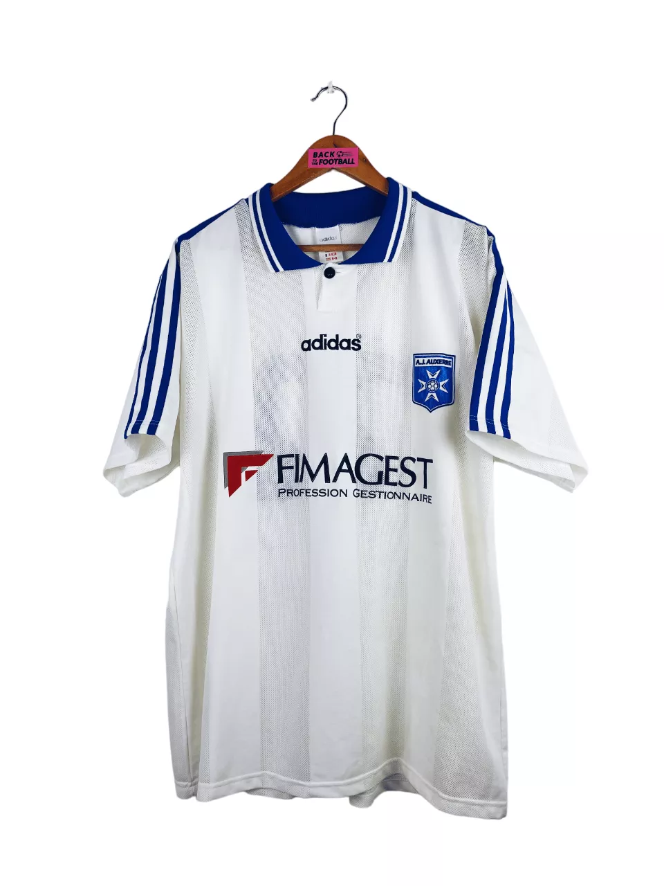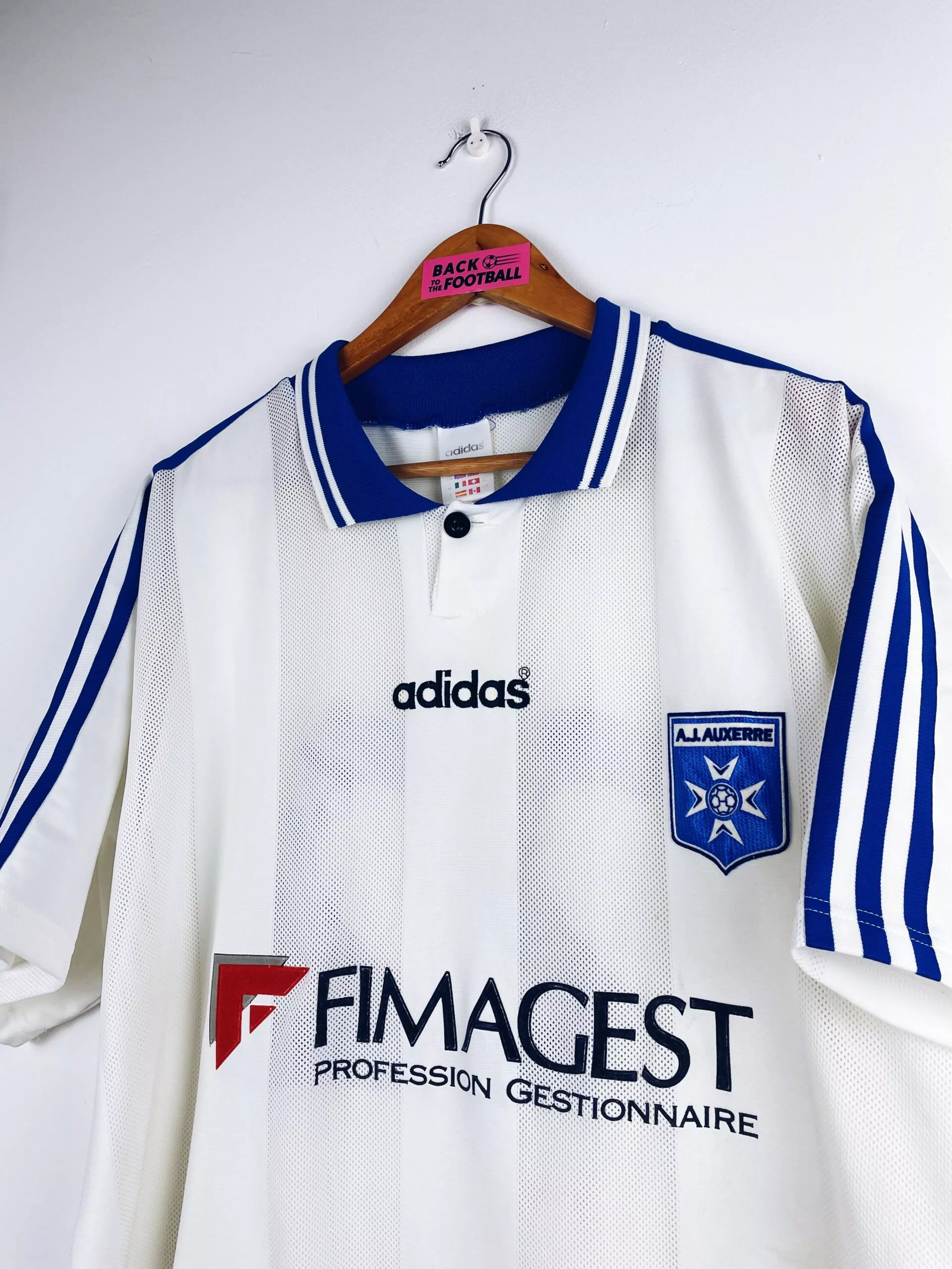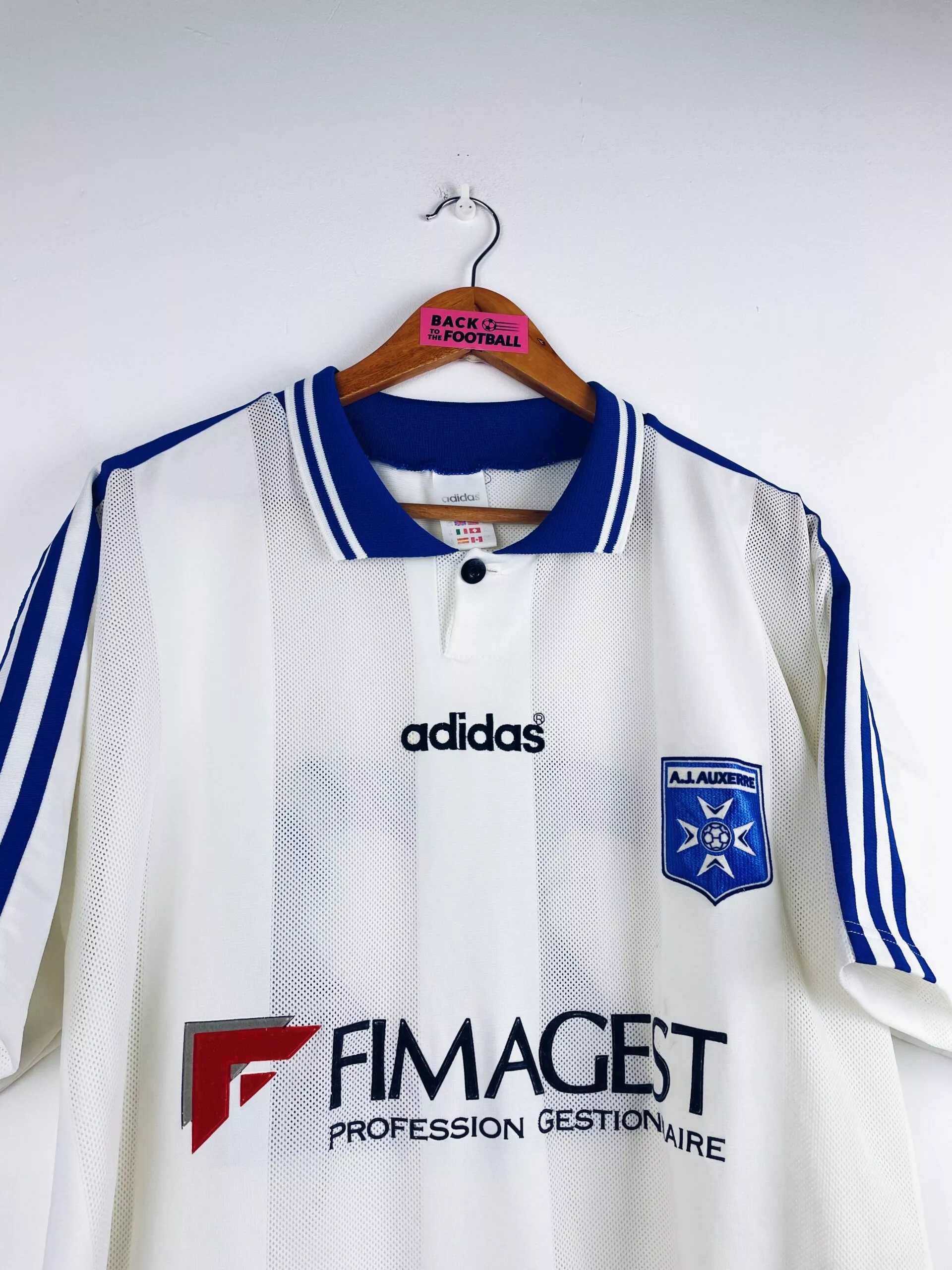 Taille : XL Si tu veux plus de détails, tu peux nous contacter par mail ou sur les réseaux 😉 Etat : 8/10, très bon état général, la feutrine du sponsor a un peu vieilli Le maillot : maillot vintage domicile de l’AJ Auxerre 1997/1998 floqué du numéro 22. L’écusson et le sponsor sont en feutrine. Le logo Adidas est brodé. Très beau maillot rétro de l’Aj Auxerre ! Histoire : l’AJA coachée par Guy Roux terminera à la 7ème place de Ligue 1. En Coupe UEFA, les Auxerrois iront jusqu’en quart de finale et s’inclineront contre la Lazio. Ils…