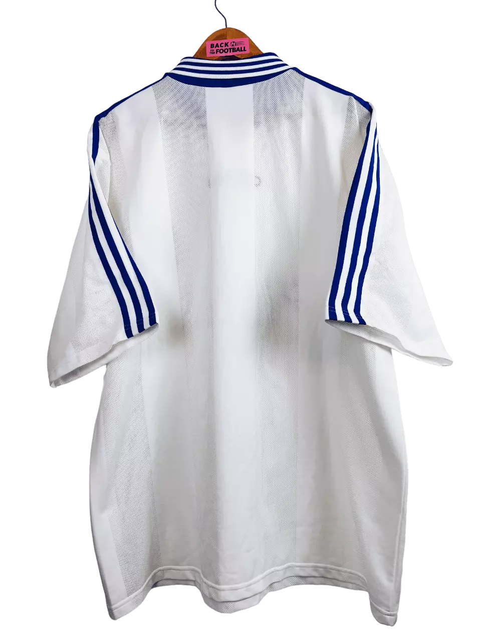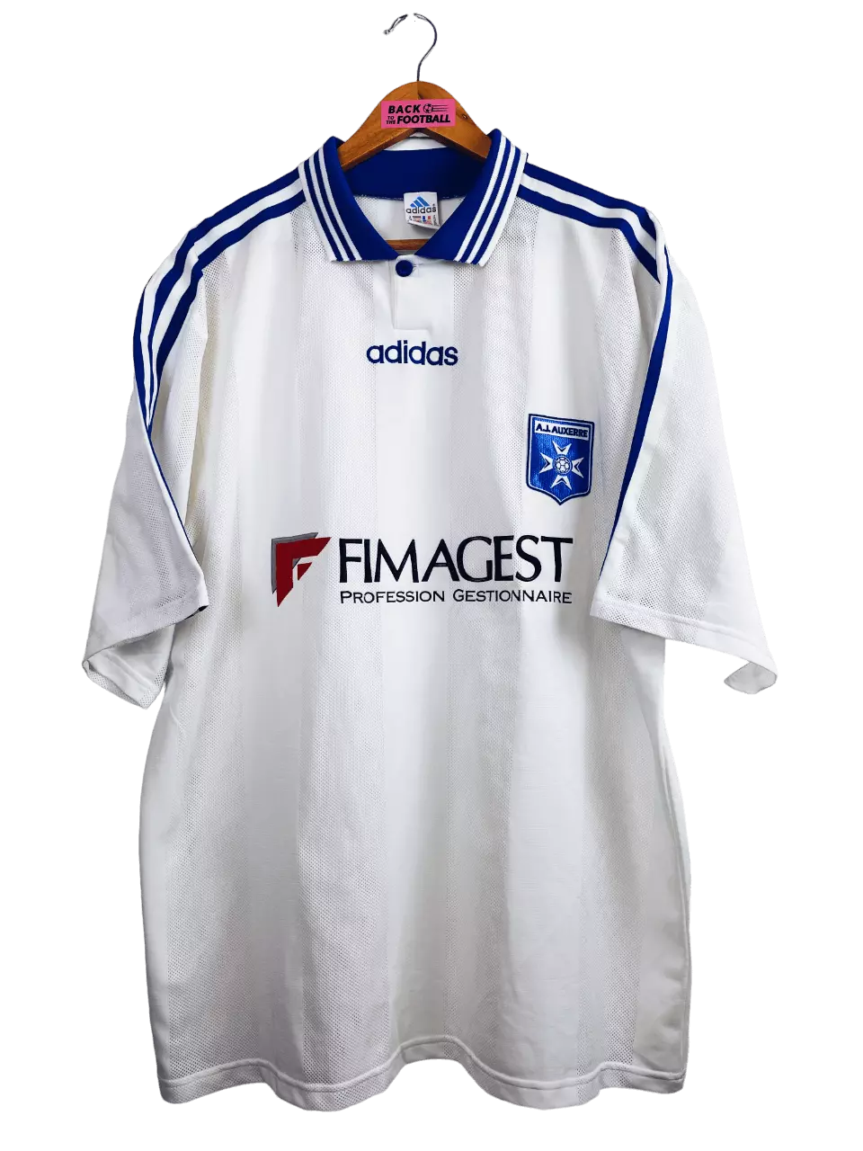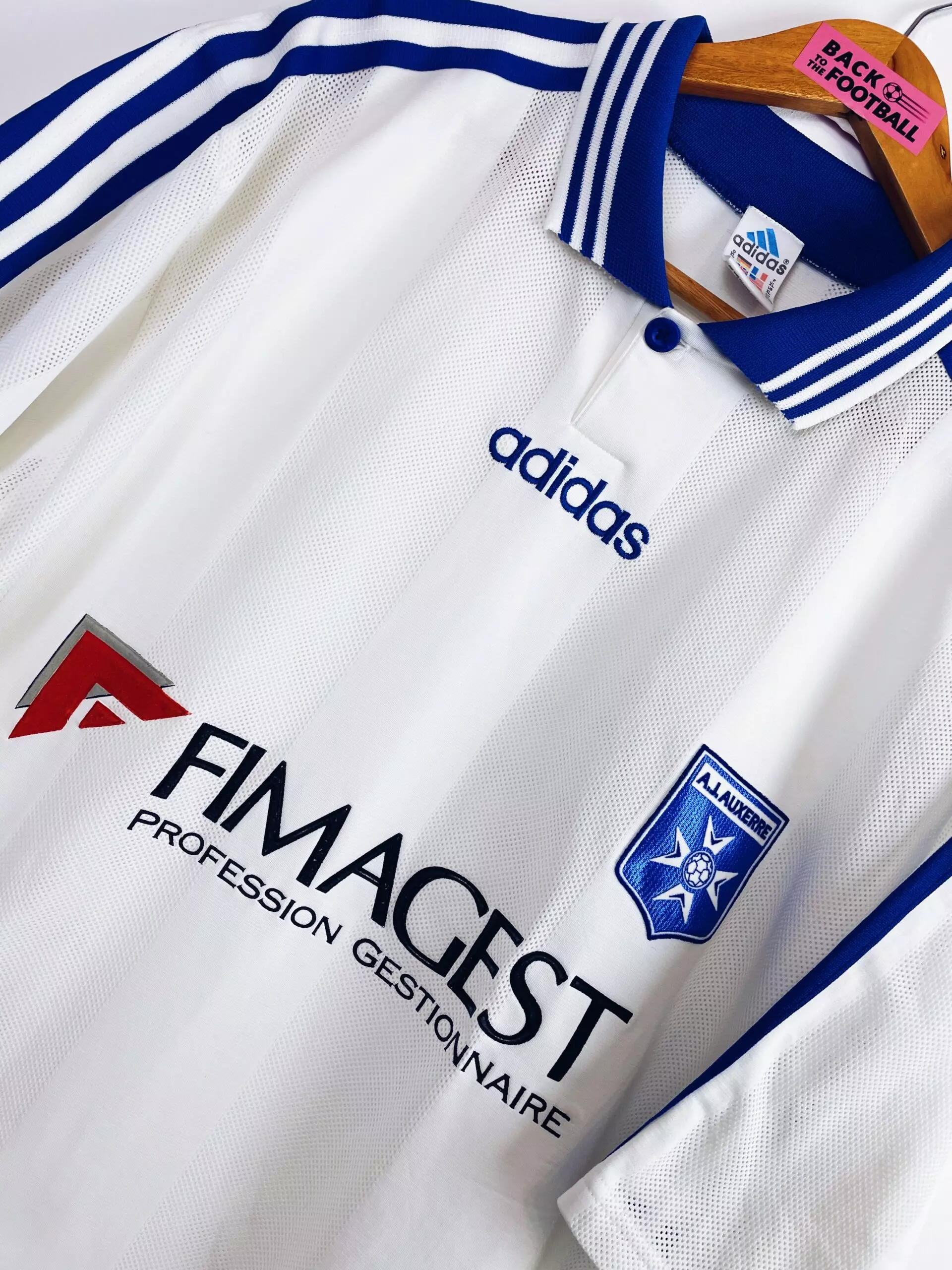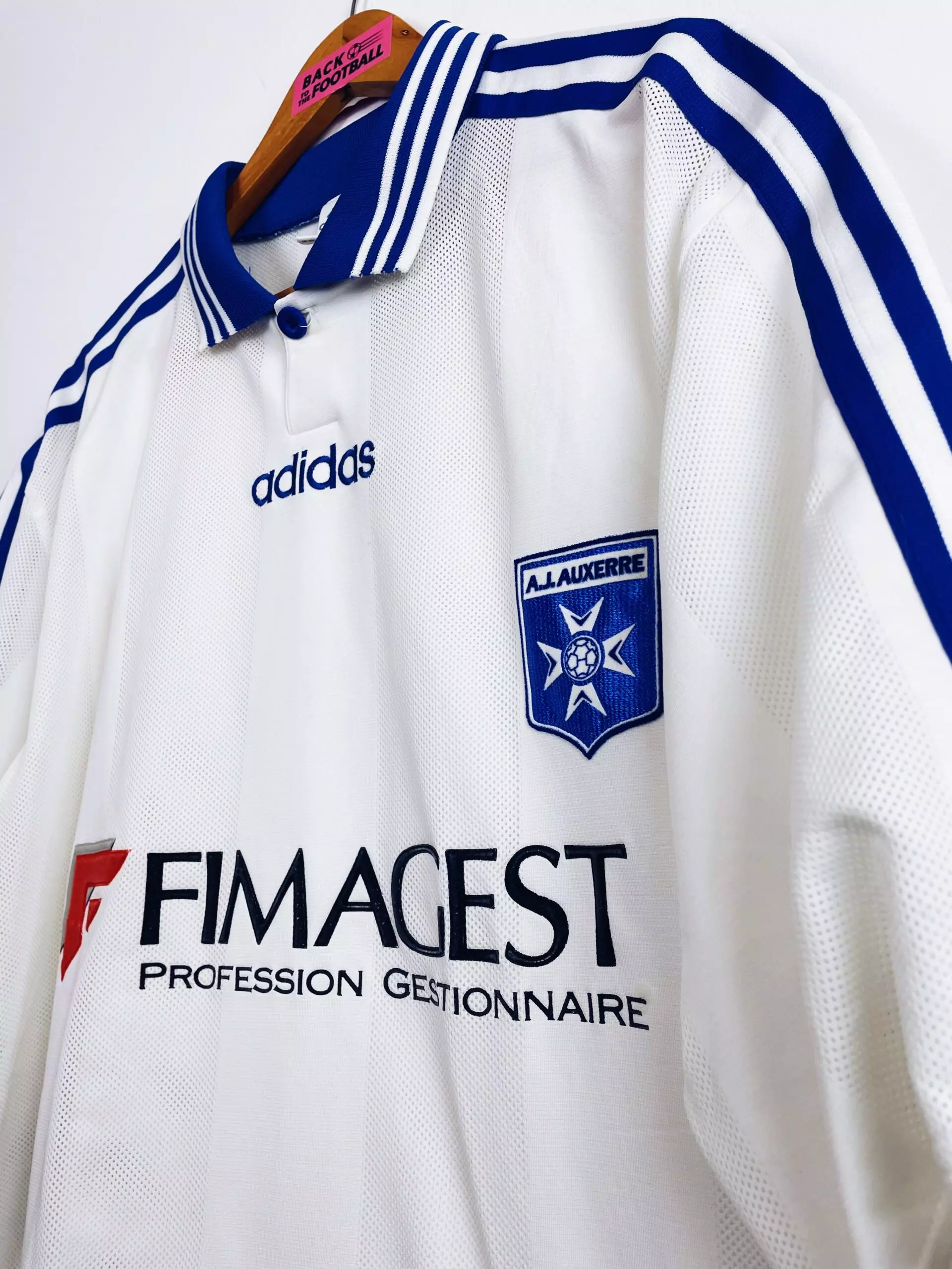 Taille : XL Etat : 8/10, très bon état général Le maillot : maillot vintage domicile de l’AJ Auxerre 1997/1998. L’écusson et le sponsor sont en feutrine. Le logo Adidas est brodé. Très beau maillot rétro de l’Aj Auxerre ! Histoire : l’AJA coachée par Guy Roux terminera à la 7ème place de Ligue 1. En Coupe UEFA, les Auxerrois iront jusqu’en quart de finale et s’inclineront contre la Lazio. Ils gagneront la Coupe Intertoto avec Bastia et Lyon. Stéphane Guivarc’h sortira une saison énorme avec 46 buts. Quelques joueurs : Steve Marlet, Benjjamin Nivet, Bernard Diomède, Jeunechamp, Goma, Radet,…