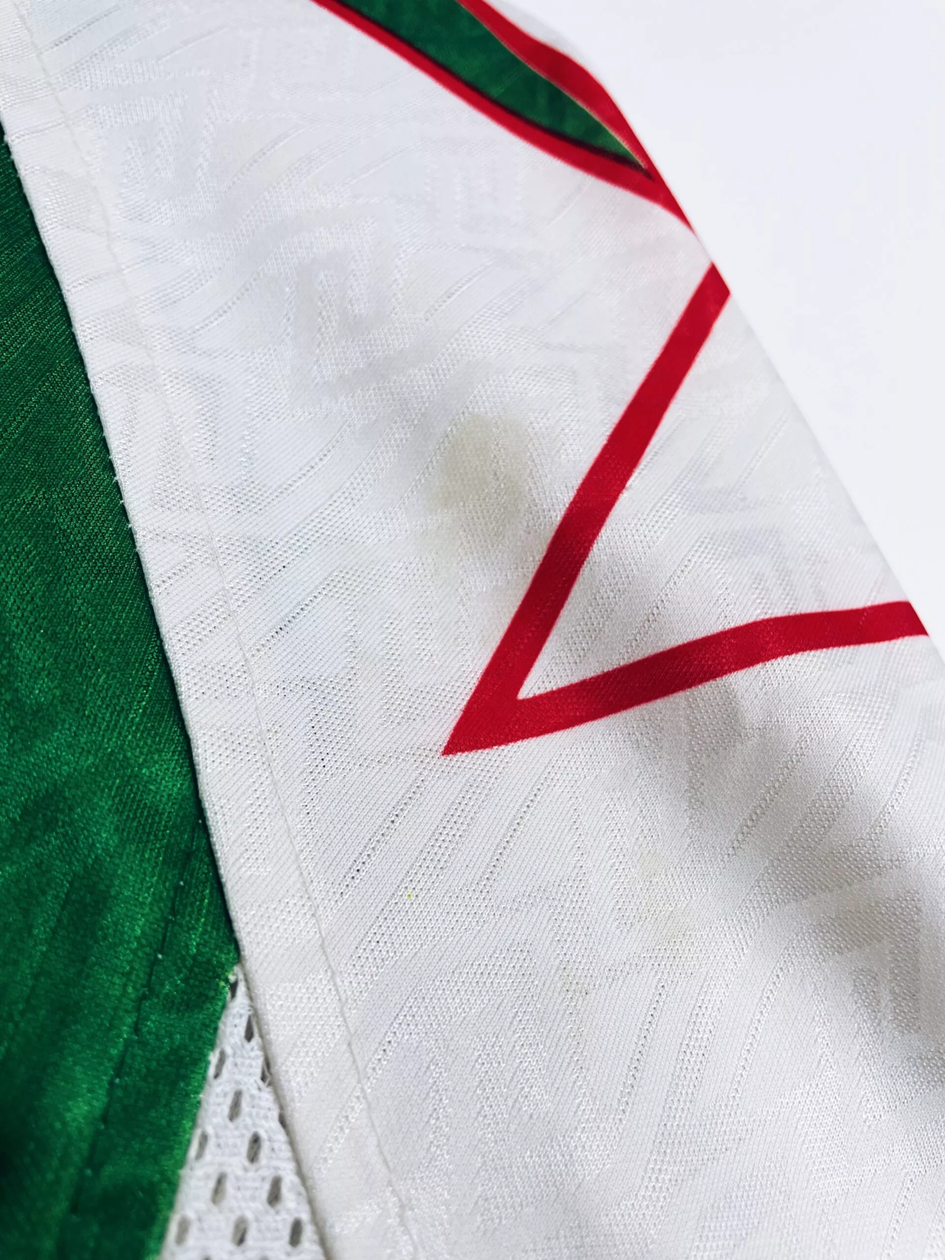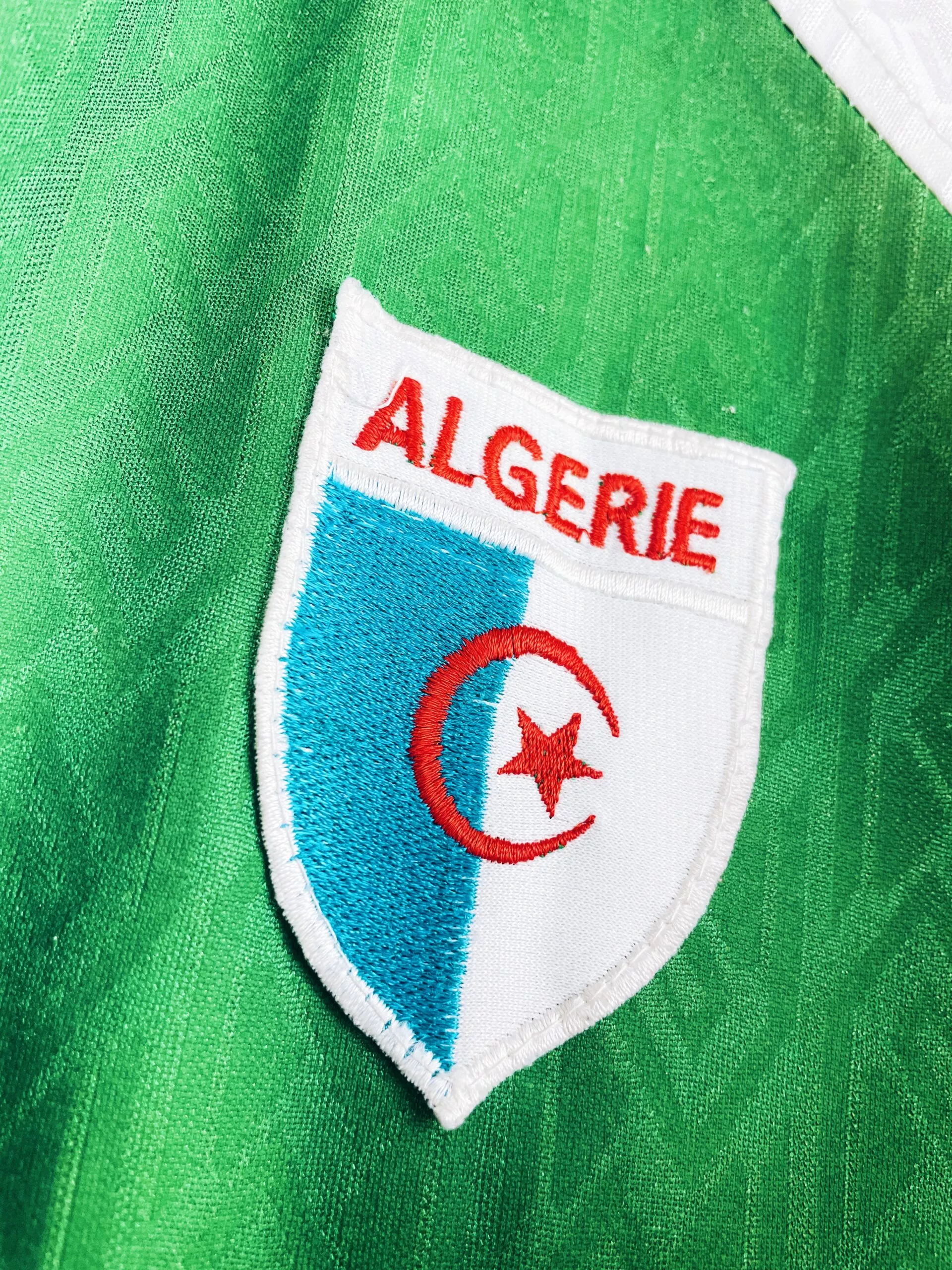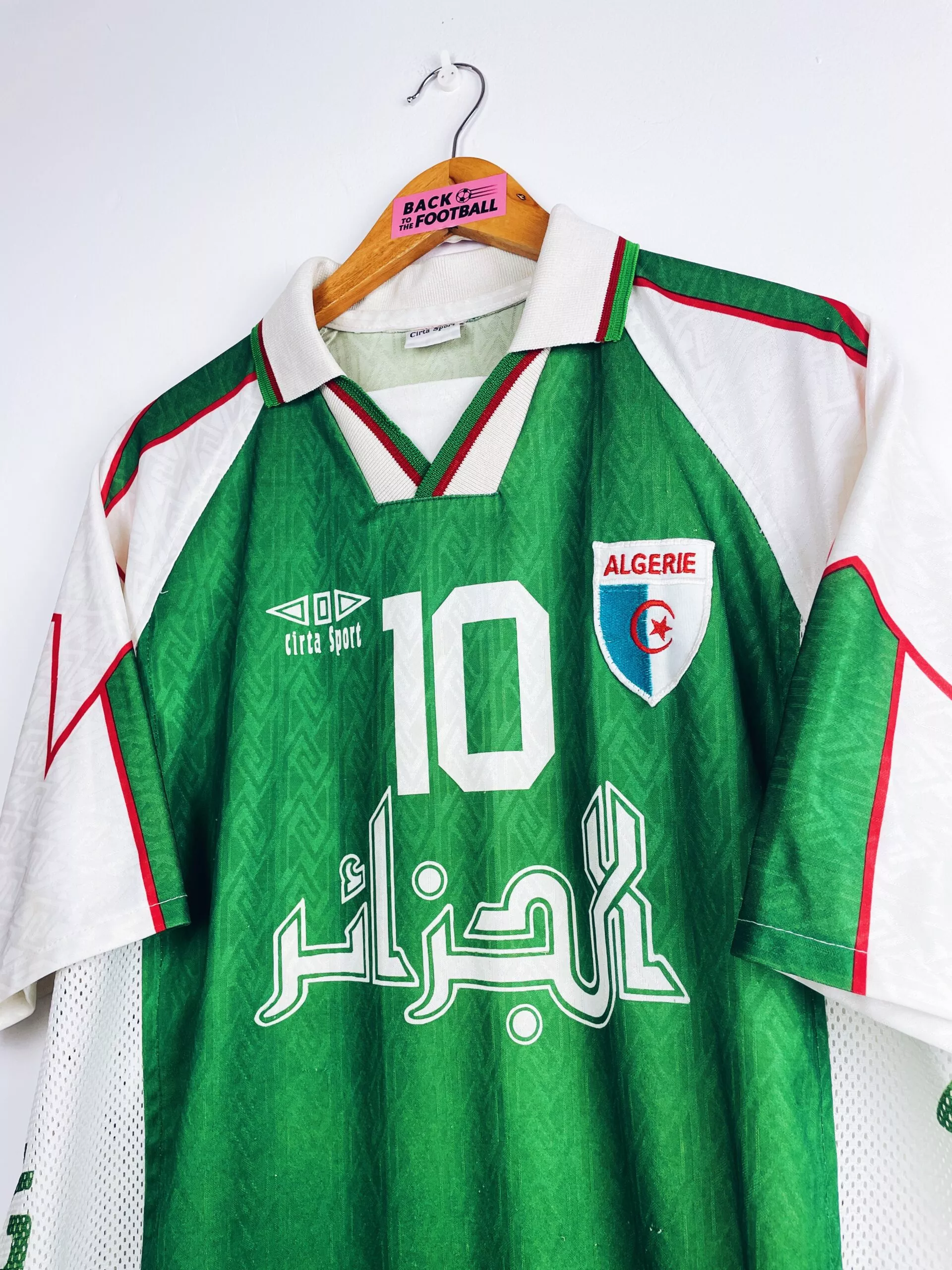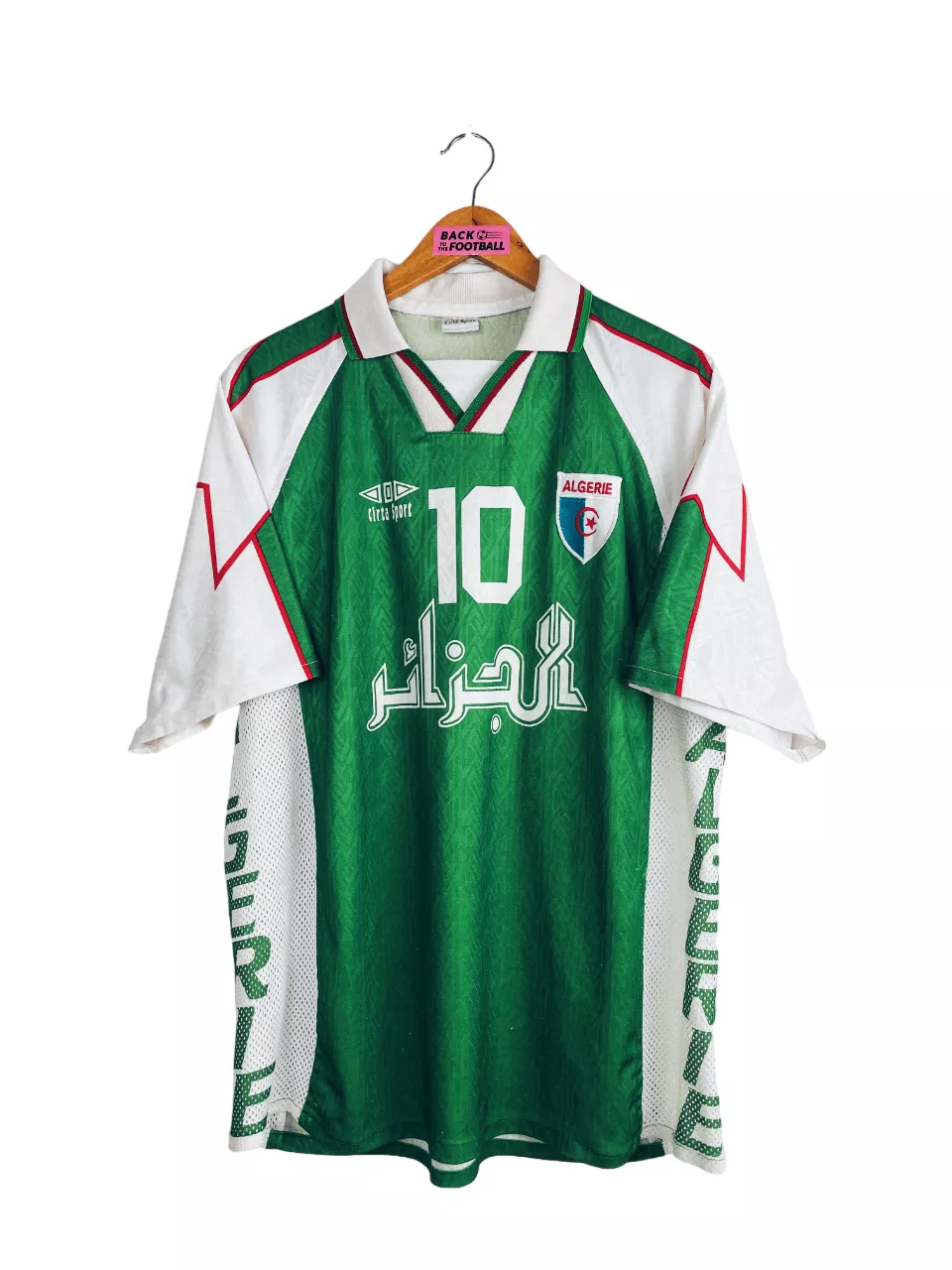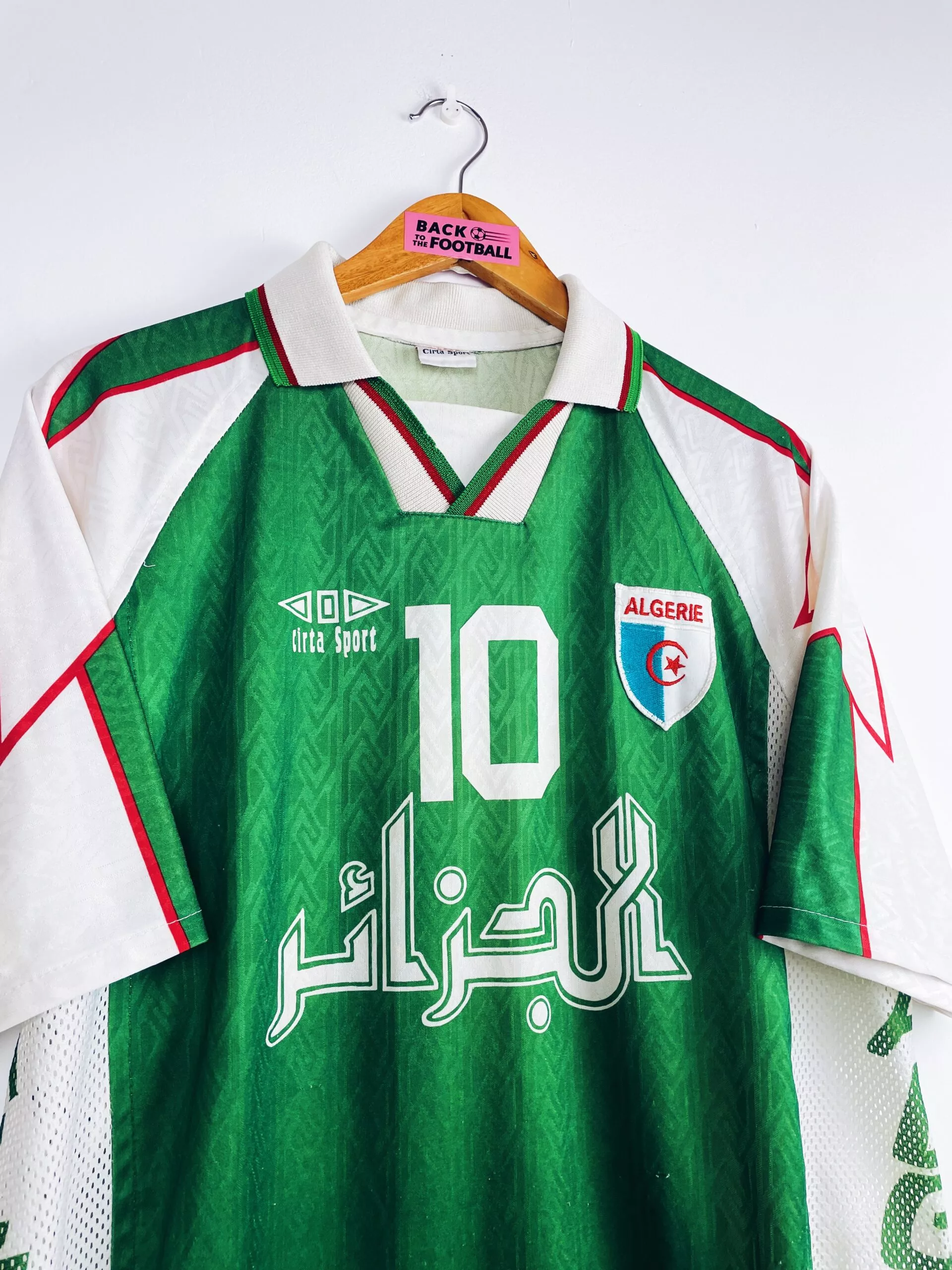 Taille : L Largeur : 56cm (aisselle à aisselle) Longueur : 71cm (base du col au bas) Etat : 7.5/10, très bon état mais quelques bouloches et très légères traces derrière l’épaule (voir photo) Le maillot : maillot vintage domicile de l’Algérie 1997/1998. On n’est pas sûr de l’année, si t’as plus d’infos on est preneur ! L’écusson est brodé, le logo Cirta Sport est incrusté, comme le numéro 10 et les autres éléments. Très beau maillot rétro de l’Algérie ! Histoire : très mauvaise année pour les algériens avec une dernière place et 3 défaites dans leur groupe de…