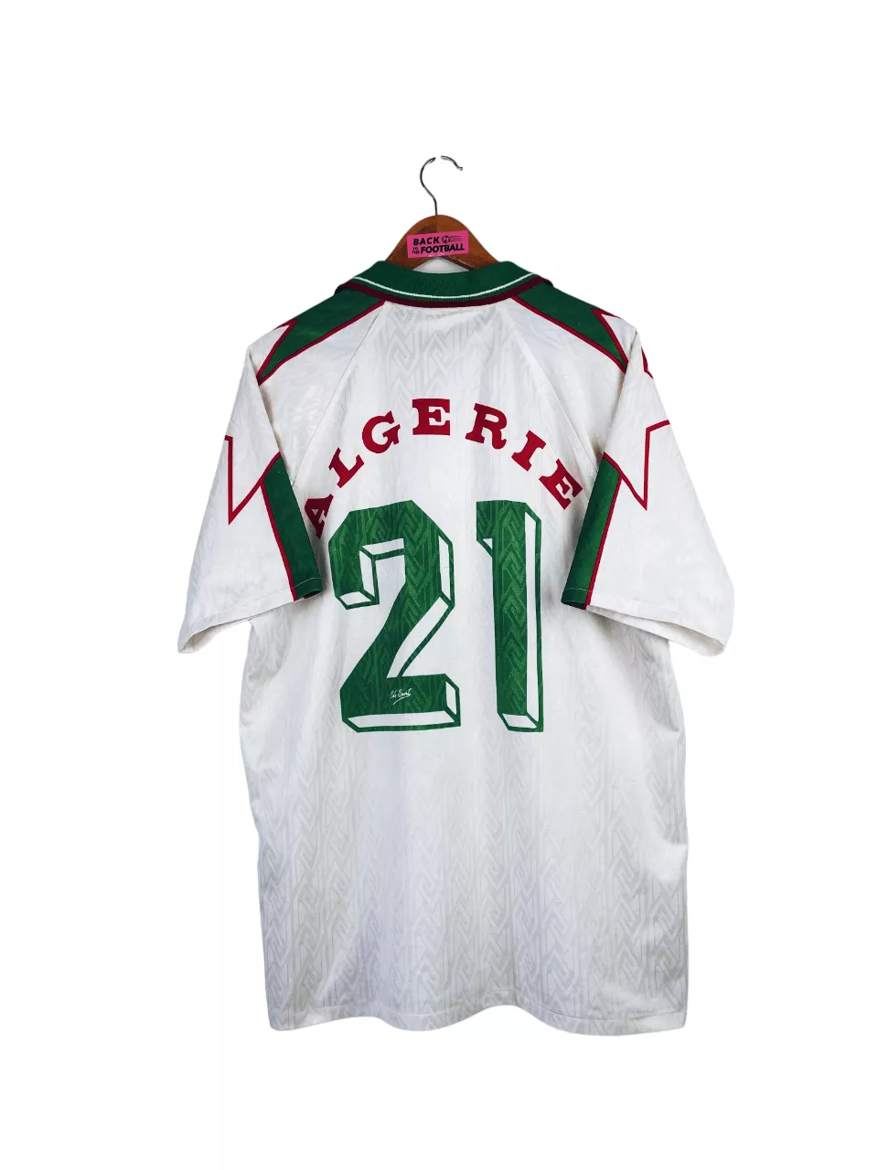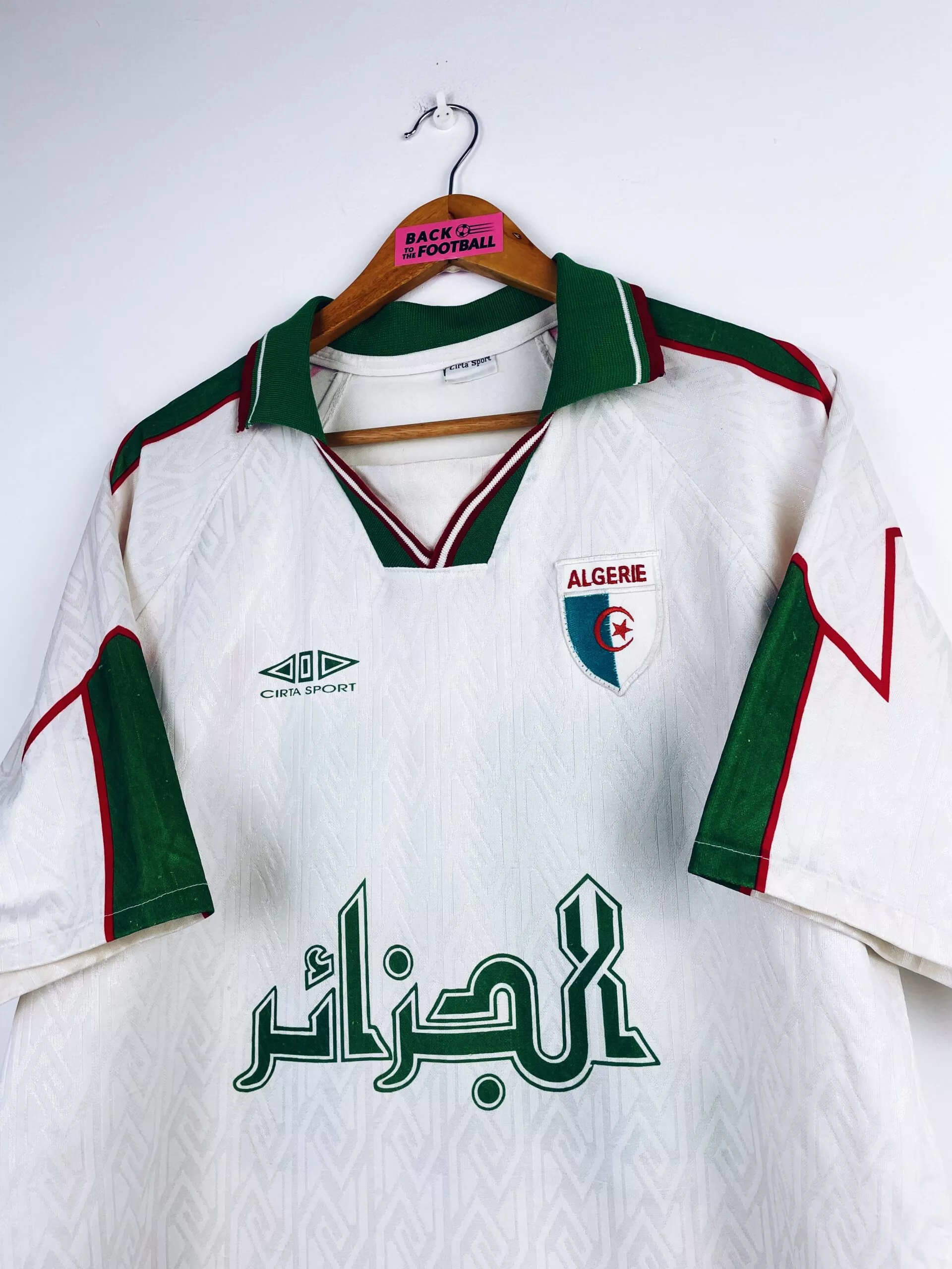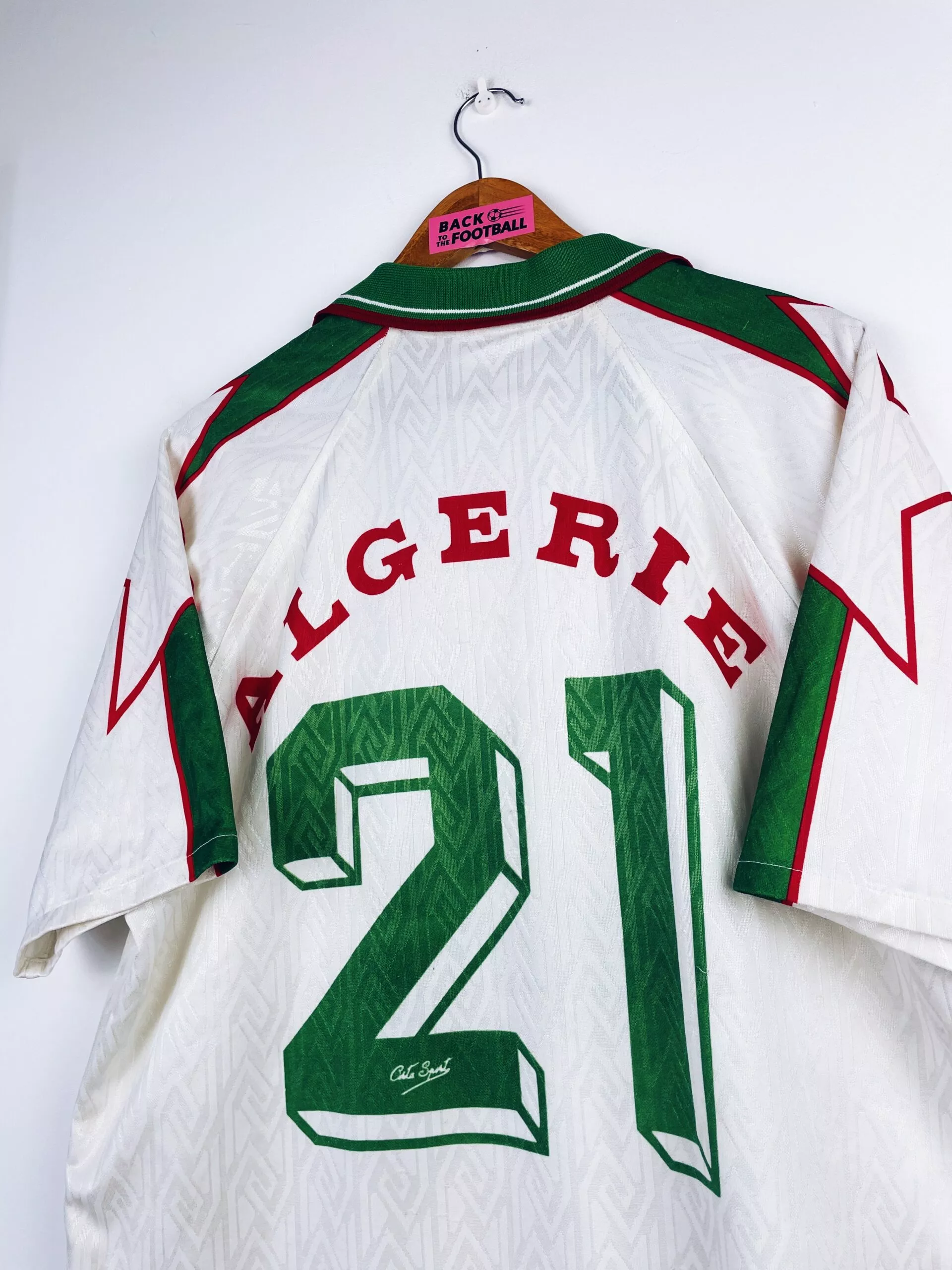 Taille : XL Largeur : 55cm (aisselle à aisselle) Longueur : 75cm (base du col au bas) Etat : 7.5/10, très bon état mais quelques bouloches et très légères traces derrière l’épaule (voir photo) Le maillot : maillot vintage domicile de l’Algérie 1997/1998 floqué du numéro 21. On n’est pas sûr de l’année, si t’as plus d’infos on est preneur ! L’écusson est brodé, le logo Cirta Sport est incrusté, comme le numéro 21 et les autres éléments. Très beau maillot rétro de l’Algérie ! Histoire : très mauvaise année pour les algériens avec une dernière place et 3 défaites…