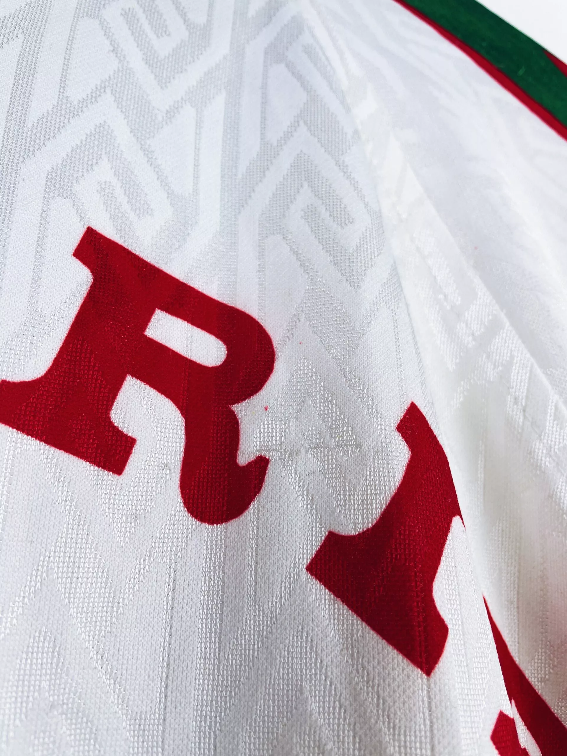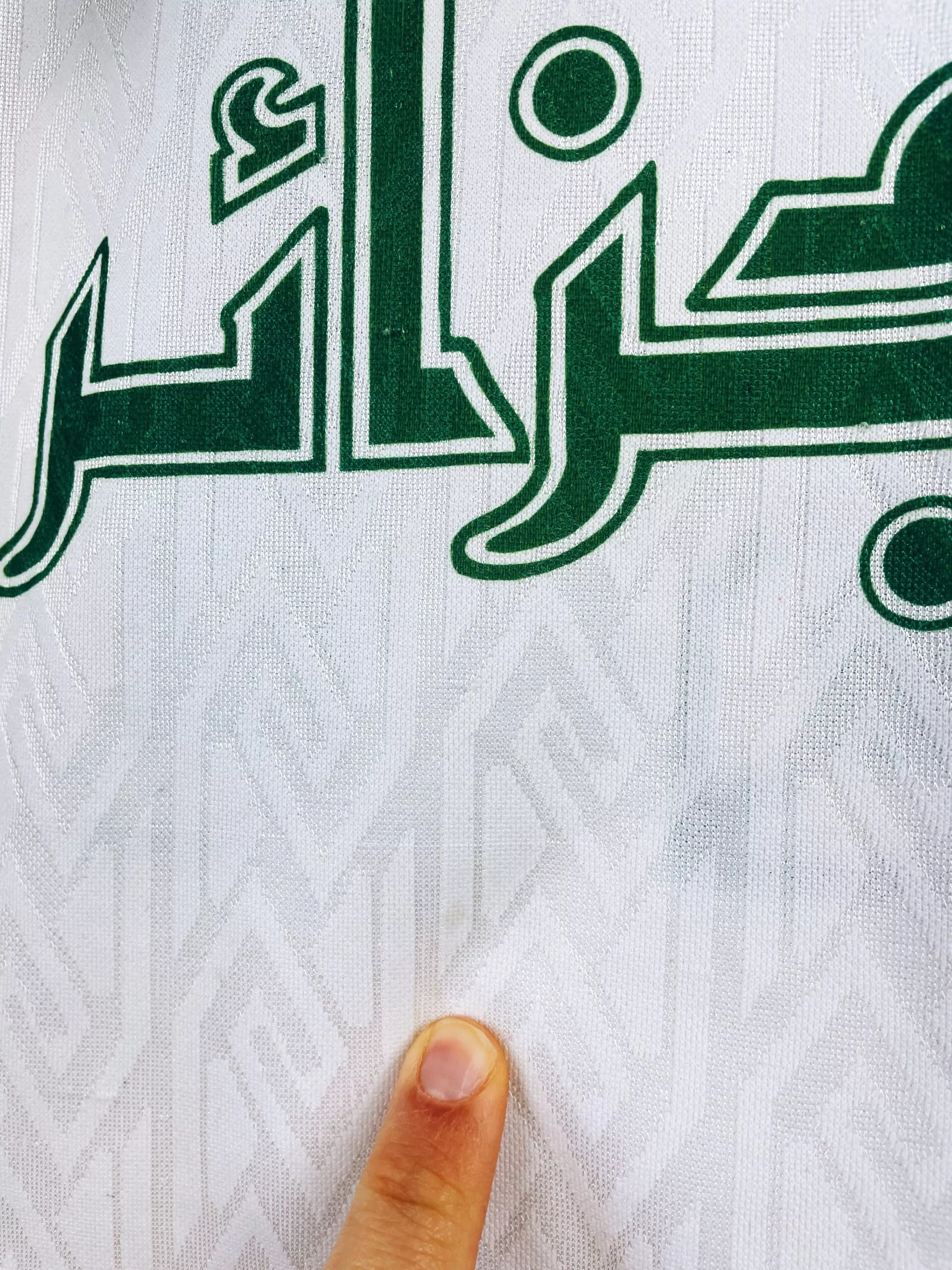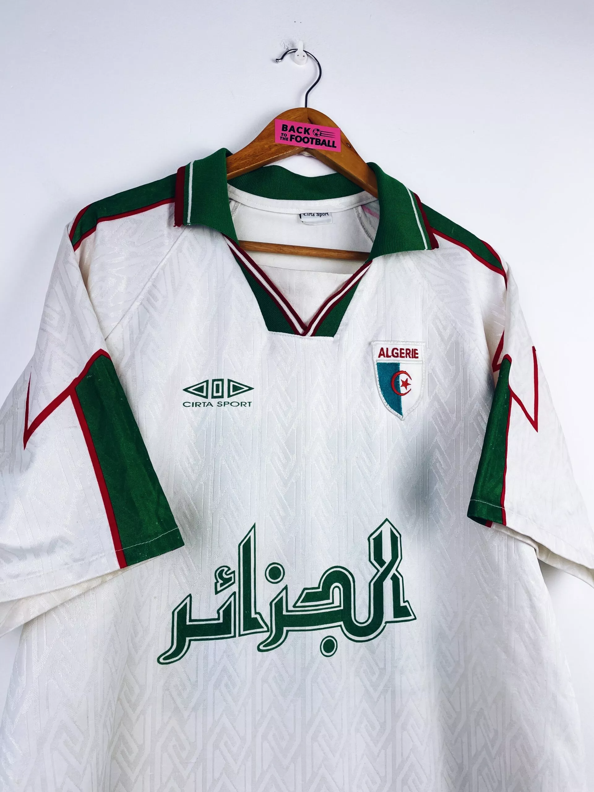 Taille : XL Largeur : 55cm (aisselle à aisselle) Longueur : 75cm (base du col au bas) Etat : 7.5/10, très bon état mais quelques bouloches et très légères traces derrière l’épaule (voir photo) Le maillot : maillot vintage domicile de l’Algérie 1997/1998 floqué du numéro 21. On n’est pas sûr de l’année, si t’as plus d’infos on est preneur ! L’écusson est brodé, le logo Cirta Sport est incrusté, comme le numéro 21 et les autres éléments. Très beau maillot rétro de l’Algérie ! Histoire : très mauvaise année pour les algériens avec une dernière place et 3 défaites…