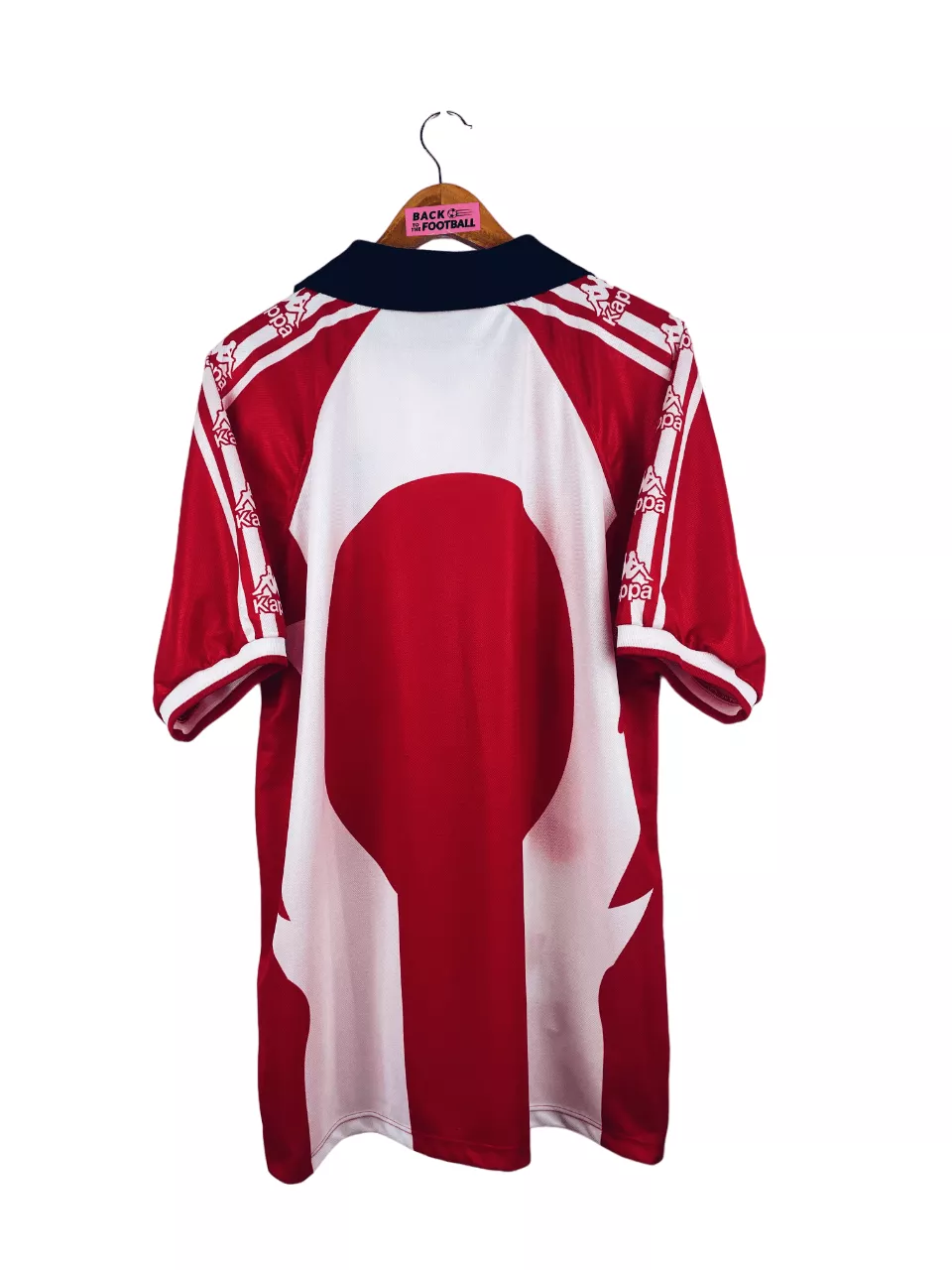 Taille : XL Si tu veux plus d’infos, tu peux nous contacter par mail ou sur les réseaux 😉 Etat : 8/10, très bon état Le maillot : maillot vintage Centenaire de l’Athletic Bilbao 1997/1998. L’écusson et le logo Kappa sont brodés. Très beau maillot rétro de l’Athletic Club ! Histoire : maillot porté uniquement contre la Roma et le Betis en matchs amicaux. Les basques terminent à la 2ème place de Liga. Ils sont éliminés en quart de Copa del Rey contre Majorque.