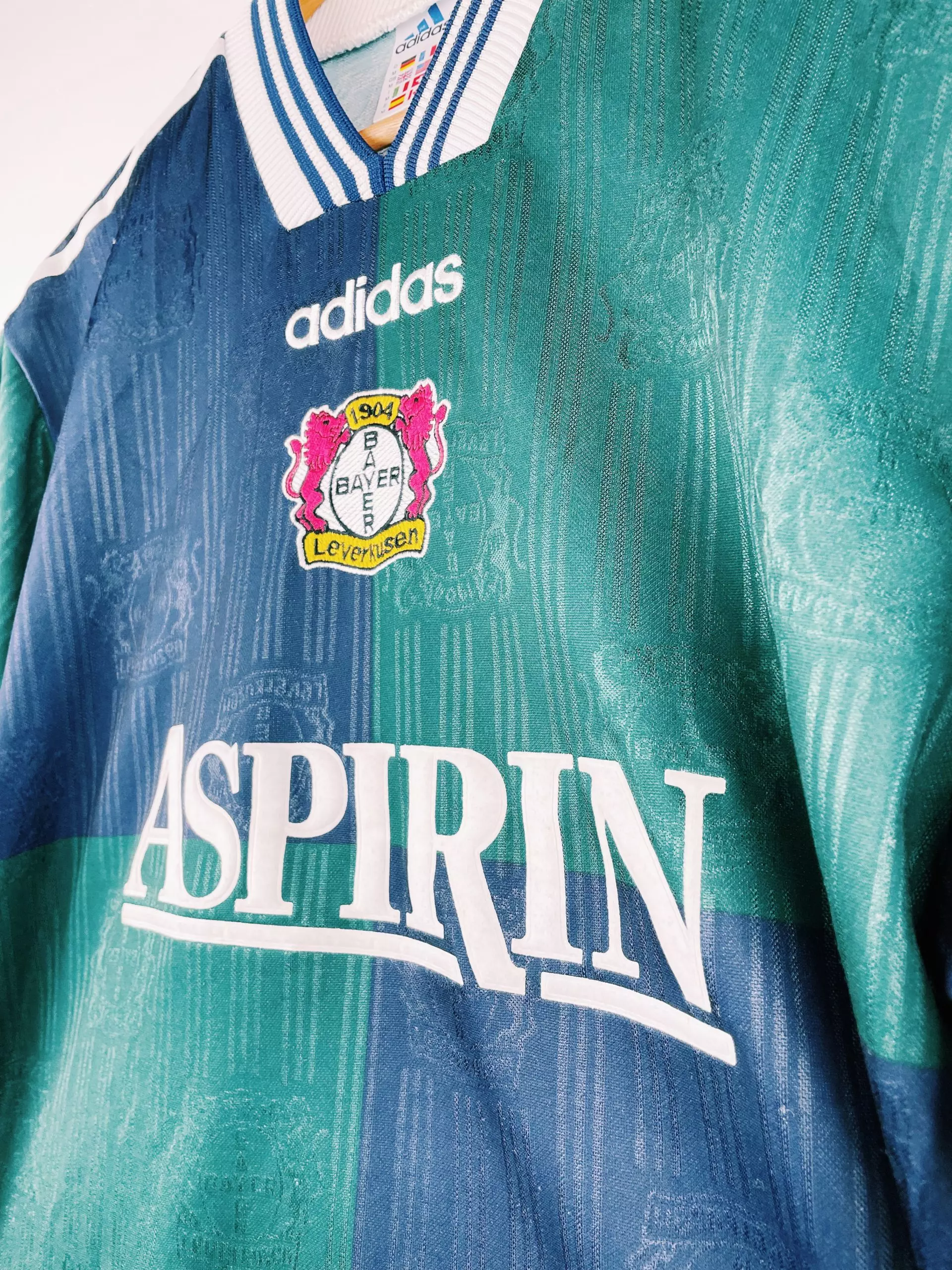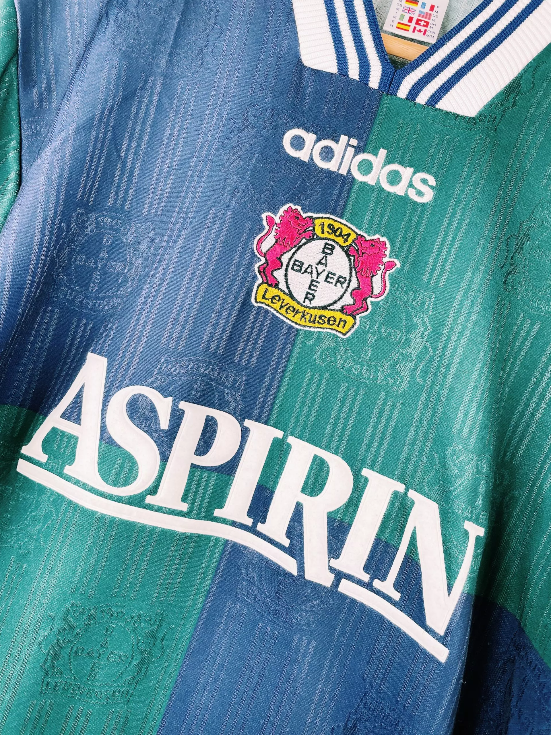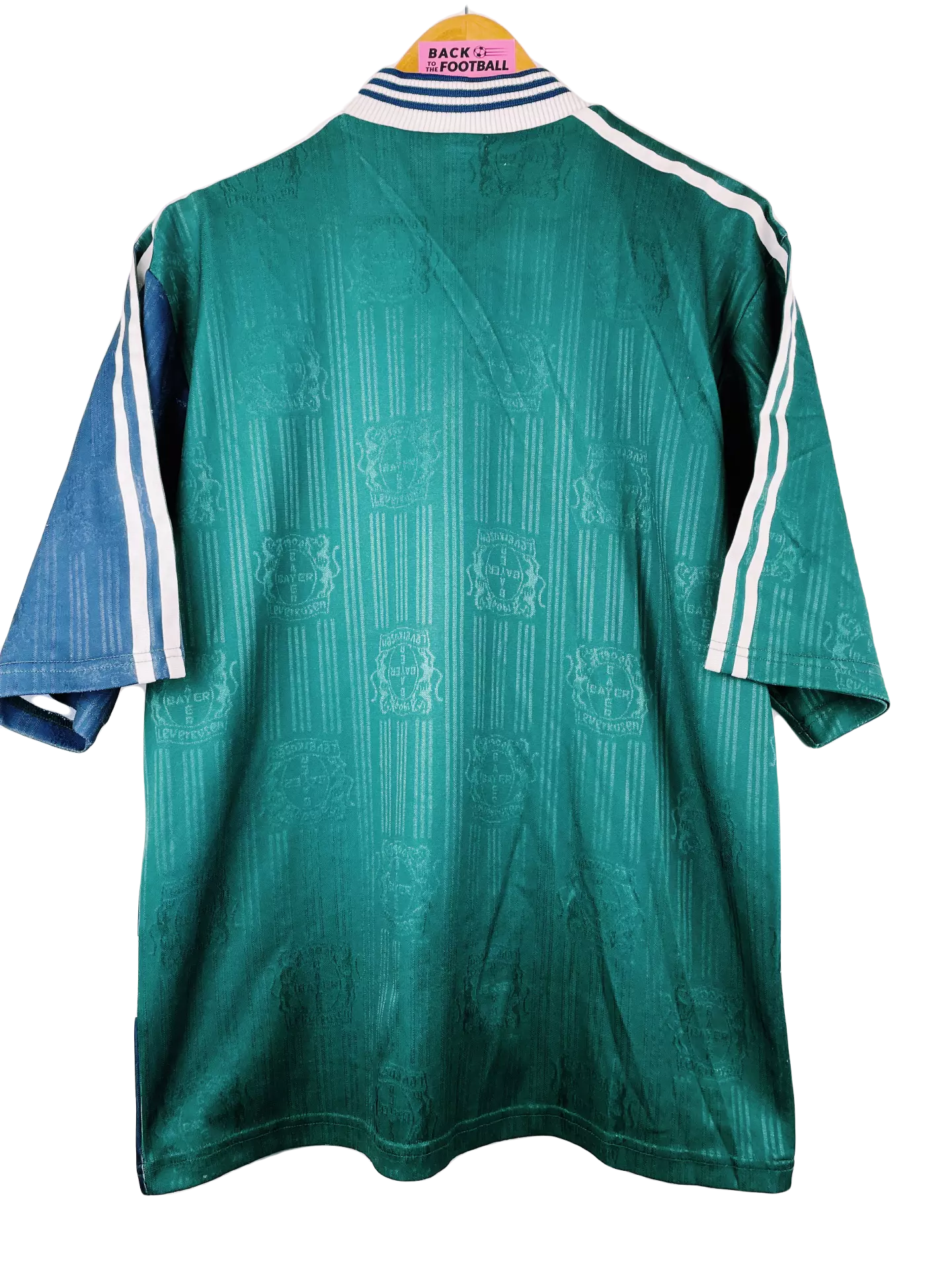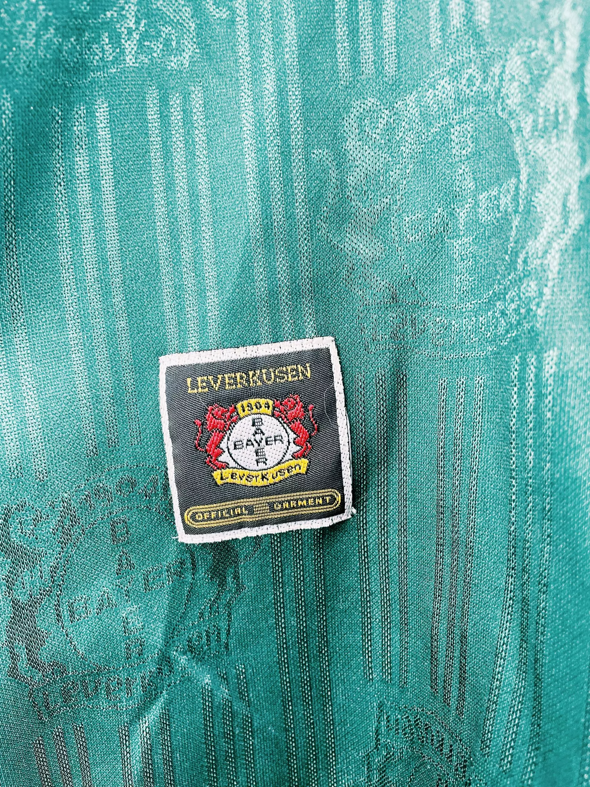 Taille : M Etat : très bon état Le maillot : maillot vintage extérieur Adidas du Bayer Leverkusen saison 1997/1998. Le maillot est magnifique avec les couleurs bleues et vertes, les bandes adidas sur les manches, l’écusson brodé et le sponsor Aspirin en feutrine. Histoire : le Bayer finira à la 3ème position en Bundesliga, derrière le FC Kaiserslautern et le Bayern Leverkusen. Ils feront un beau parcours en Ligue des Champions, éliminés en quarts contre le Real Madrid, futur vainqueur.