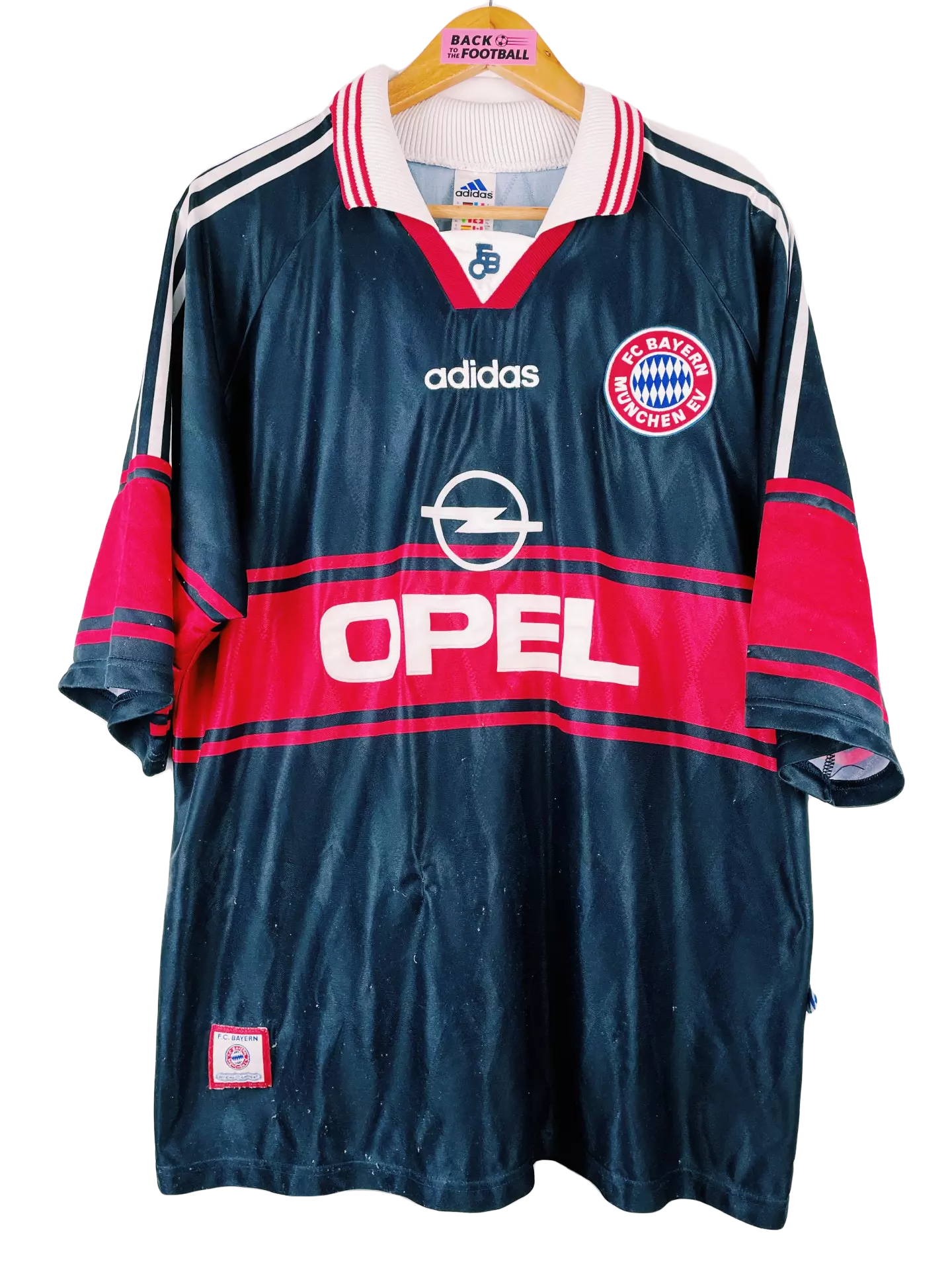 Taille : XL Etat : bon état, plusieurs bouloches Le maillot : maillot vintage domicile Adidas du Bayern Munich, saison 1997/1998. L’écusson est brodé, comme le logo Adidas, le sponsor Opel est en feutrine. Histoire : les bavarois termineront à la deuxième place en Bundesliga, derrière Kaiserslautern. Ils feront le doublé Coupe d’Allemagne / Coupe de La Ligue. Quelques joueurs : Lizarazu, Oliver Kahn, Scholl, Carsten Jancker, Giovane Élber…