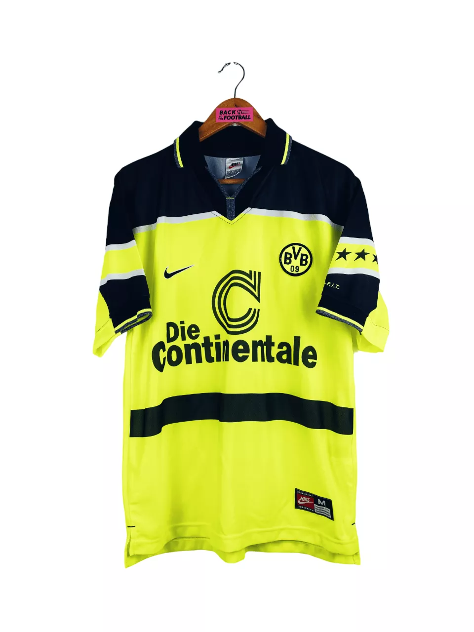 Taille : M Si tu veux plus de détails, tu peux nous contacter par mail ou sur les réseaux 😉 Etat : 8/10, très bon état, quelques légères bouloches au niveau de l’épaule Le maillot : maillot vintage domicile du Borussia Dortmund 1997/1998. L’écusson et le logo Nike sont brodés. Le sponsor Die Continentale est incrusté au maillot. Très beau maillot rétro de Dortmund ! Histoire : le BVB fera une mauvaise saison en Bundesliga avec une 10ème place. Les joueurs feront un très beau parcours en Ligue des Champions, après avoir été champions la saison passée. Après être sortis…