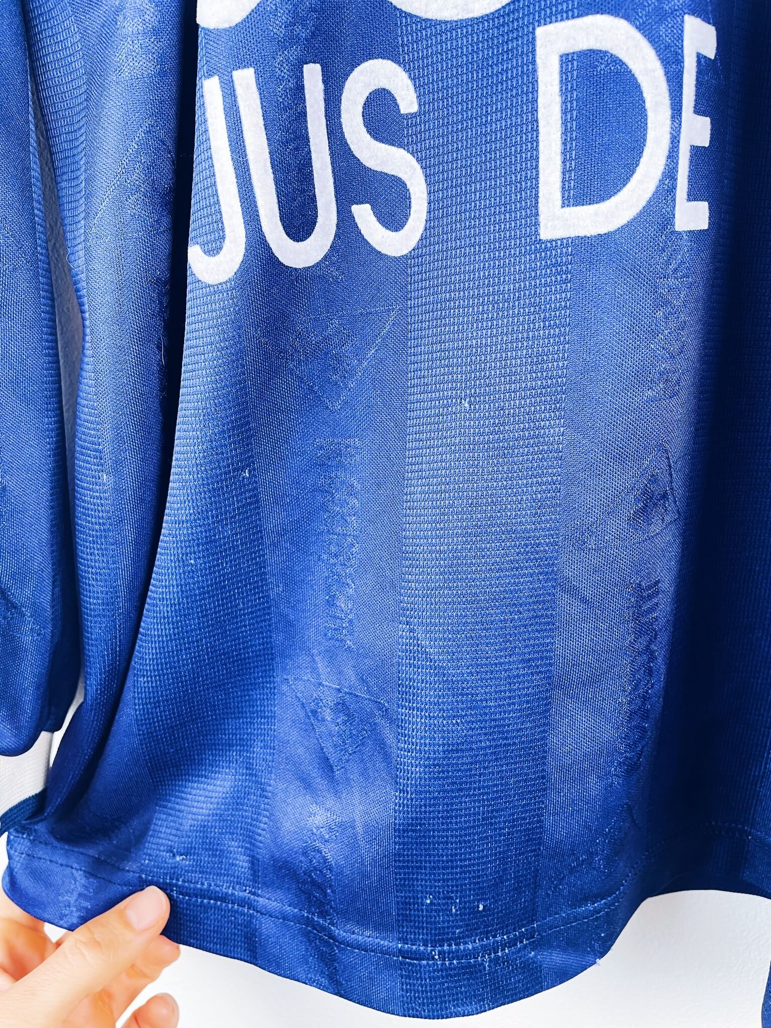 Taille : L Largeur : 56cm (aisselle à aisselle) Longueur : 72cm (base du col au bas) Si tu veux plus de détails, tu peux nous contacter par mail ou sur les réseaux 😉 Etat : 8/10, très bon état général mais une tâche sur le bout d’une manche, des accrocs dans le dos (voir photos) Le maillot : maillot vintage domicile des Girondins de Bordeaux 1997/1998 préparé (match issue) ou porté (match worn) pour le numéro 11 Wiltord : manches longues, sponsor plus grand que les maillots boutique. Tous les éléments sont en feutrine. Sûrement un maillot préparé pour…
