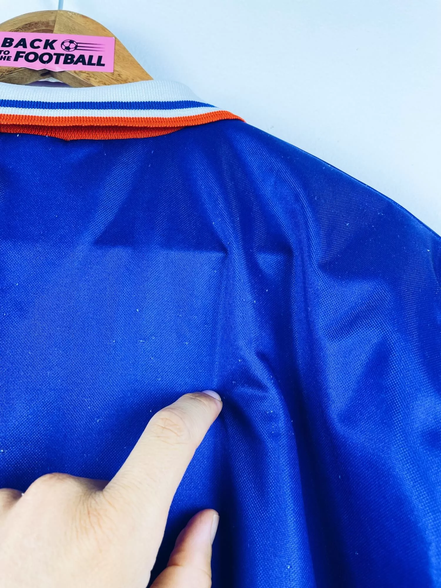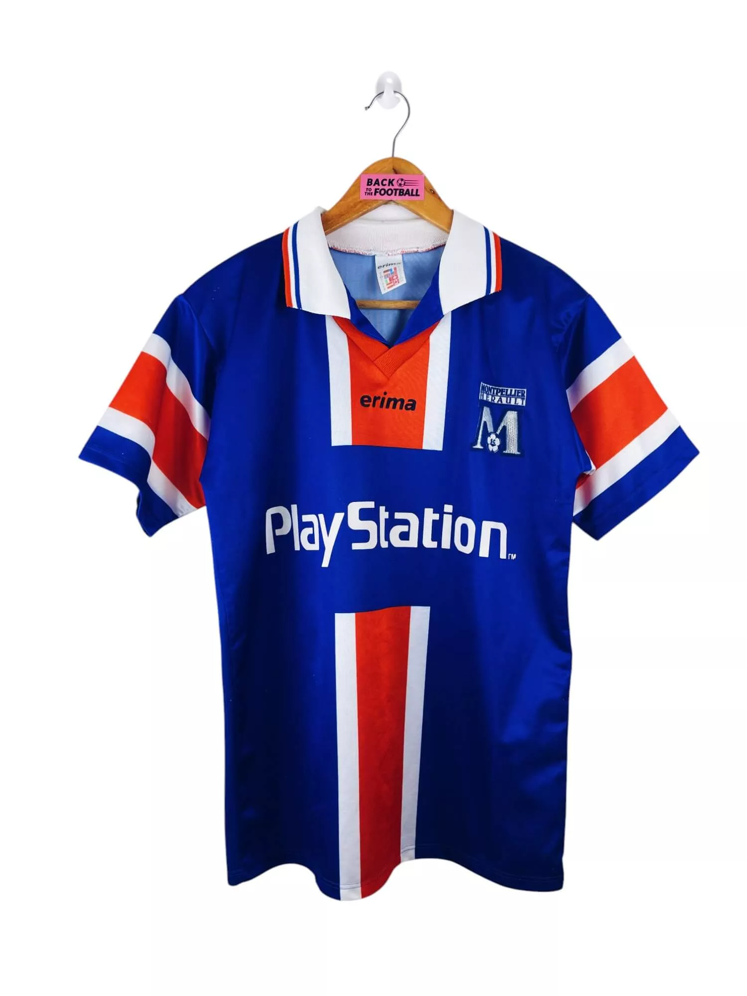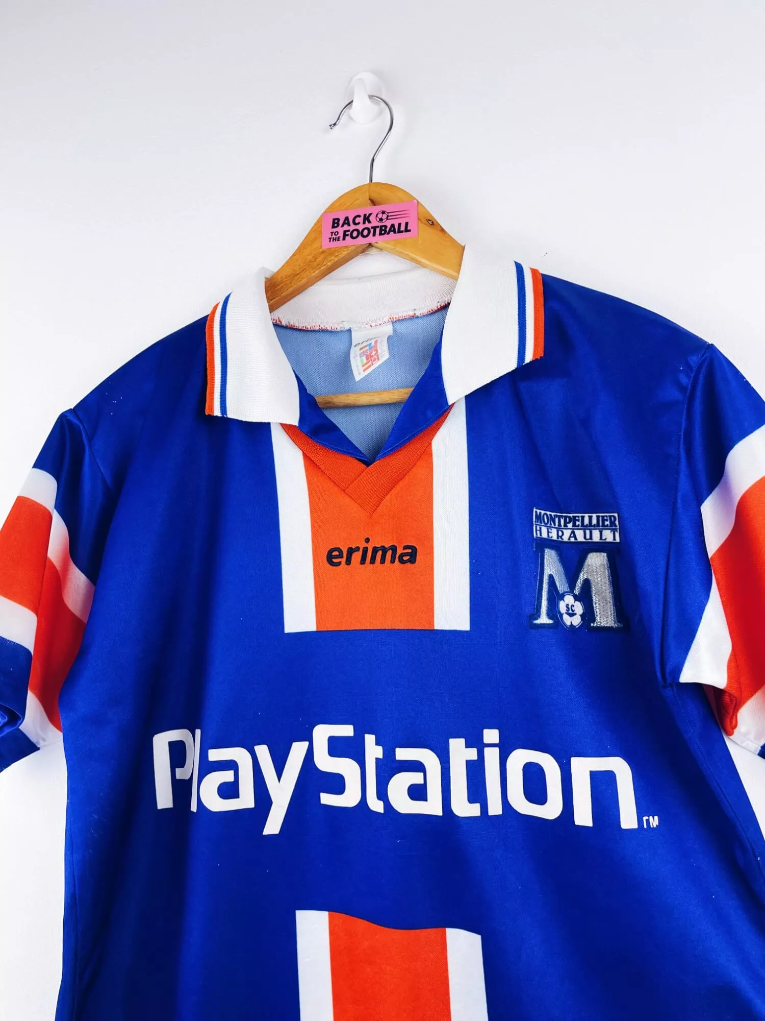 Taille : S Largeur : 50cm (aisselle à aisselle) Longueur : 70cm (base du col au bas) Si tu veux plus de détails, tu peux nous contacter par mail ou sur les réseaux 😉 Etat : 7.5/10, très bon état mais des bouloches (voir photos) Le maillot : maillot vintage de Montpellier 1997/1998 domicile. L’écusson, le logo Erima et le sponsor Playstation sont en feutrine. Très beau maillot rétro de Montpellier ! Histoire : le MHSC terminera 12ème de division 1. Ils n’iront pas très loin en coupes nationales. Bakayoko sera le meilleur buteur avec 8 réalisations. Quelques joueurs :…