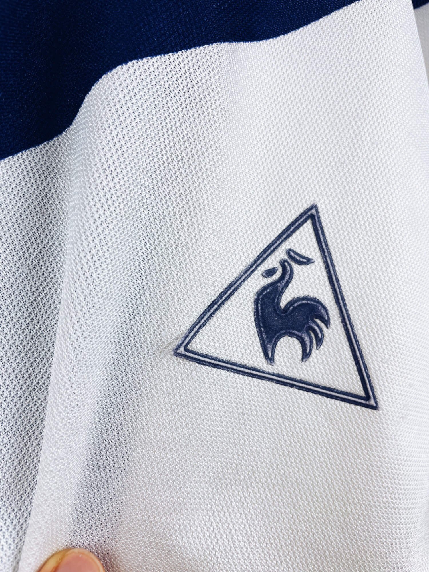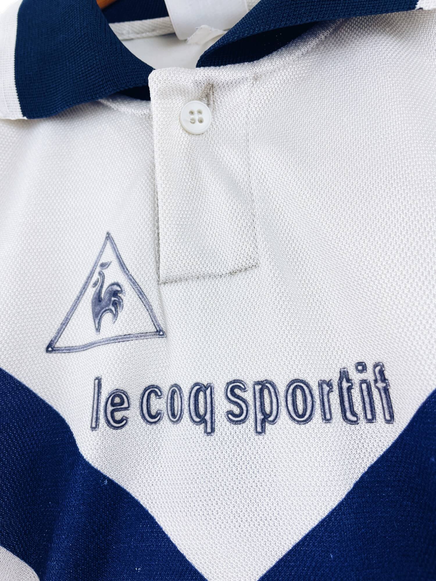 Taille : M Largeur : 52cm (aisselle à aisselle) Longueur : 70cm (base du col au bas) Si tu veux plus de détails, tu peux nous contacter par mail ou sur les réseaux 😉 Etat : 7/10, bon état général mais beaucoup de bouloches, feutrine des logos le Coq Sportif un peu abimée, le logo du Coq Sportif sur le coeur est très légèrement décollé à un angle (voir photos) Le maillot : maillot vintage extérieur des Girondins de Bordeaux 1997/1998 issu du stock pro : manches longues, pas de sponsor, numéro 12 officiel. Si tu as des infos sur…